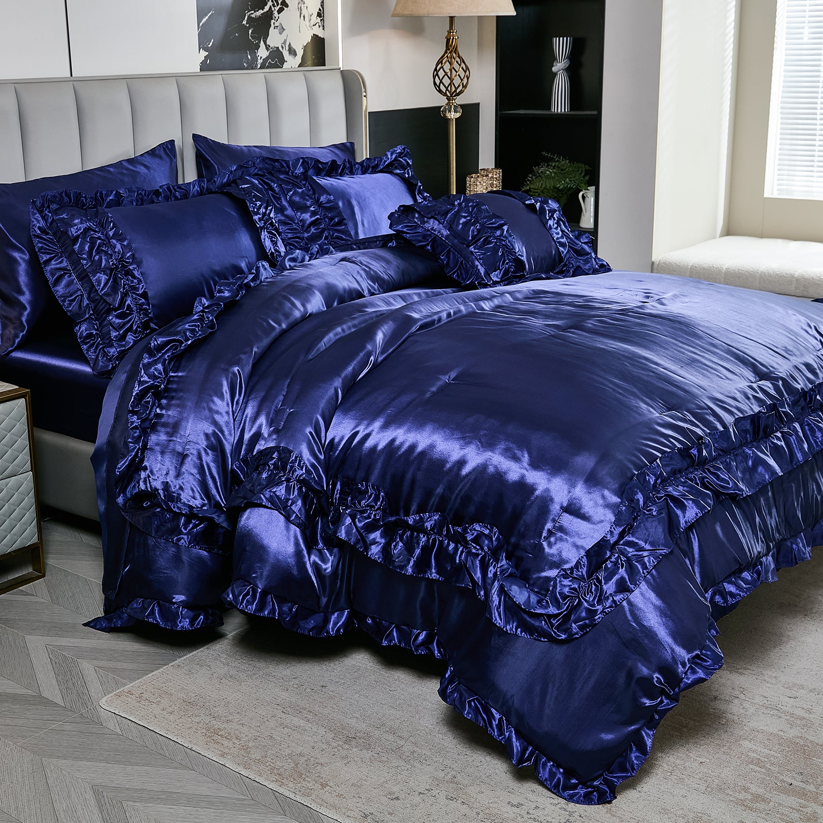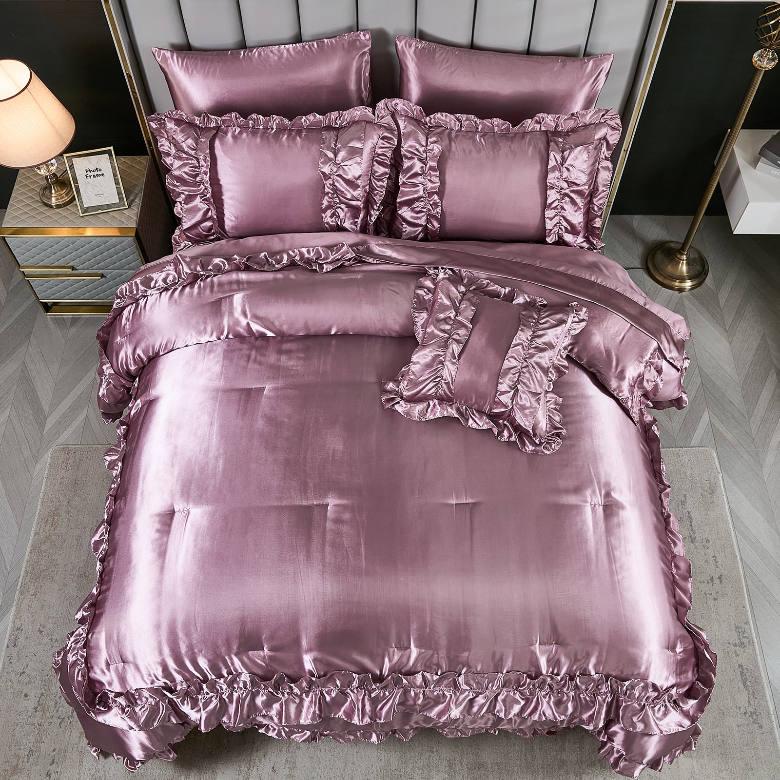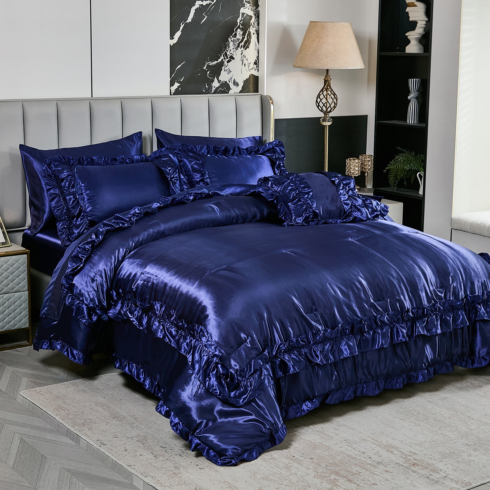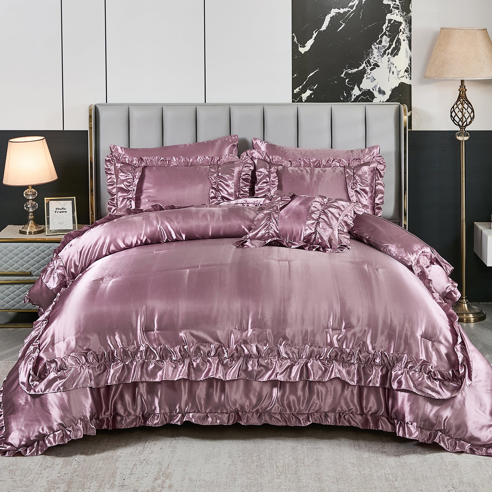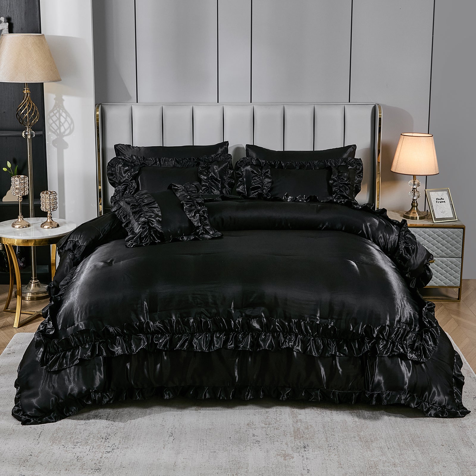 Transform your bedroom with the Satin Ruffle Comforter Set Bed in a Bag, featuring a classic waterfall ruffle design that brings romance and elegance to your space. The cascading ruffles add a princess-inspired charm, making this set perfect for farmhouse, shabby chic, or boho bedrooms.