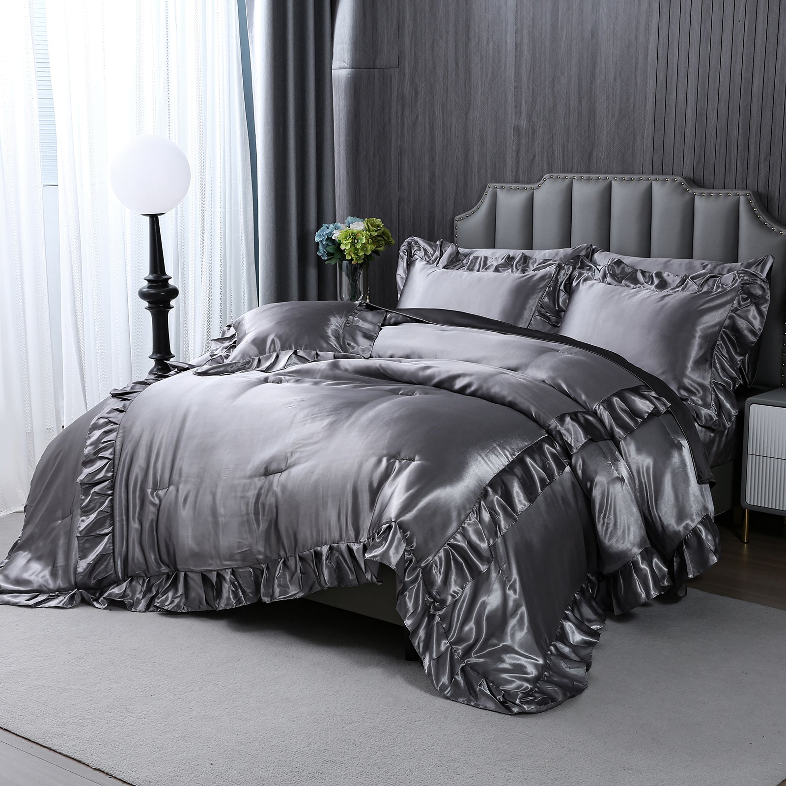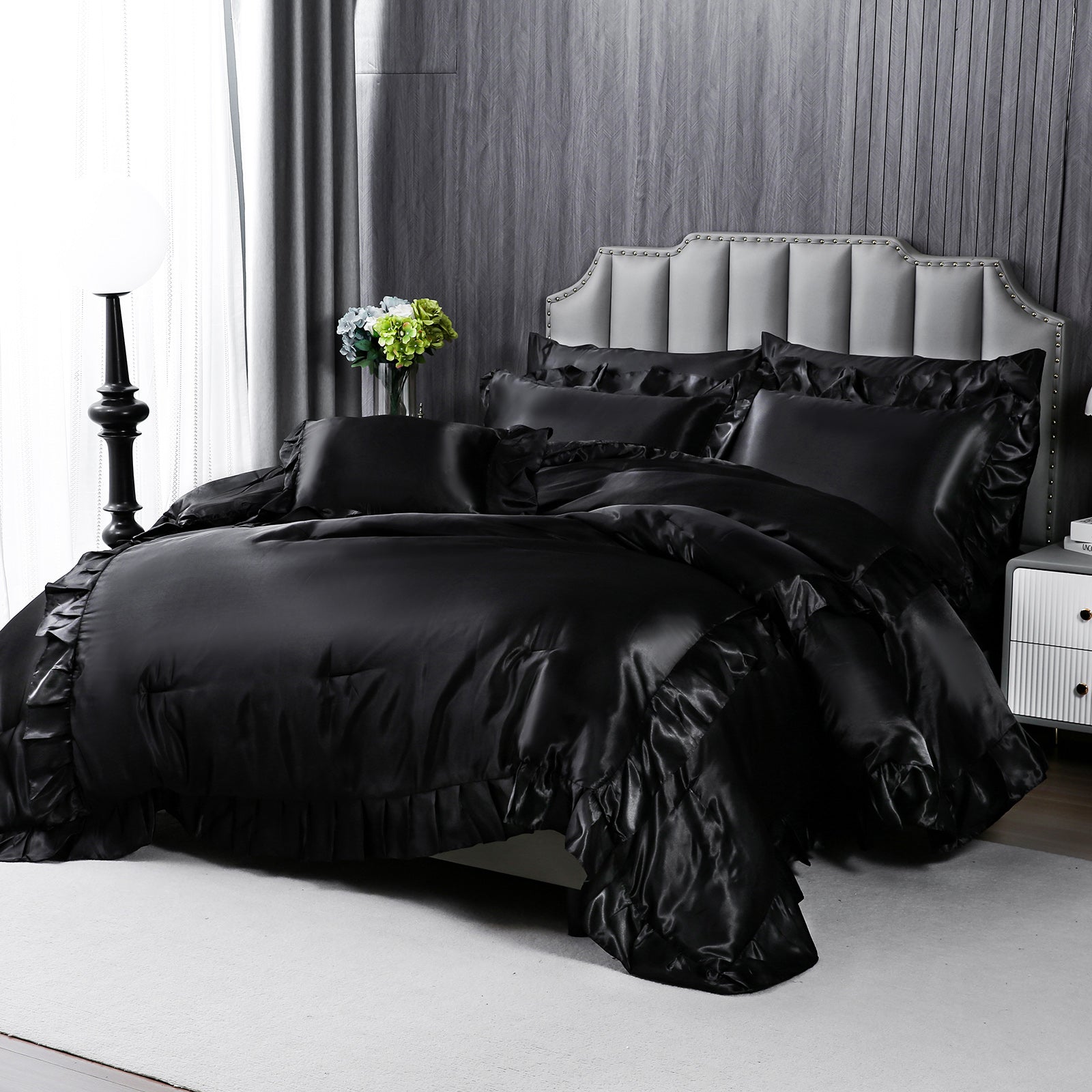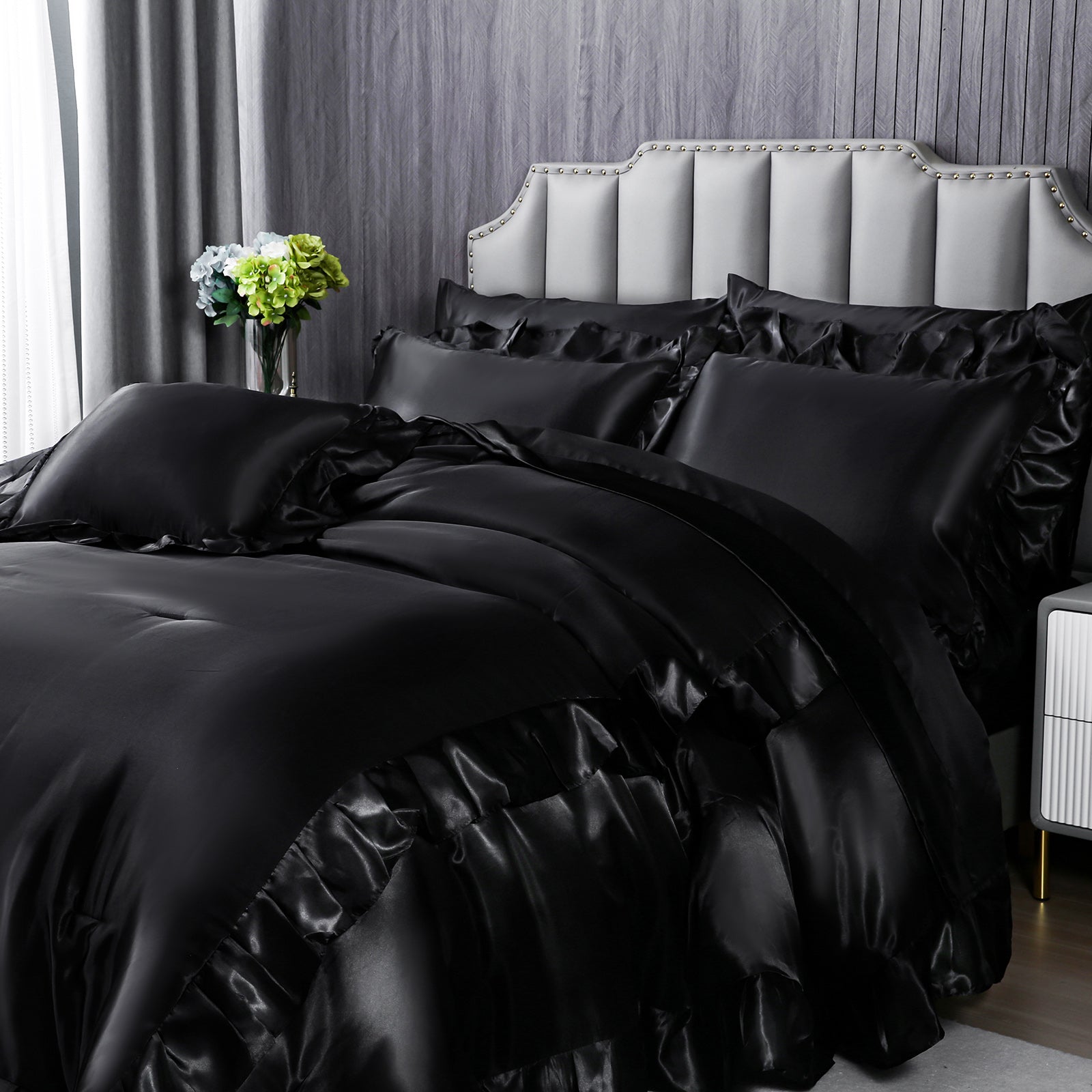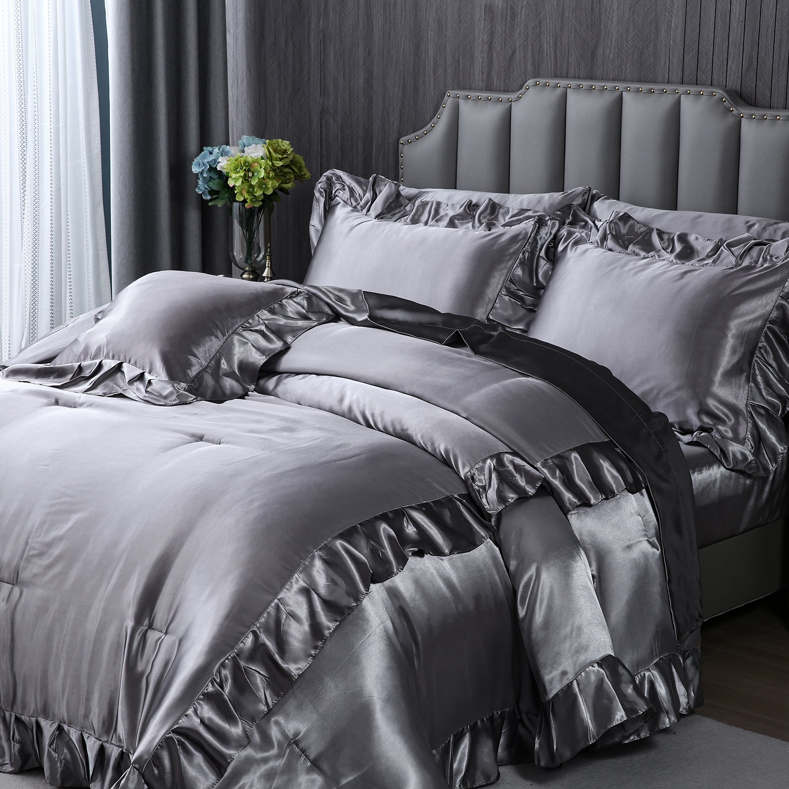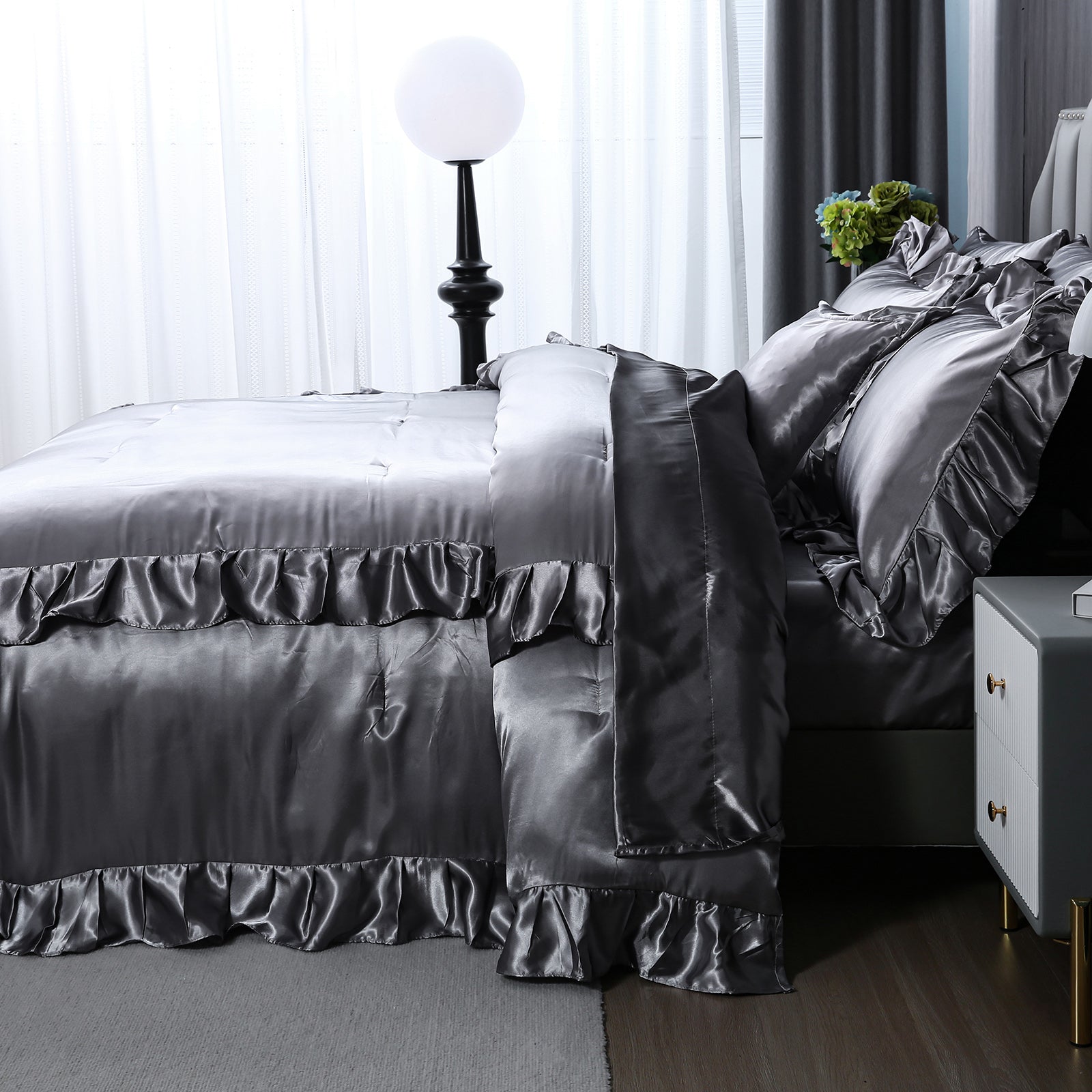 Satin Ruffle Comforter Set with Sheets – 8-Piece Bed in a Bag, Luxury Silk-Like Soft Bedding with Pillowcases & Cushion Cover, Queen/King/Full