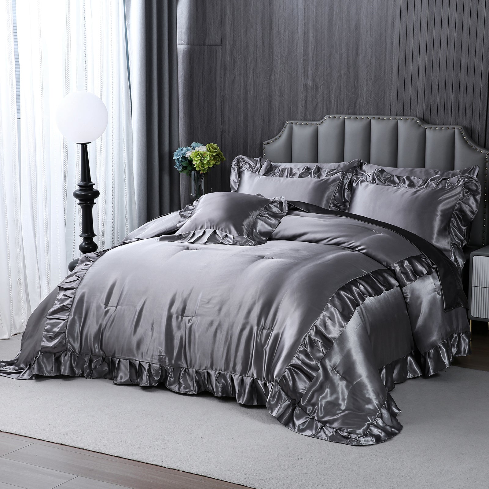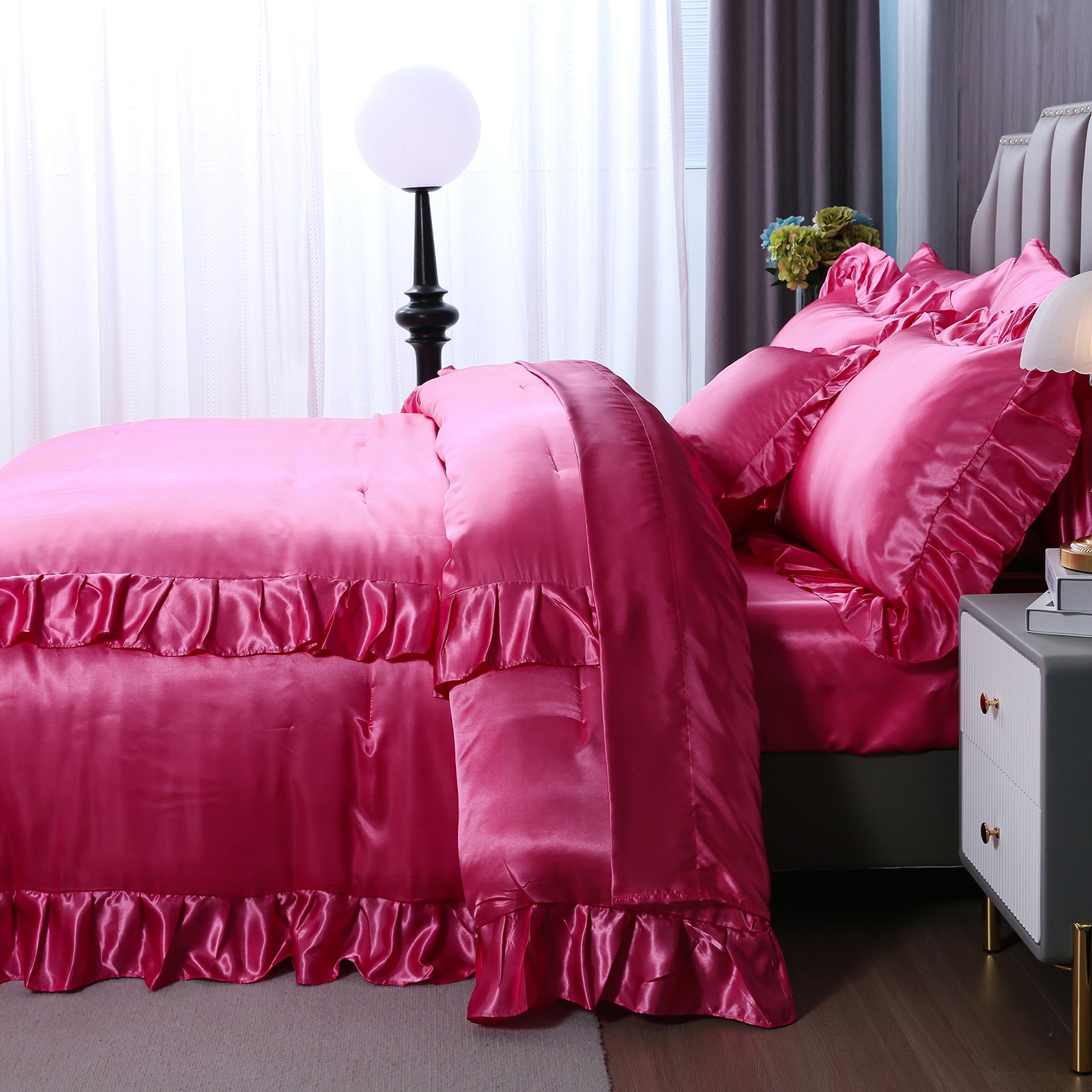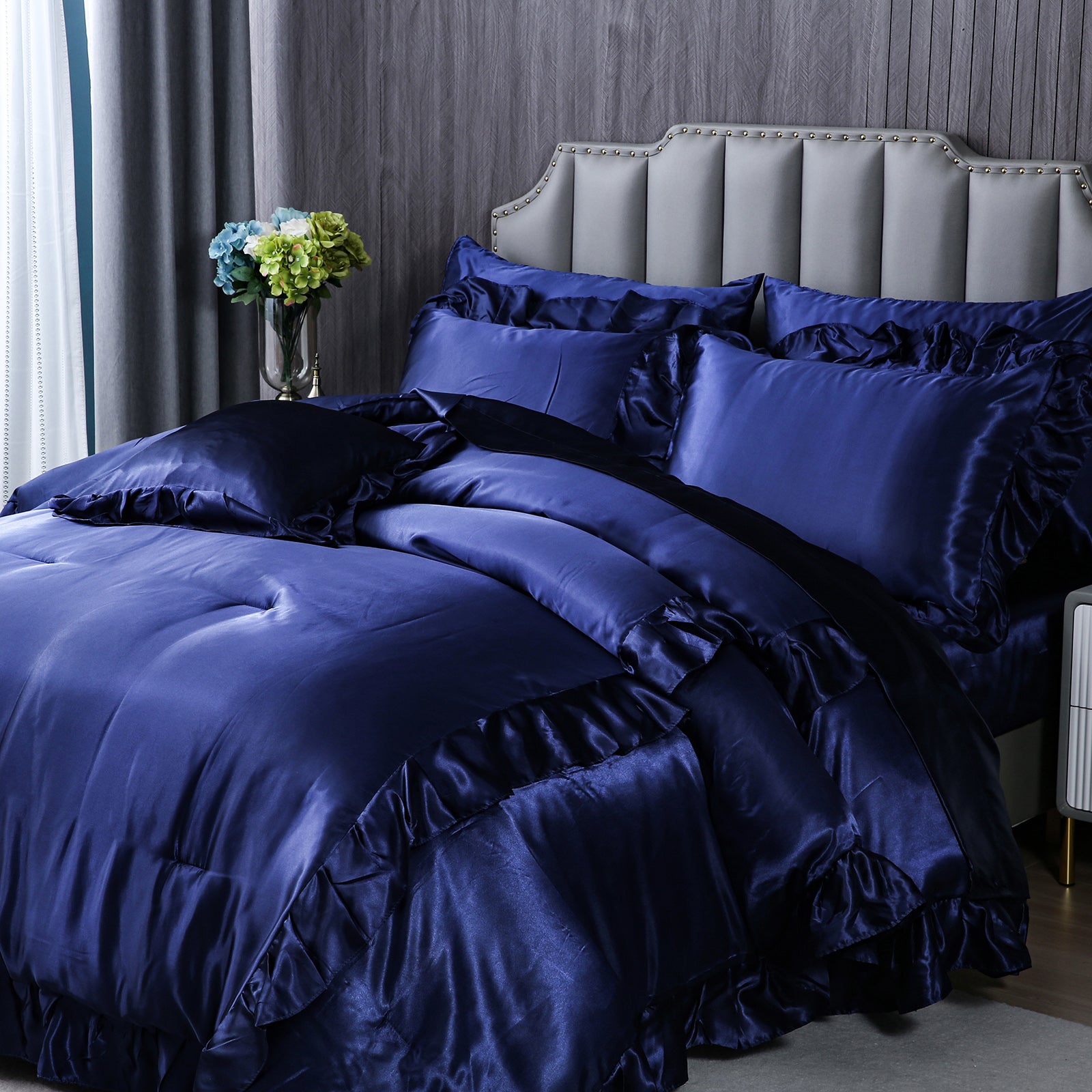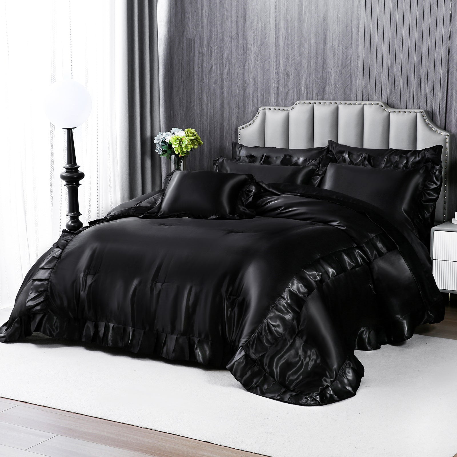 Satin Ruffle Comforter Set with Sheets – 8-Piece Bed in a Bag, Luxury Silk-Like Soft Bedding with Pillowcases & Cushion Cover, Queen/King/Full