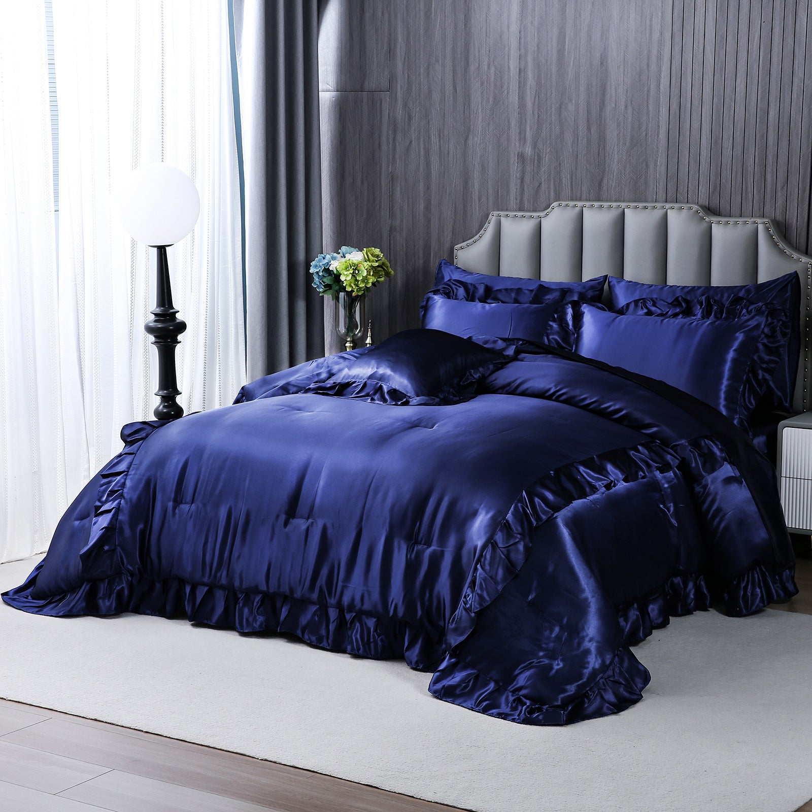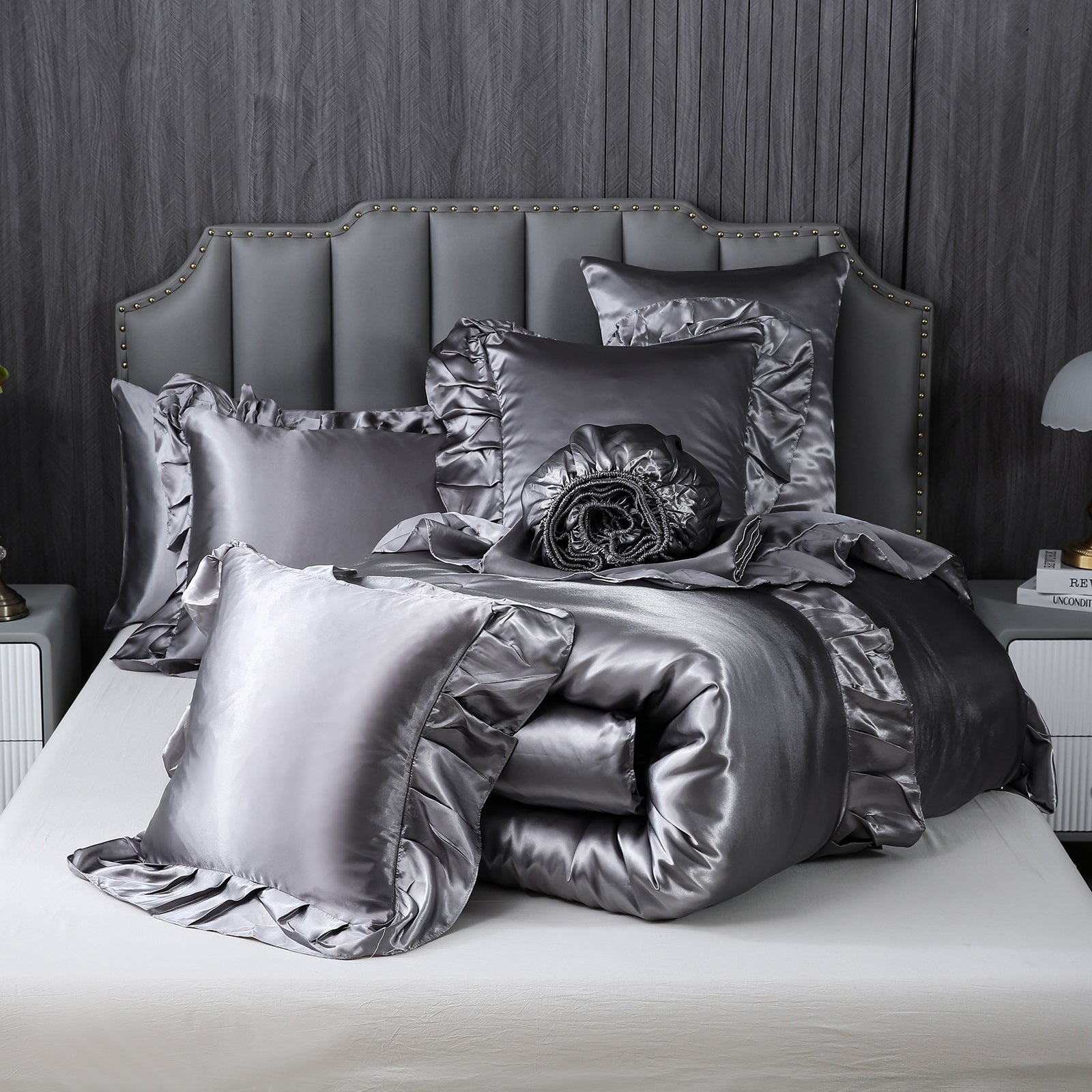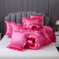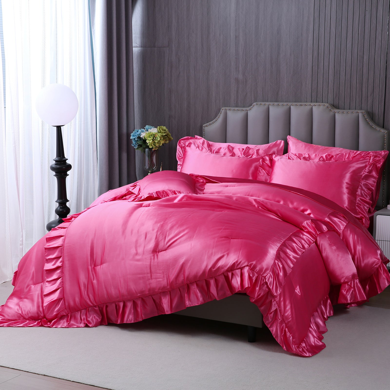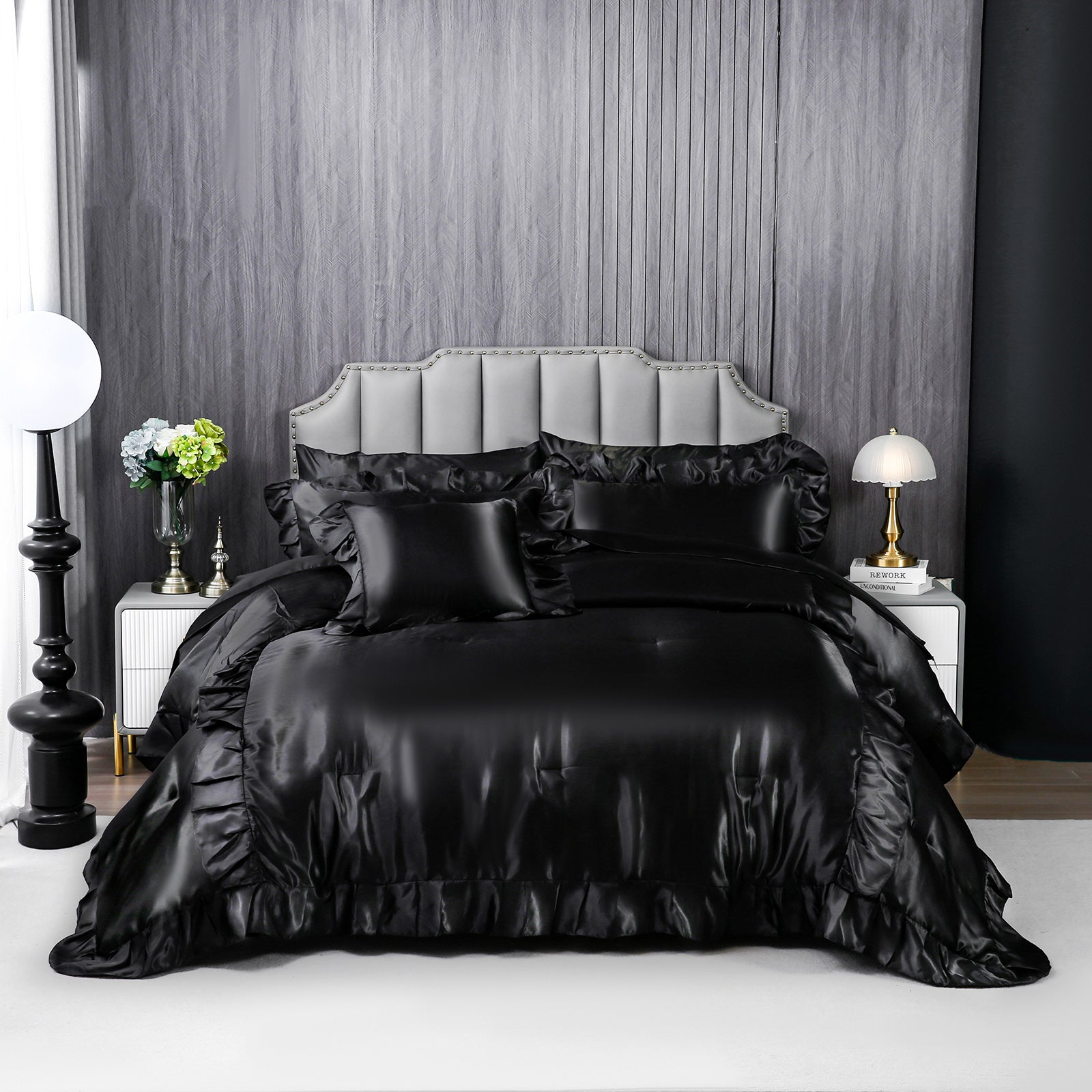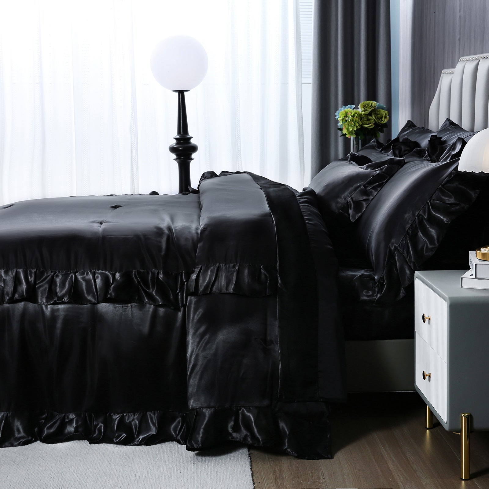 Satin Ruffle Comforter Set with Sheets – 8-Piece Bed in a Bag, Luxury Silk-Like Soft Bedding with Pillowcases & Cushion Cover, Queen/King/Full