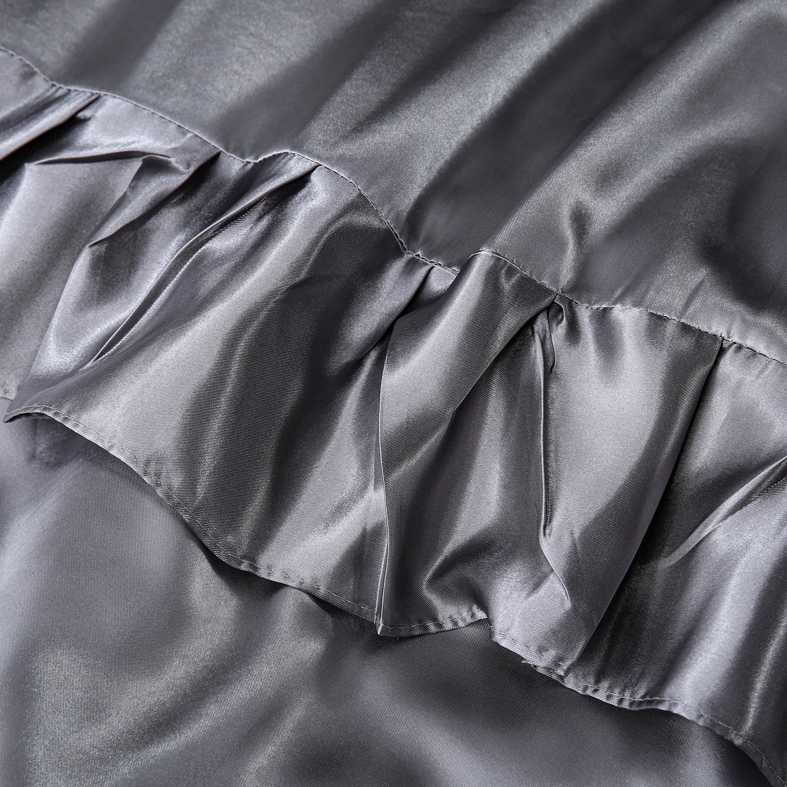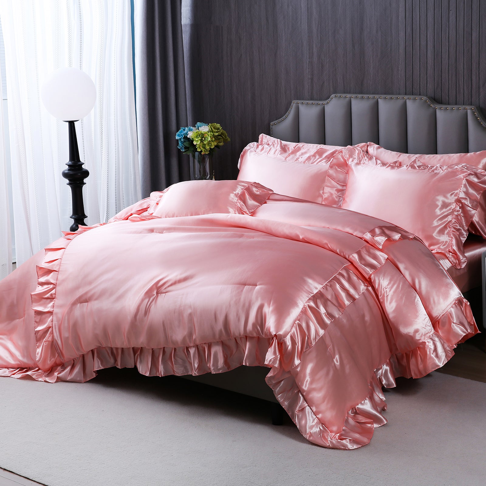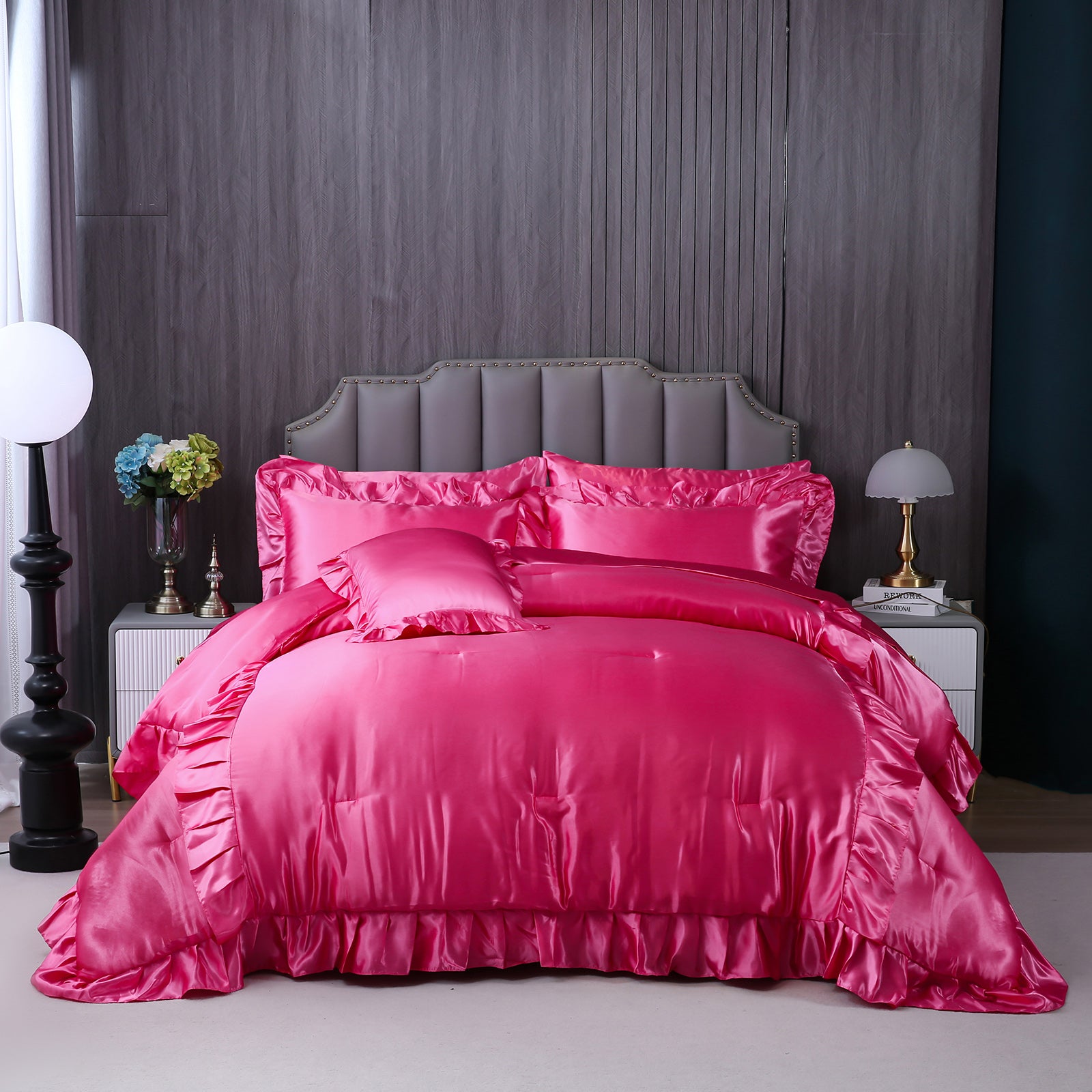 Add elegance and luxury to your bedroom with the Satin Ruffle Comforter Set with Sheets, a complete 8-piece bed in a bag designed for style and comfort. Featuring romantic four-sided ruffles and cross detailing, this bedding brings vintage charm and farmhouse chic to any room.