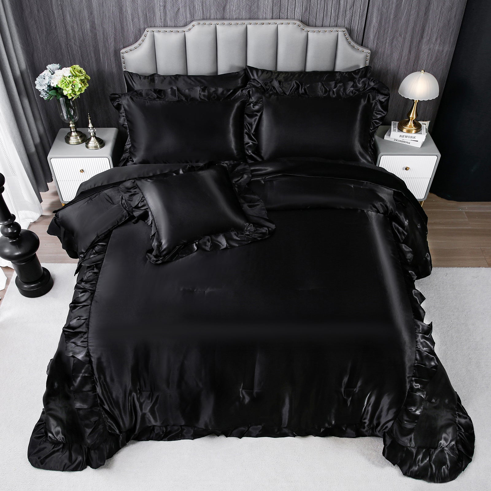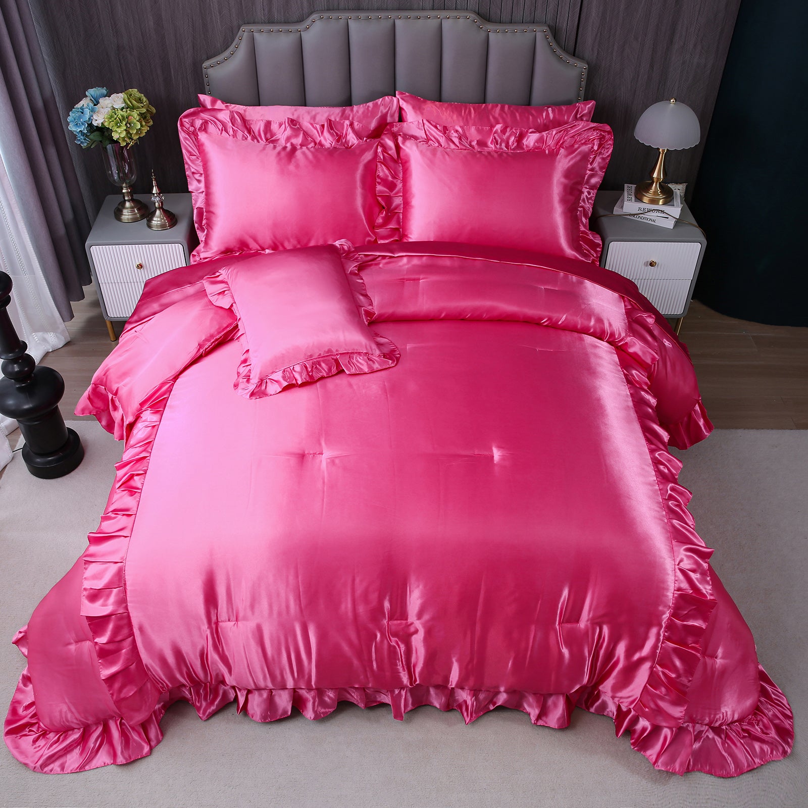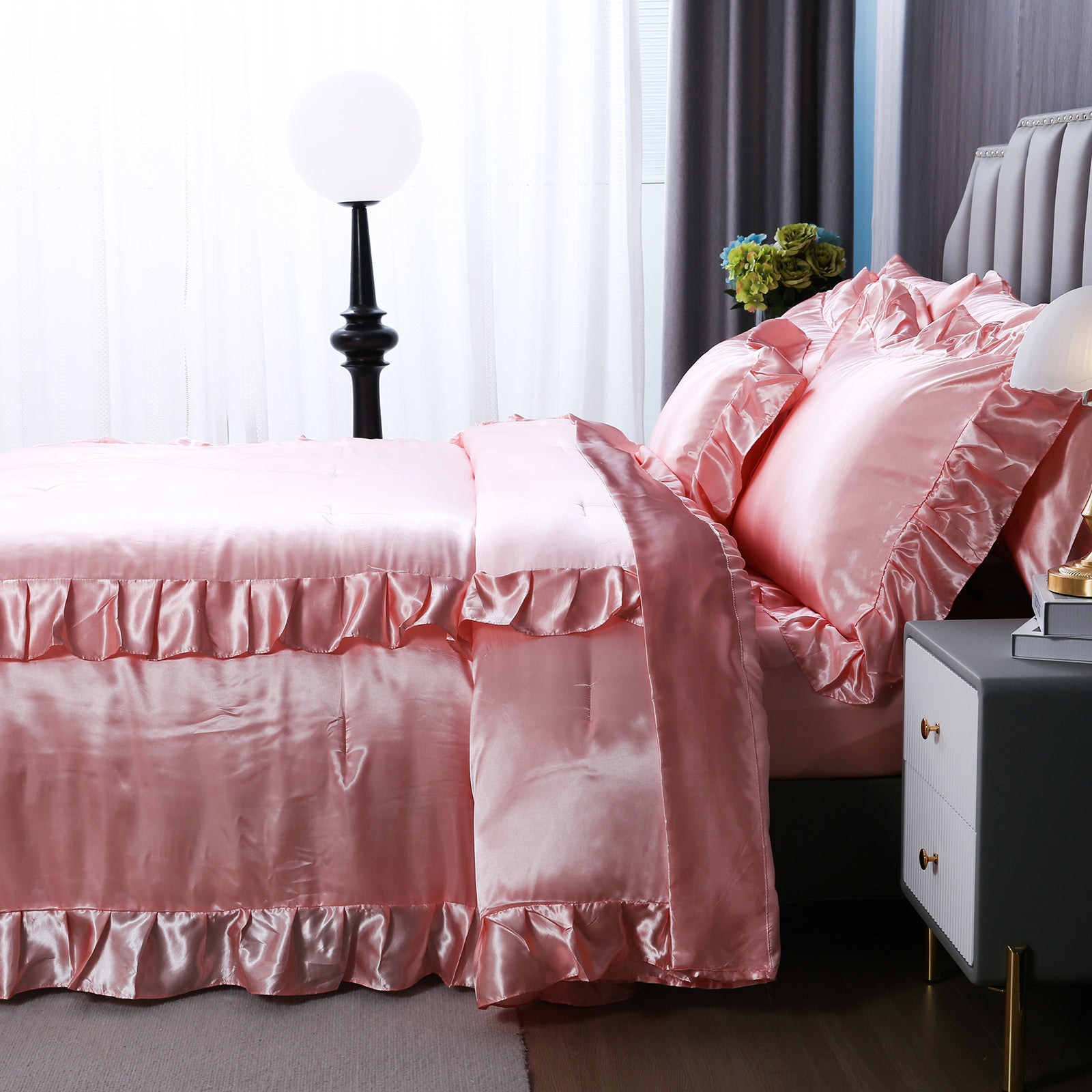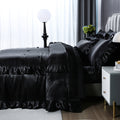 Add elegance and luxury to your bedroom with the Satin Ruffle Comforter Set with Sheets, a complete 8-piece bed in a bag designed for style and comfort. Featuring romantic four-sided ruffles and cross detailing, this bedding brings vintage charm and farmhouse chic to any room.