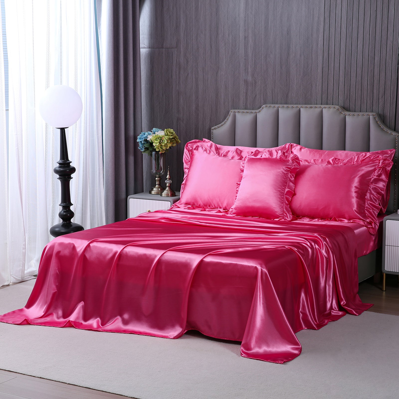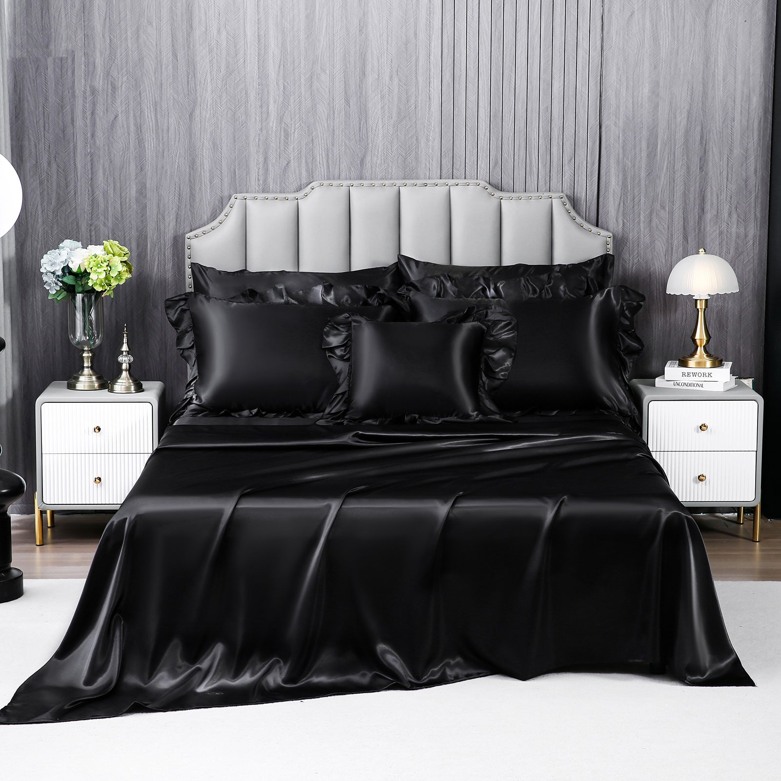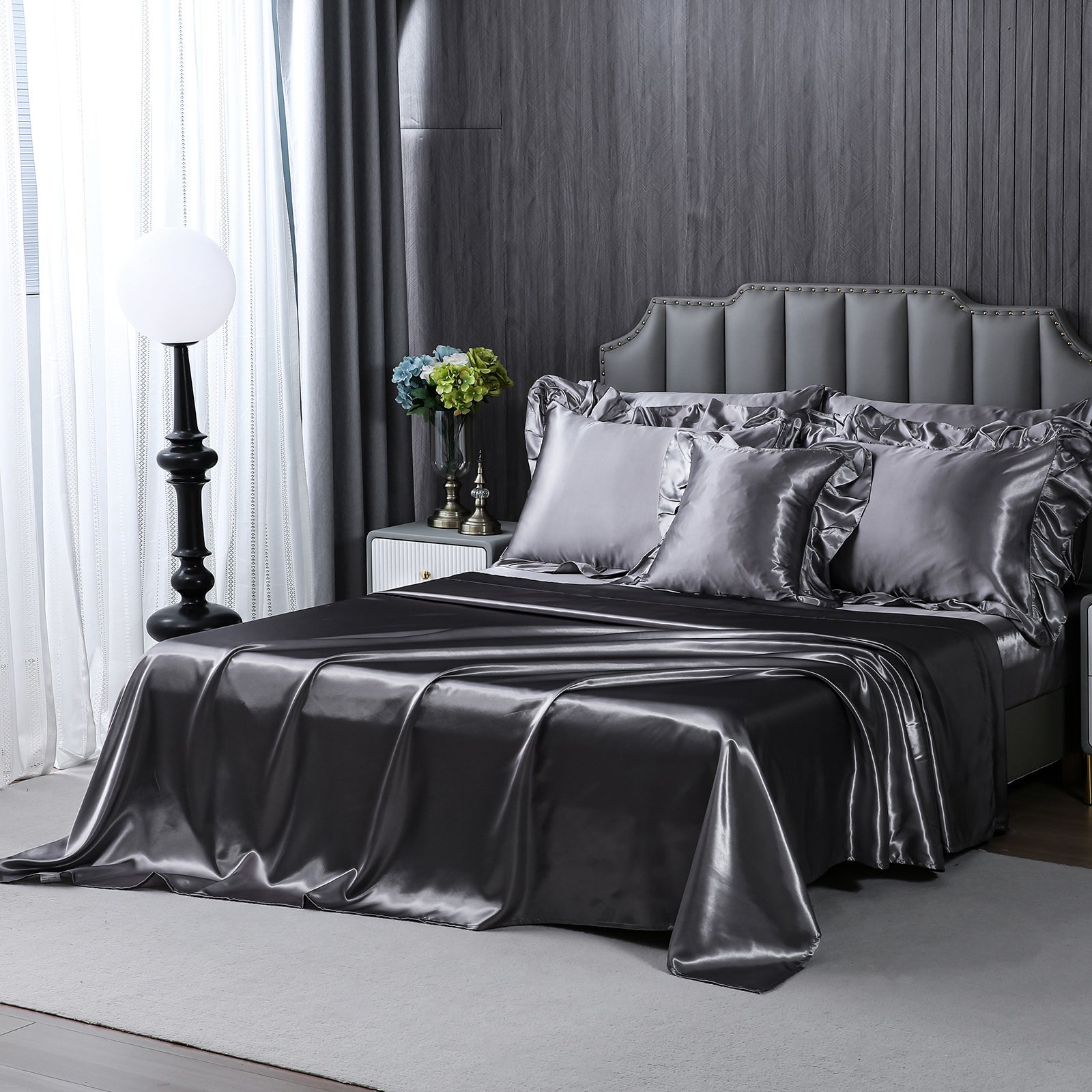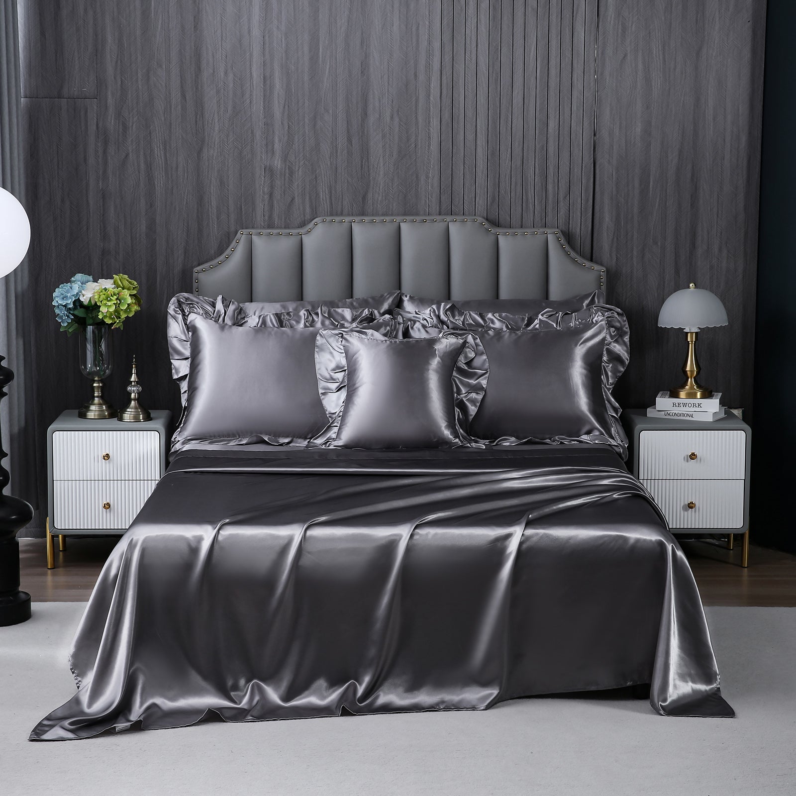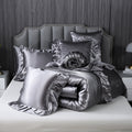 Each set includes a comforter, flat sheet, fitted sheet with a 16" pocket, 4 pillowcases, and 1 cushion cover—providing everything you need for a coordinated look. Made from silk-like satin microfiber, the bedding offers a smooth, breathable surface that feels soft and luxurious to the touch.