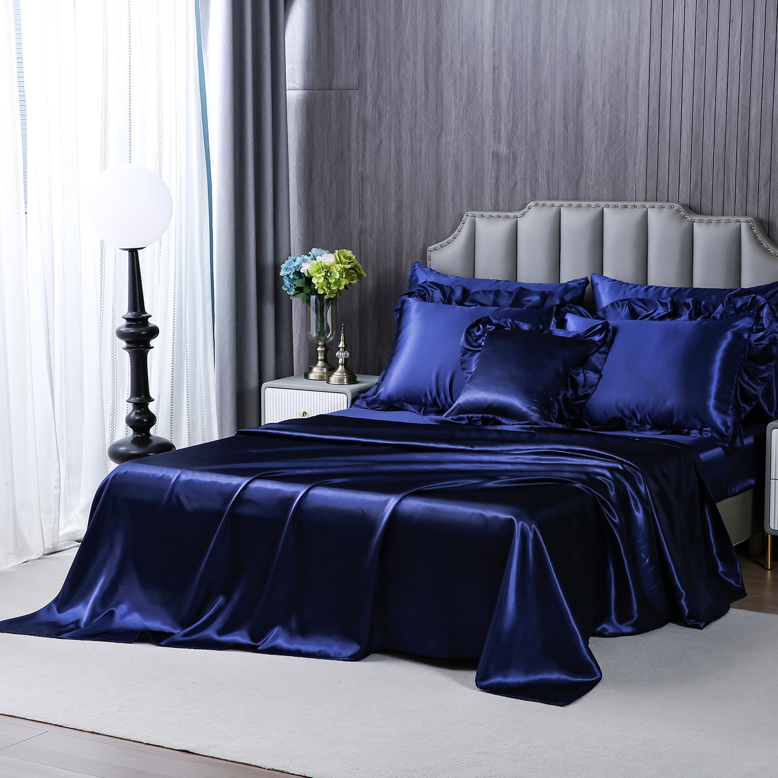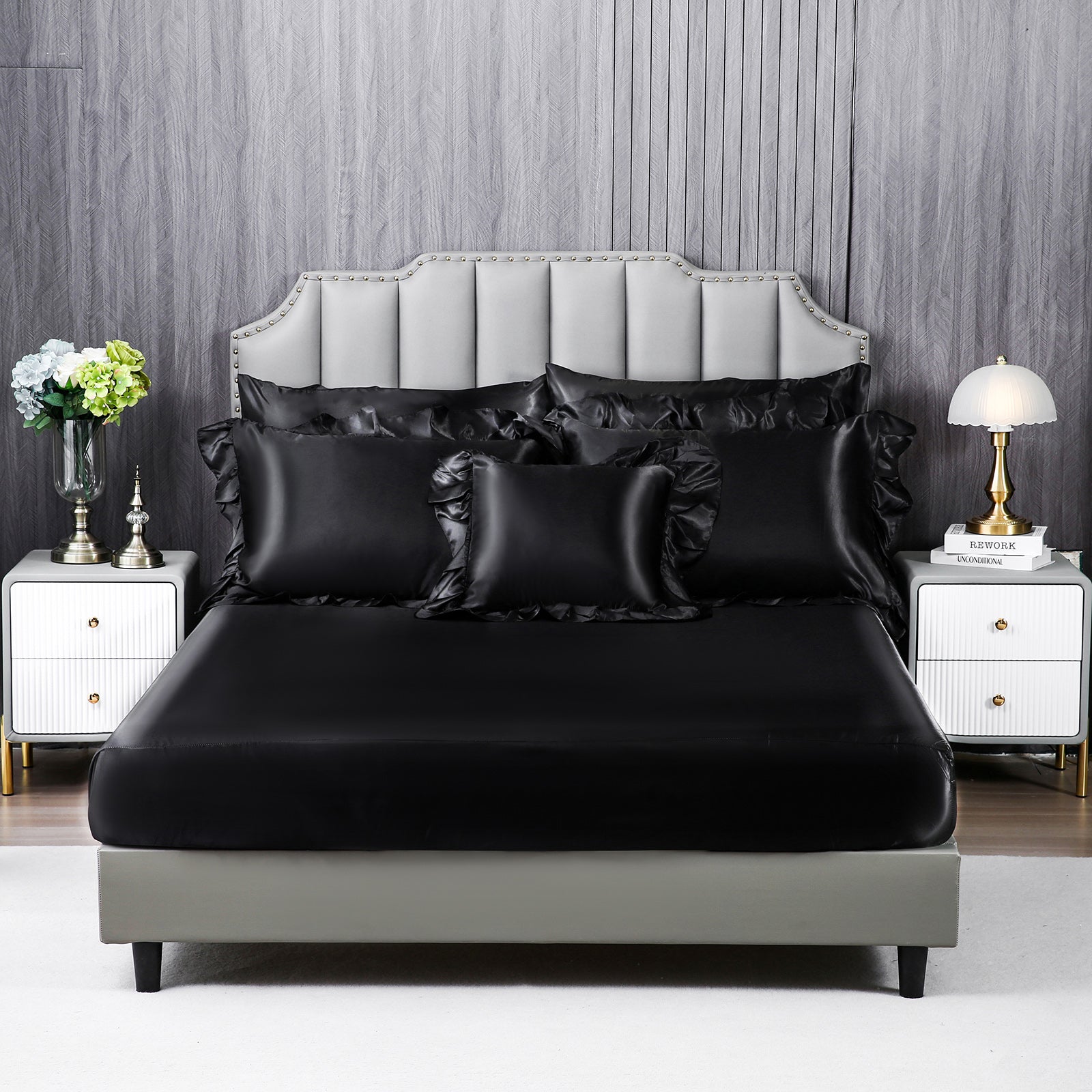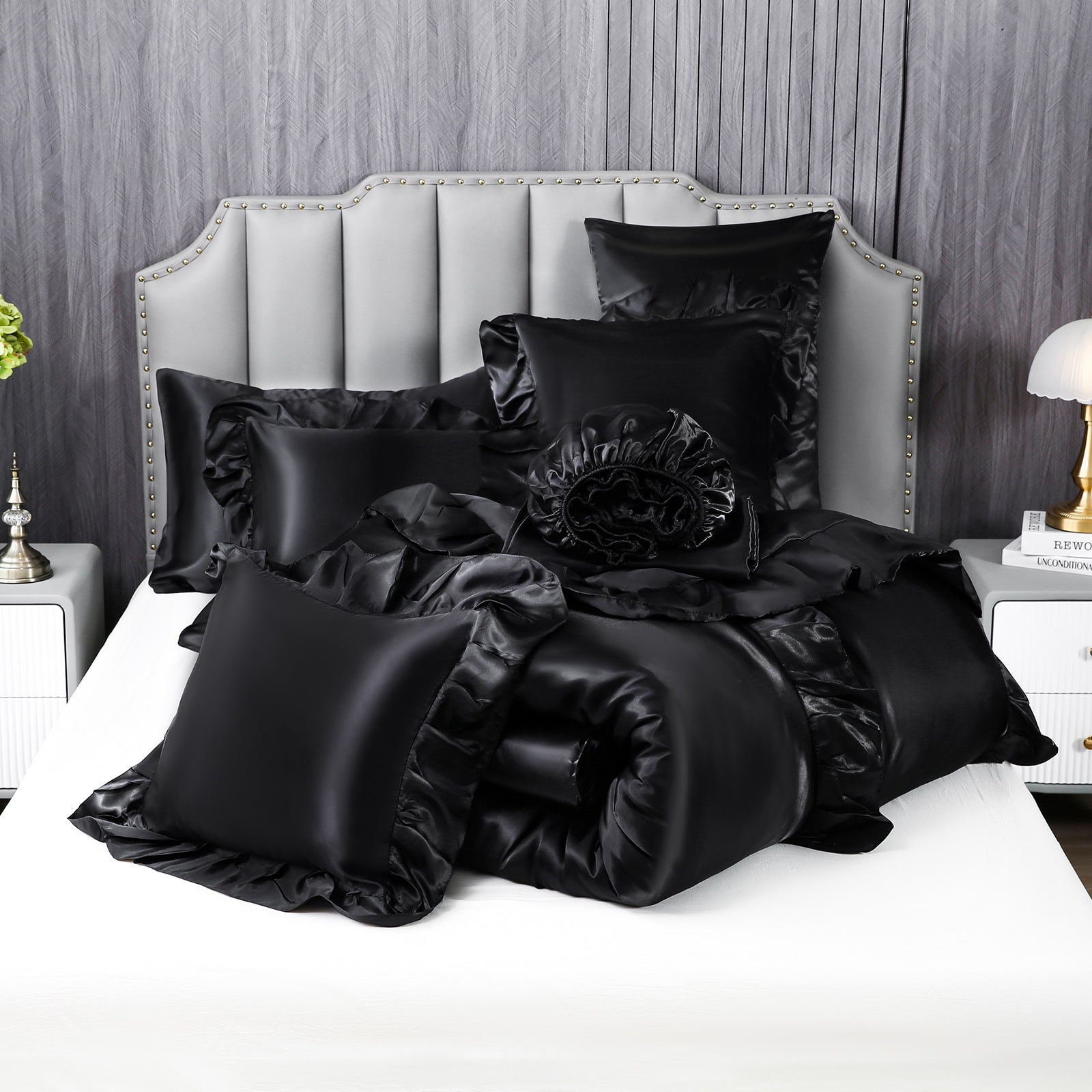 Each set includes a comforter, flat sheet, fitted sheet with a 16" pocket, 4 pillowcases, and 1 cushion cover—providing everything you need for a coordinated look. Made from silk-like satin microfiber, the bedding offers a smooth, breathable surface that feels soft and luxurious to the touch.