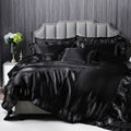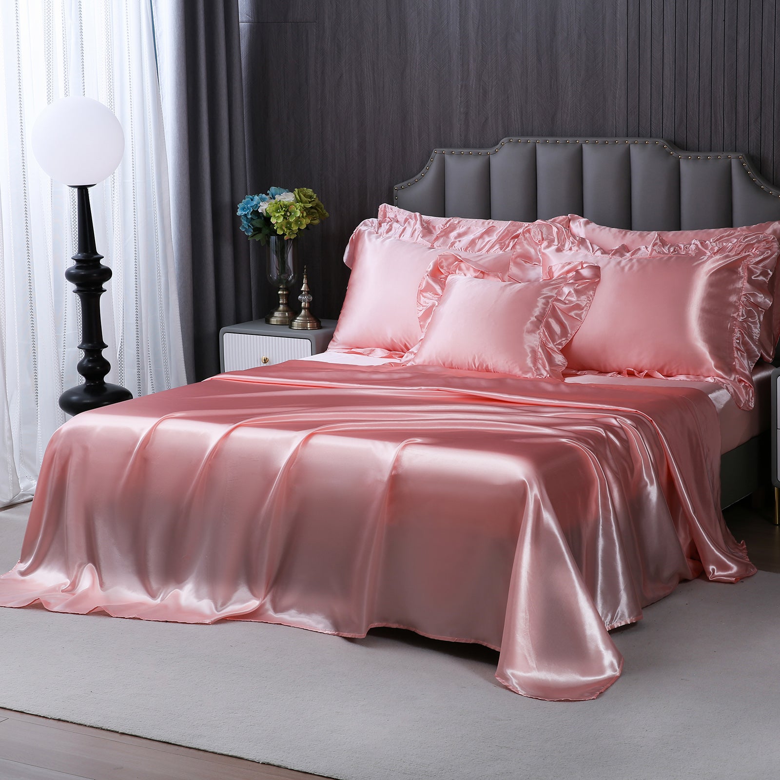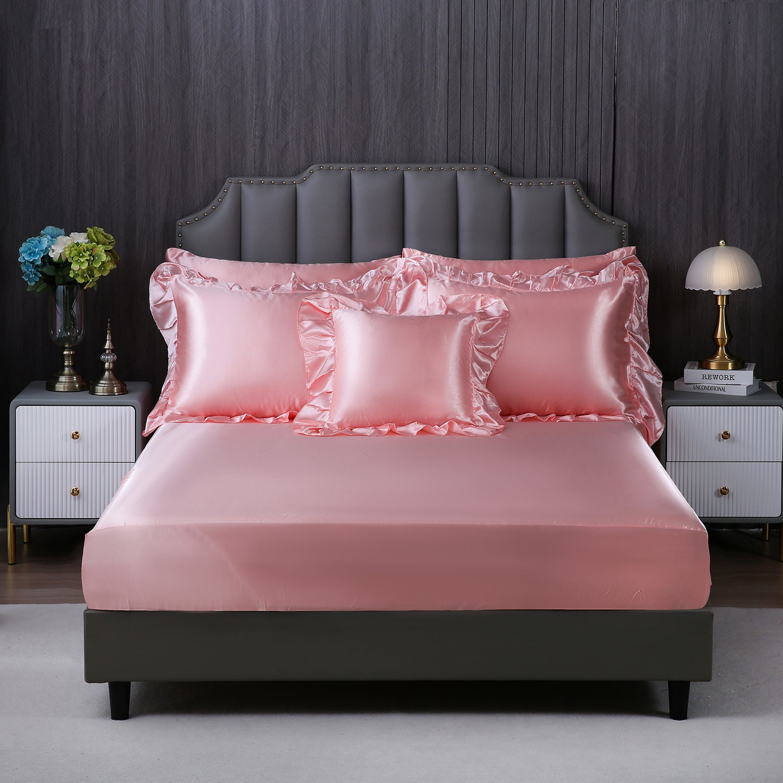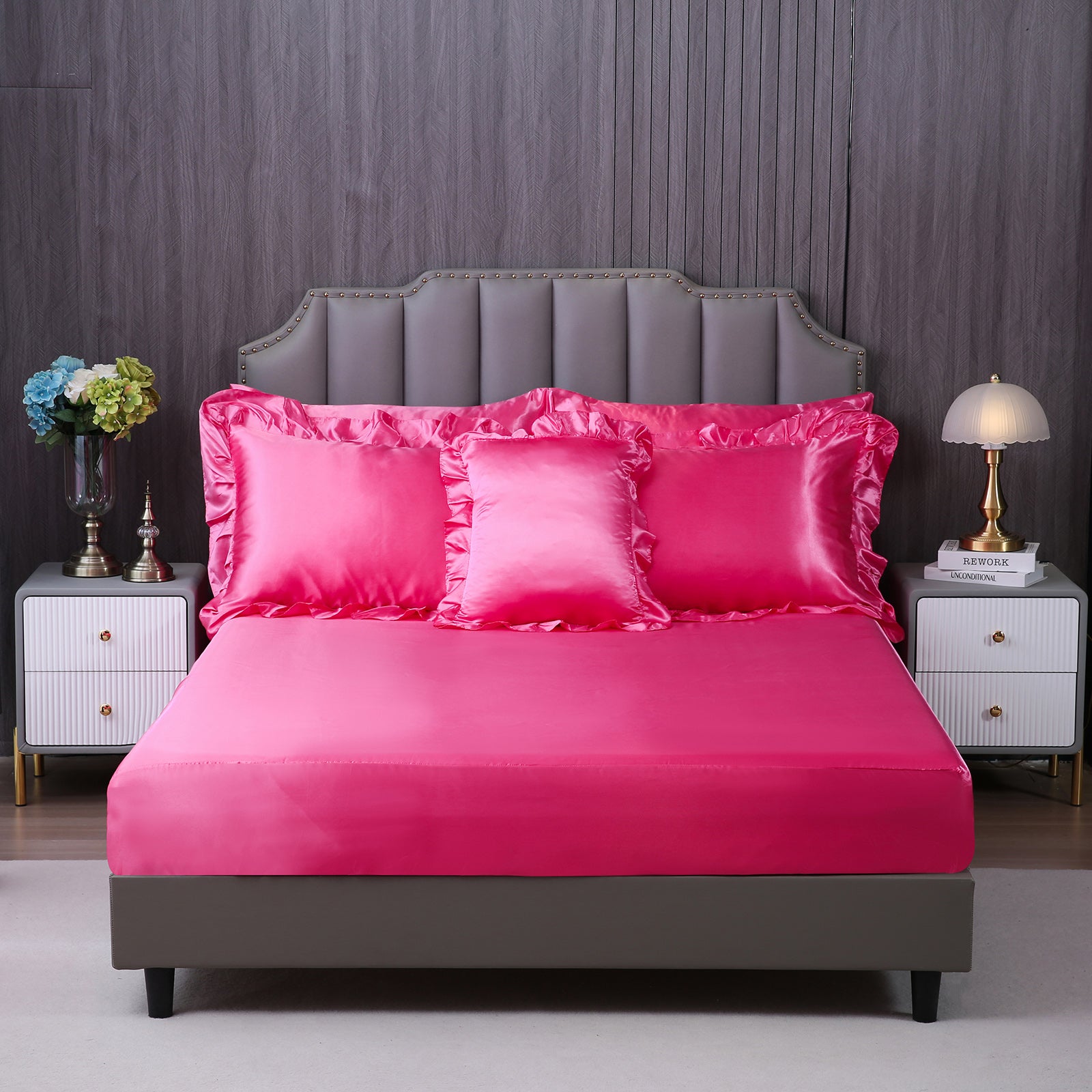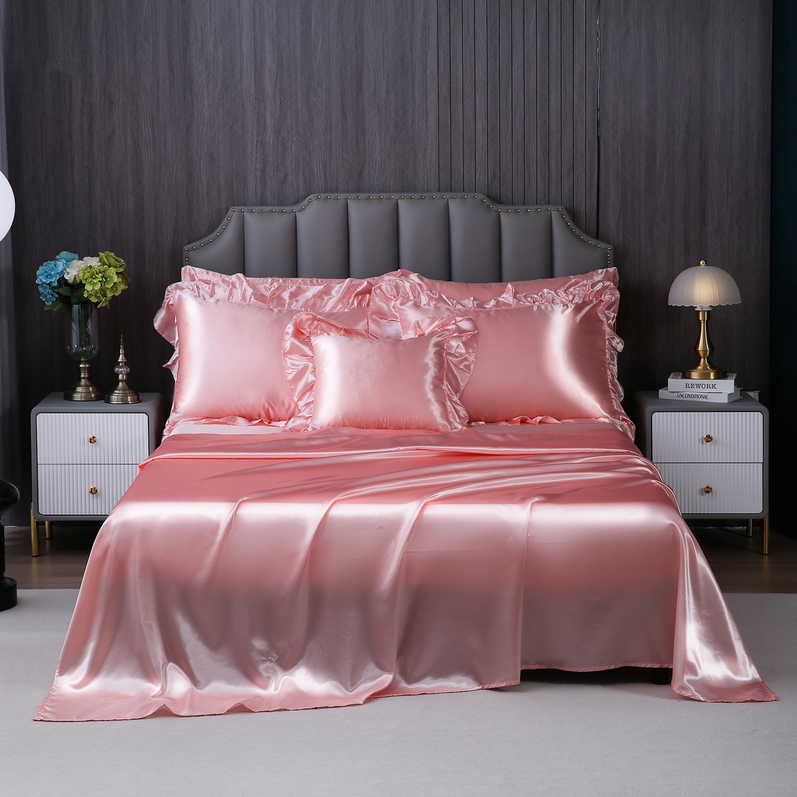 Each set includes a comforter, flat sheet, fitted sheet with a 16" pocket, 4 pillowcases, and 1 cushion cover—providing everything you need for a coordinated look. Made from silk-like satin microfiber, the bedding offers a smooth, breathable surface that feels soft and luxurious to the touch.