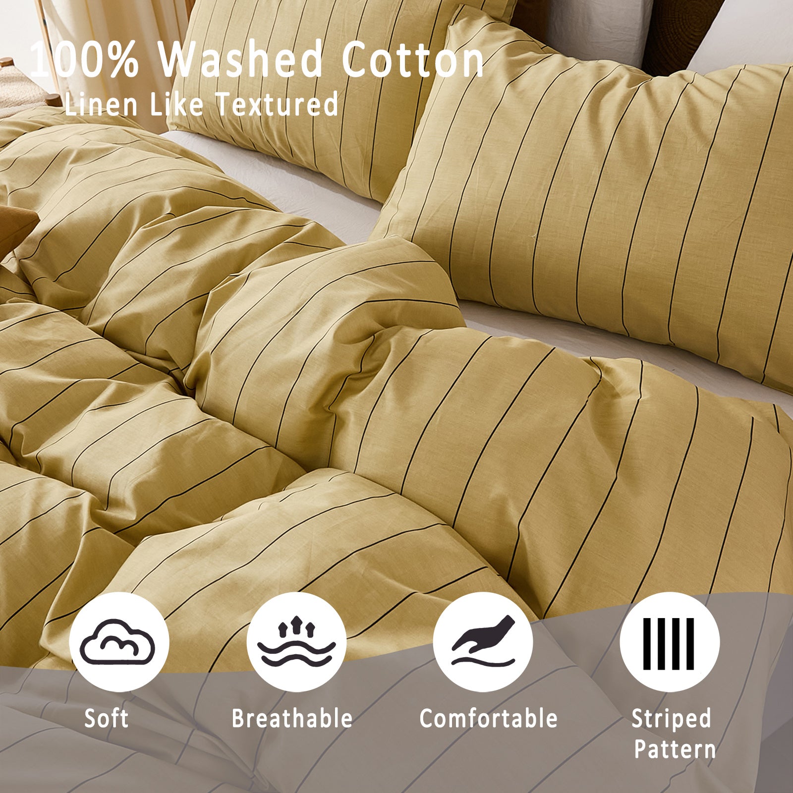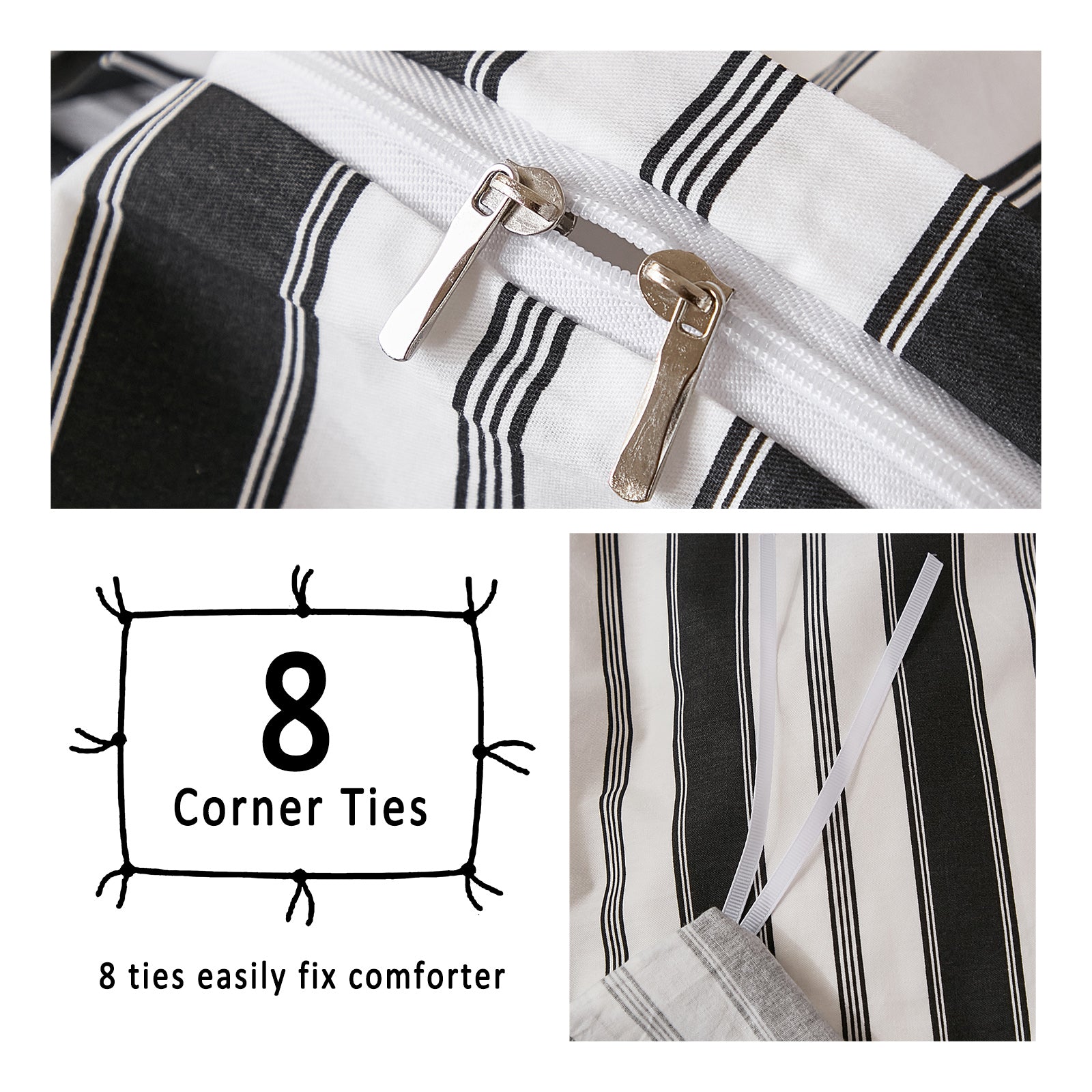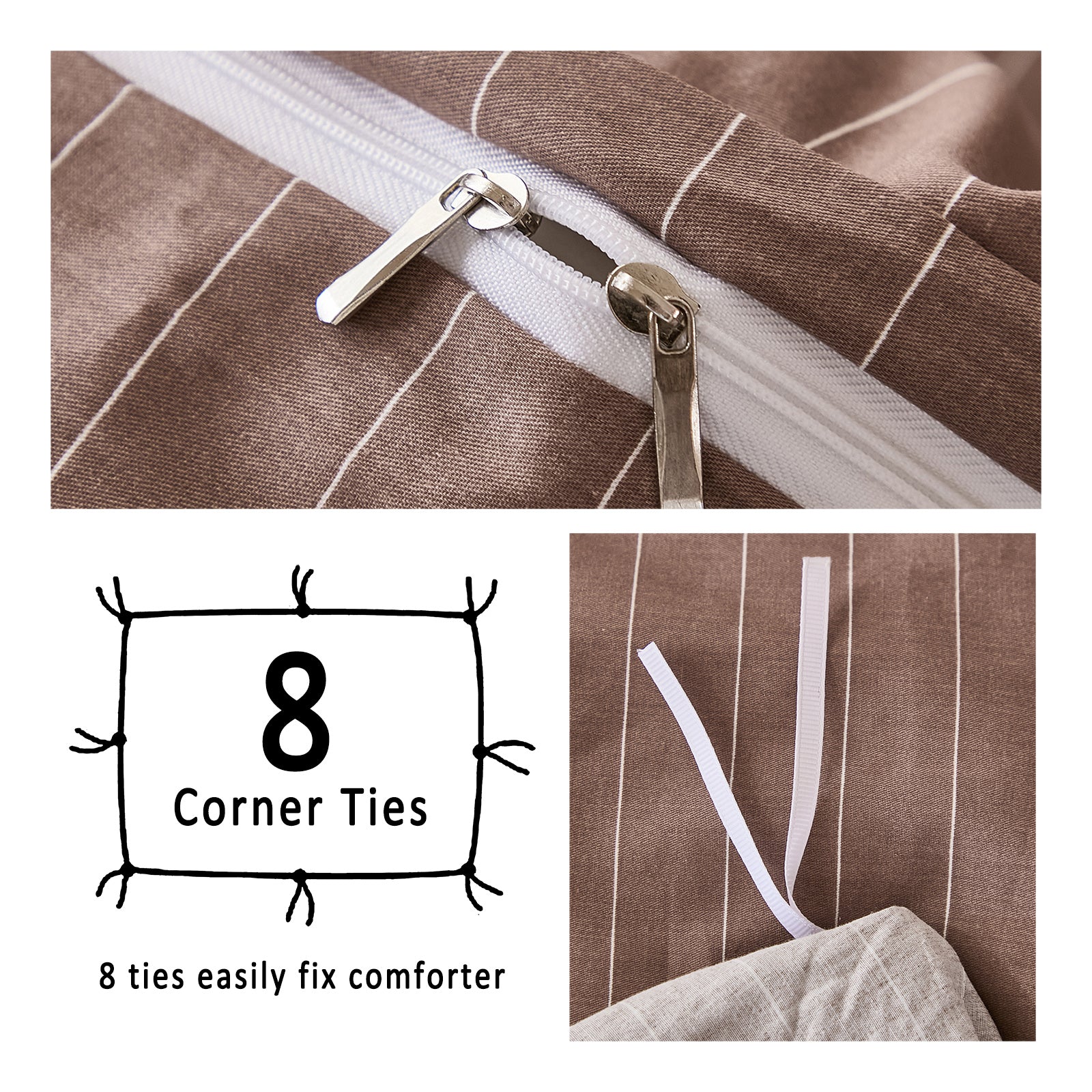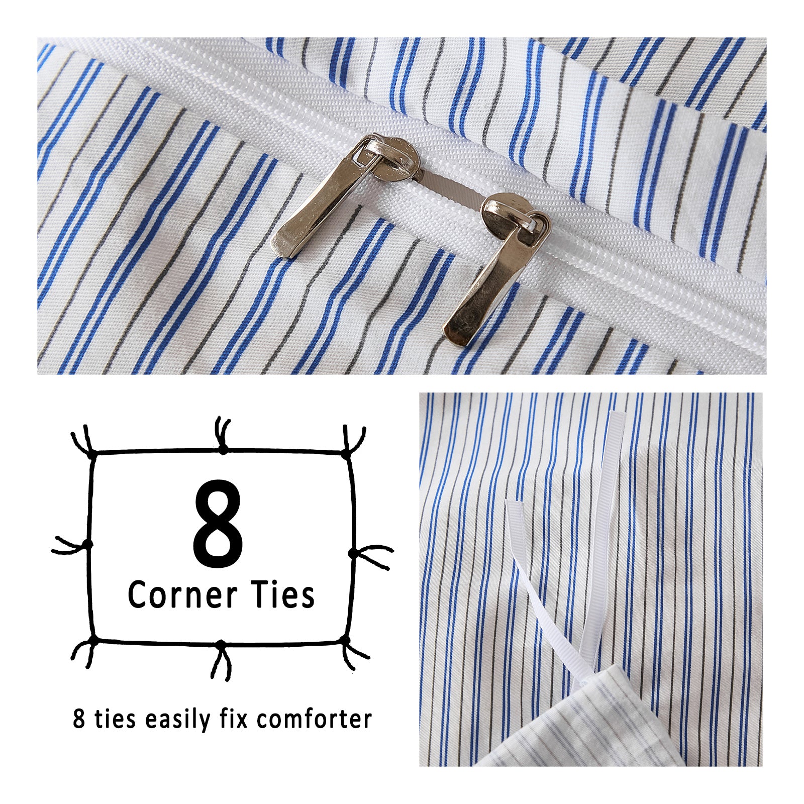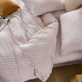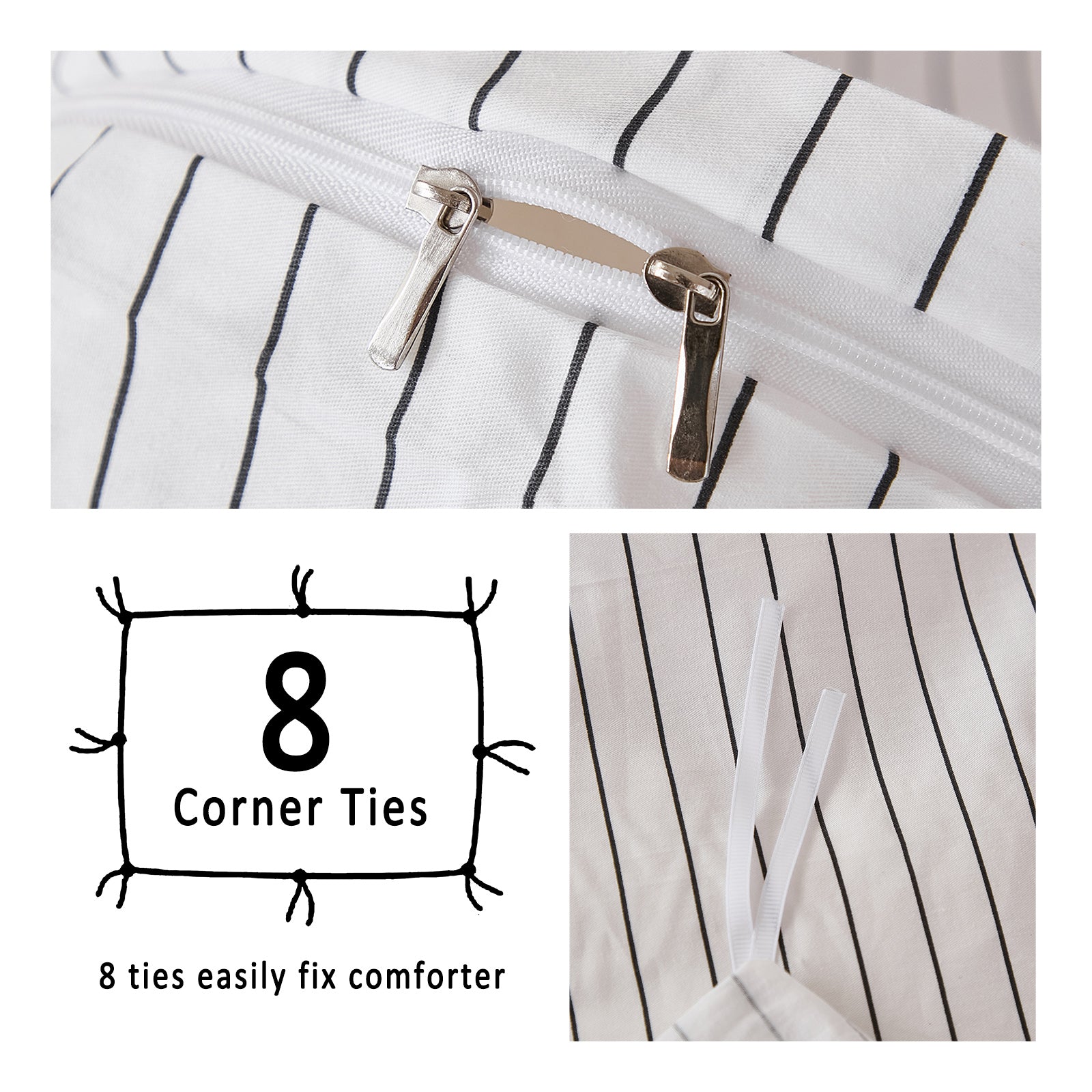 Striped Cotton Duvet Cover Set - Linen Like Reversible Bedding with Zipper and 8 Corner Ties, Soft All Season Cover,