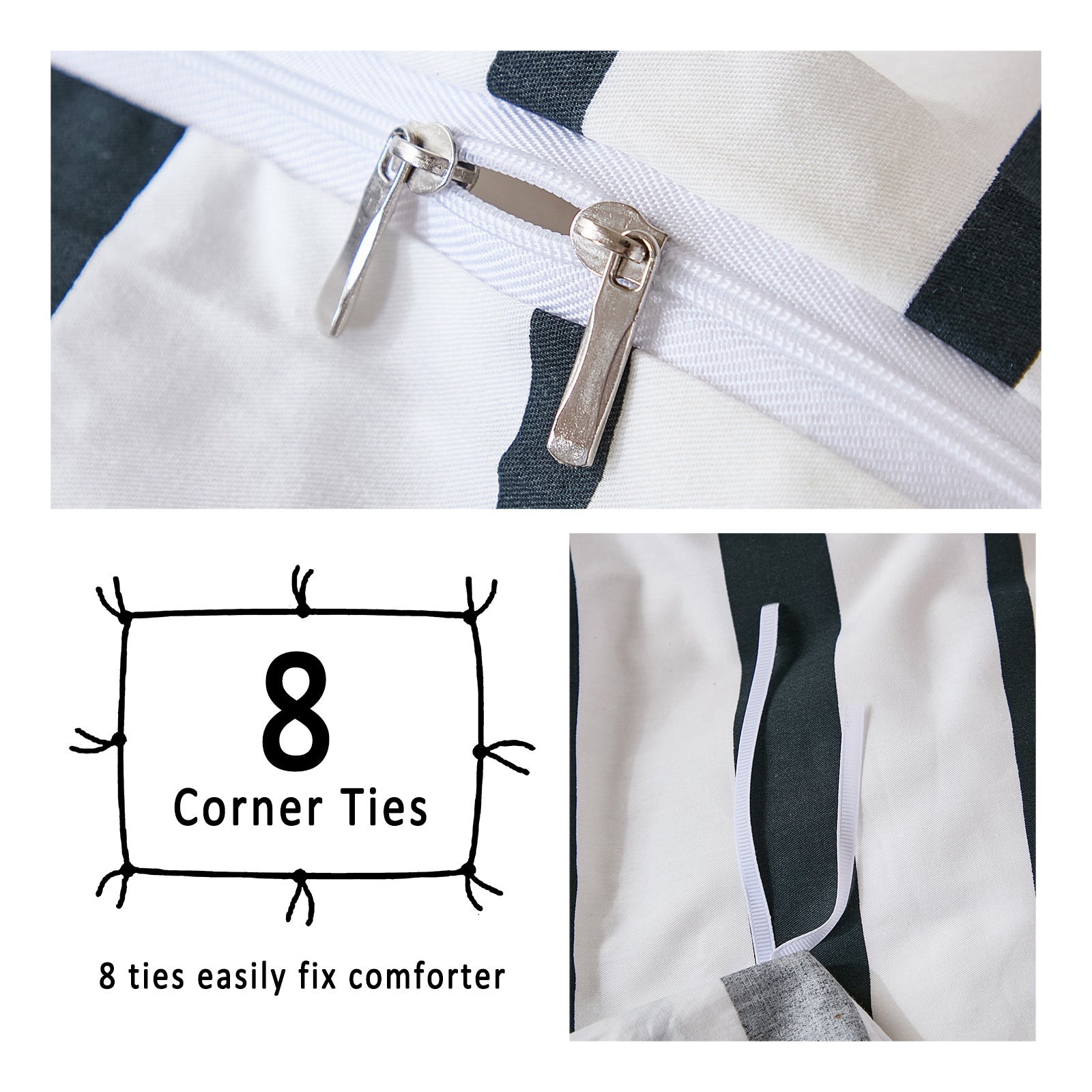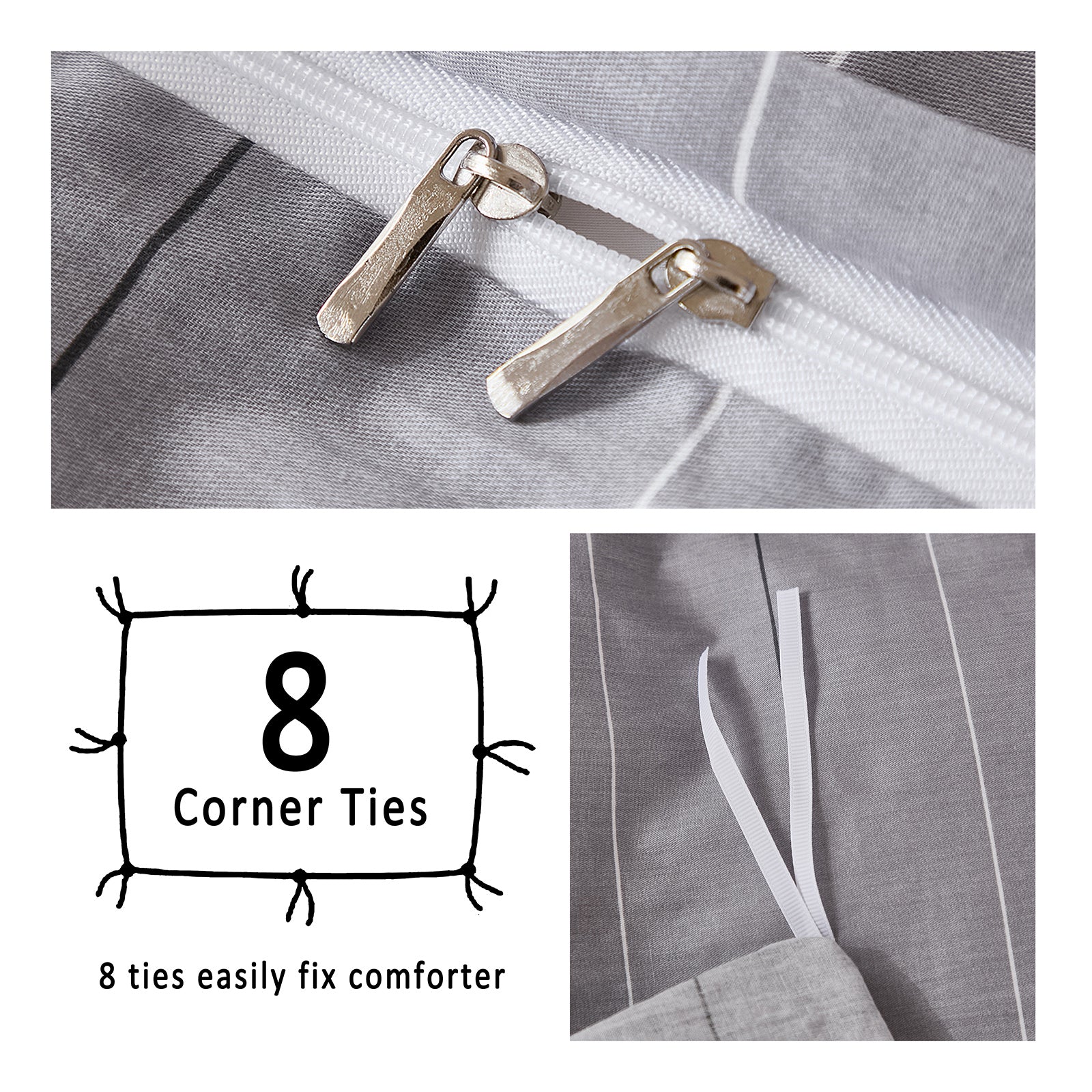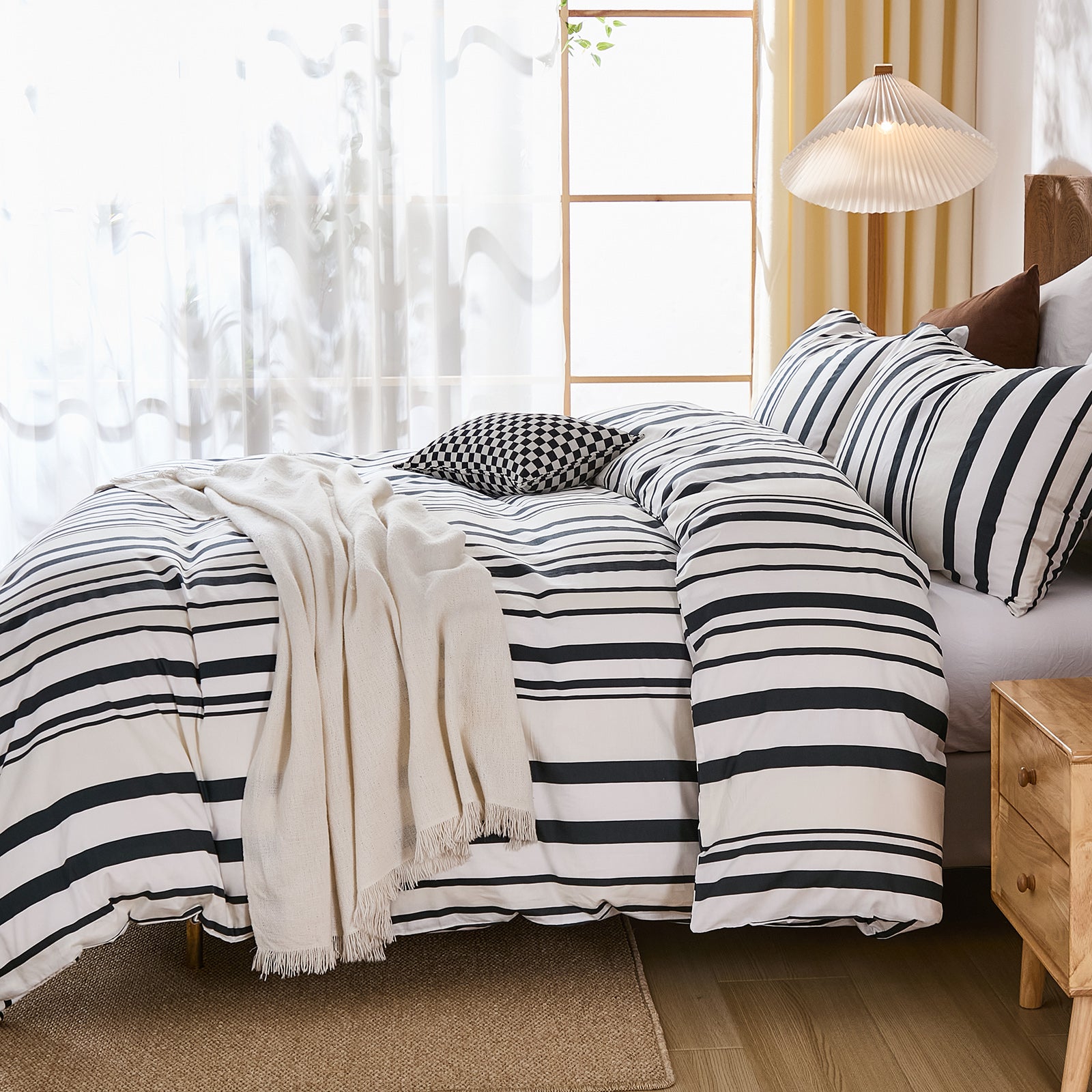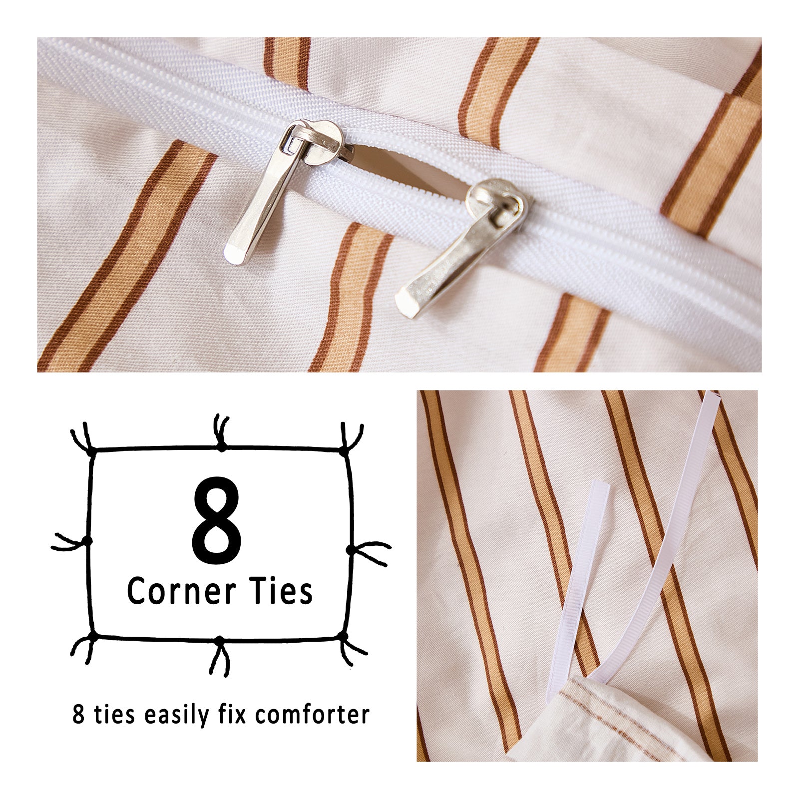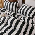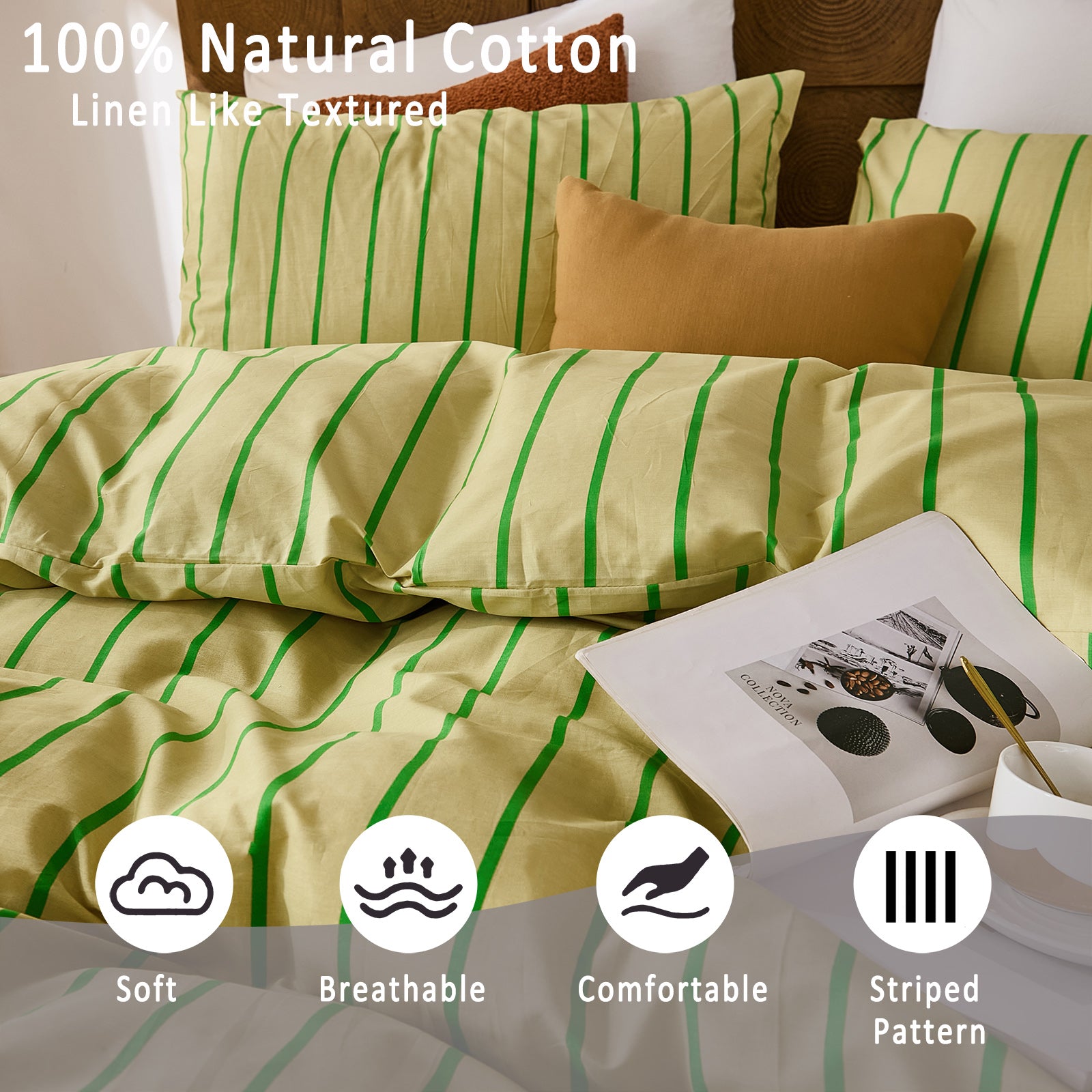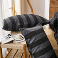 Striped Cotton Duvet Cover Set - Linen Like Reversible Bedding with Zipper and 8 Corner Ties, Soft All Season Cover,