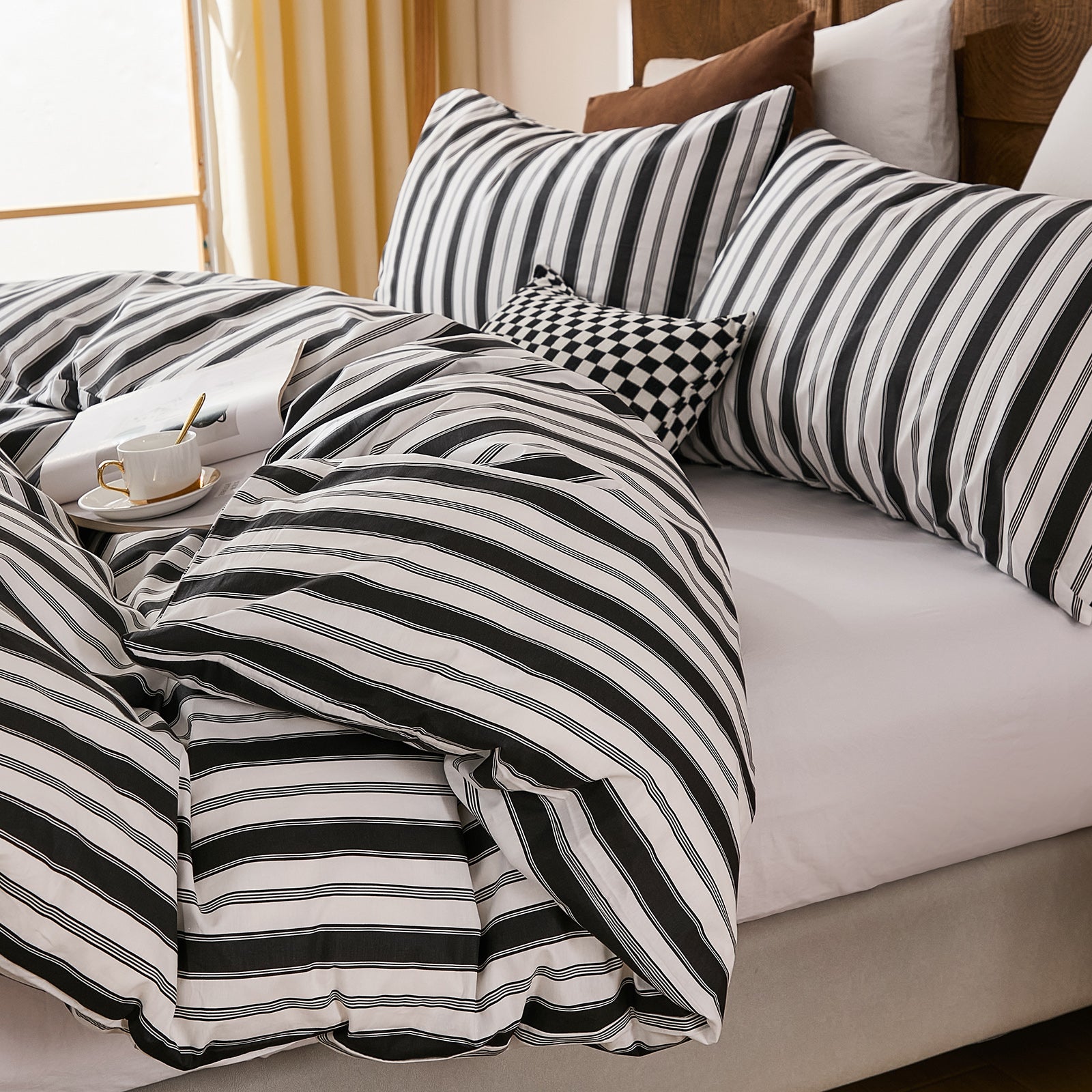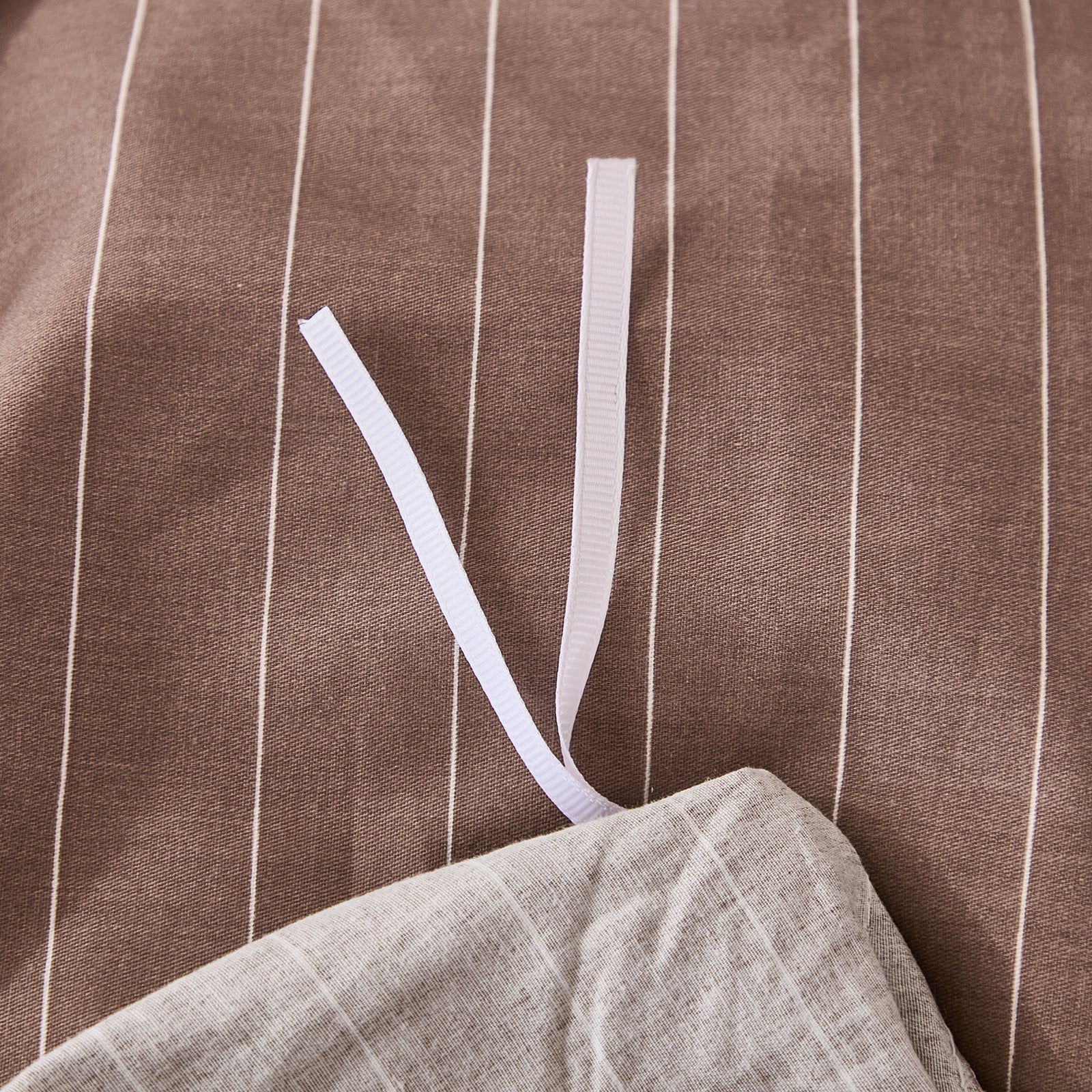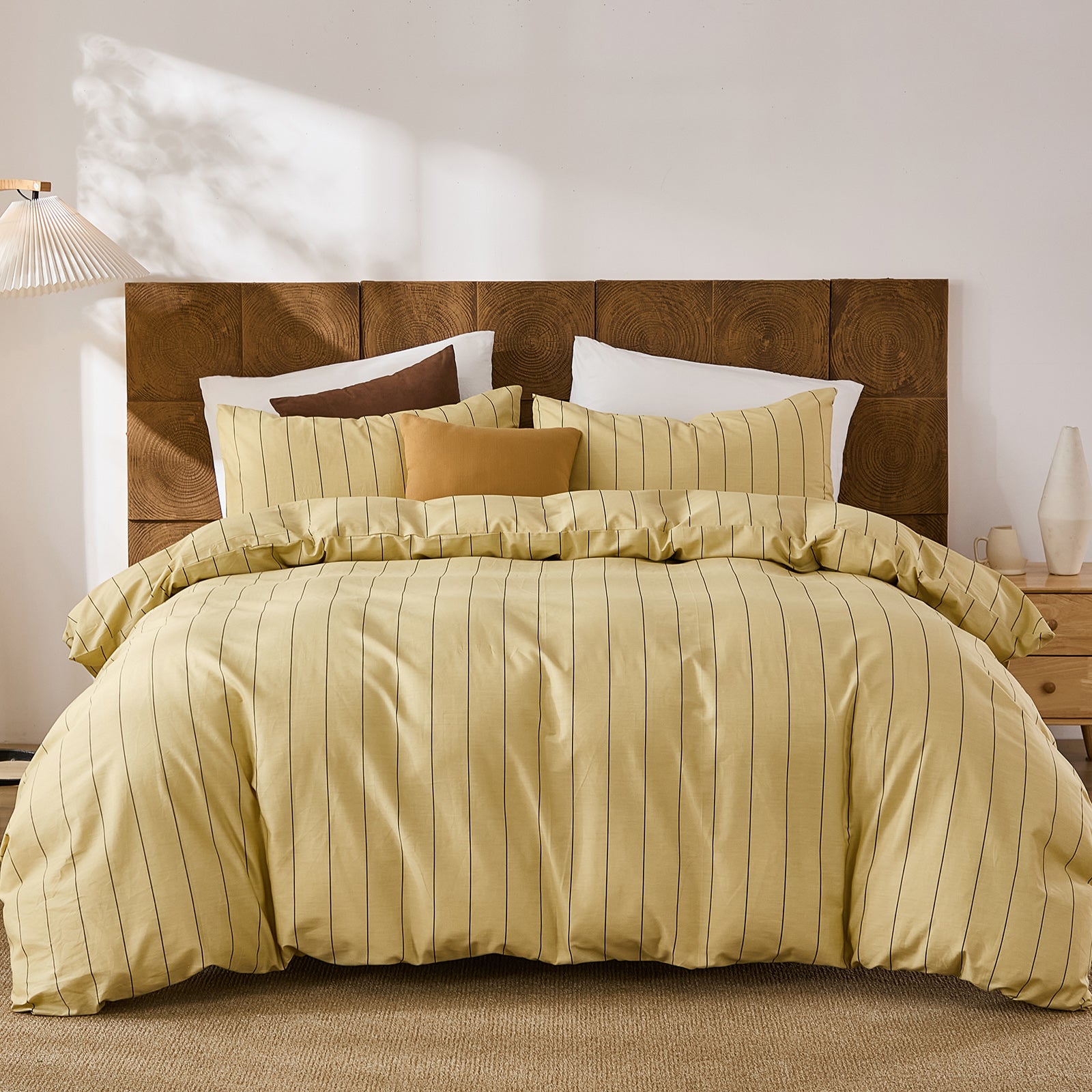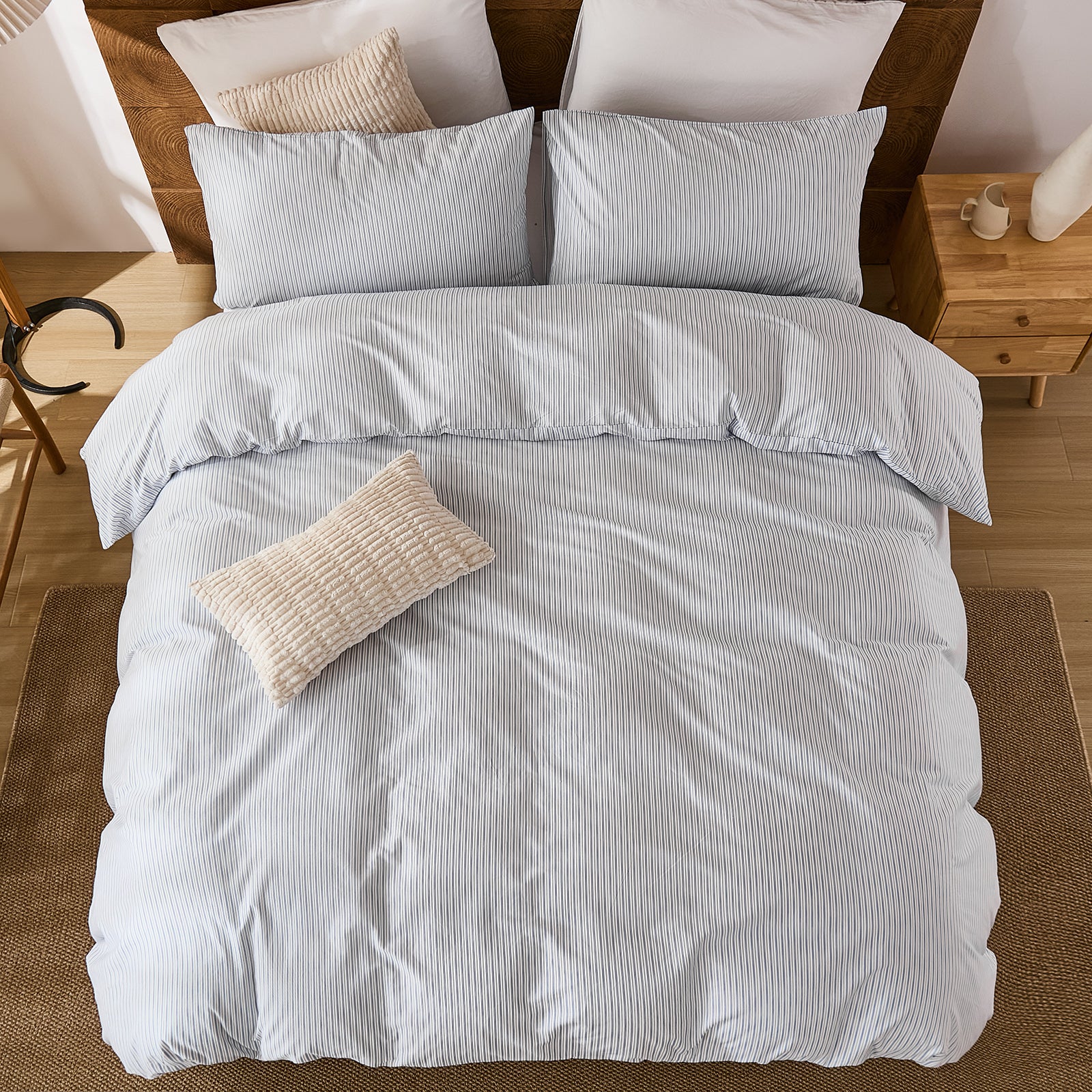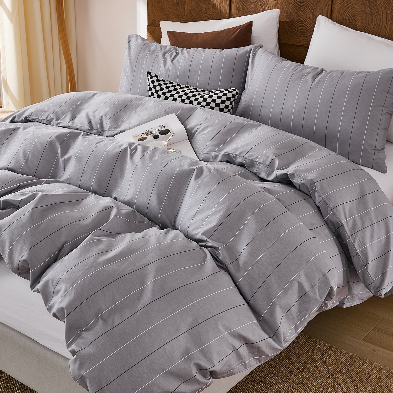 Striped Cotton Duvet Cover Set - Linen Like Reversible Bedding with Zipper and 8 Corner Ties, Soft All Season Cover,