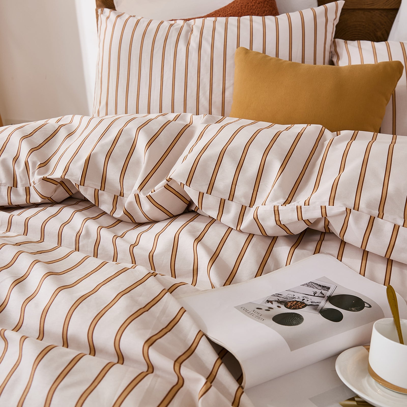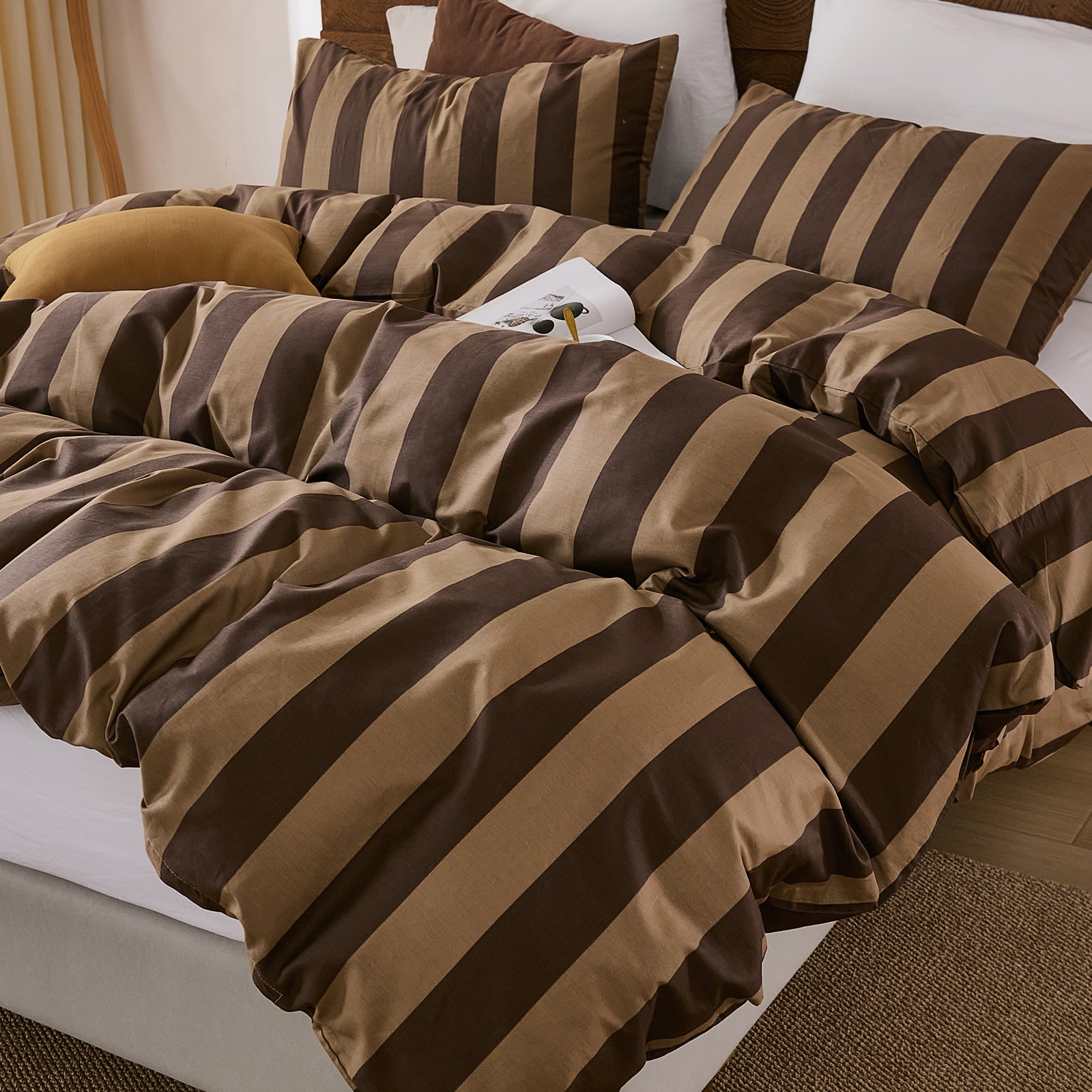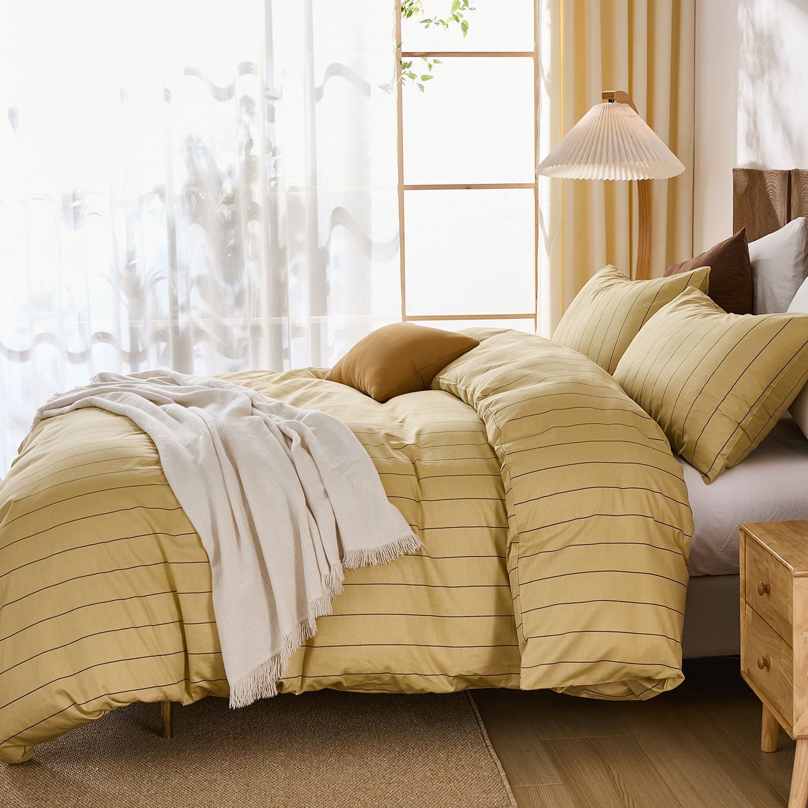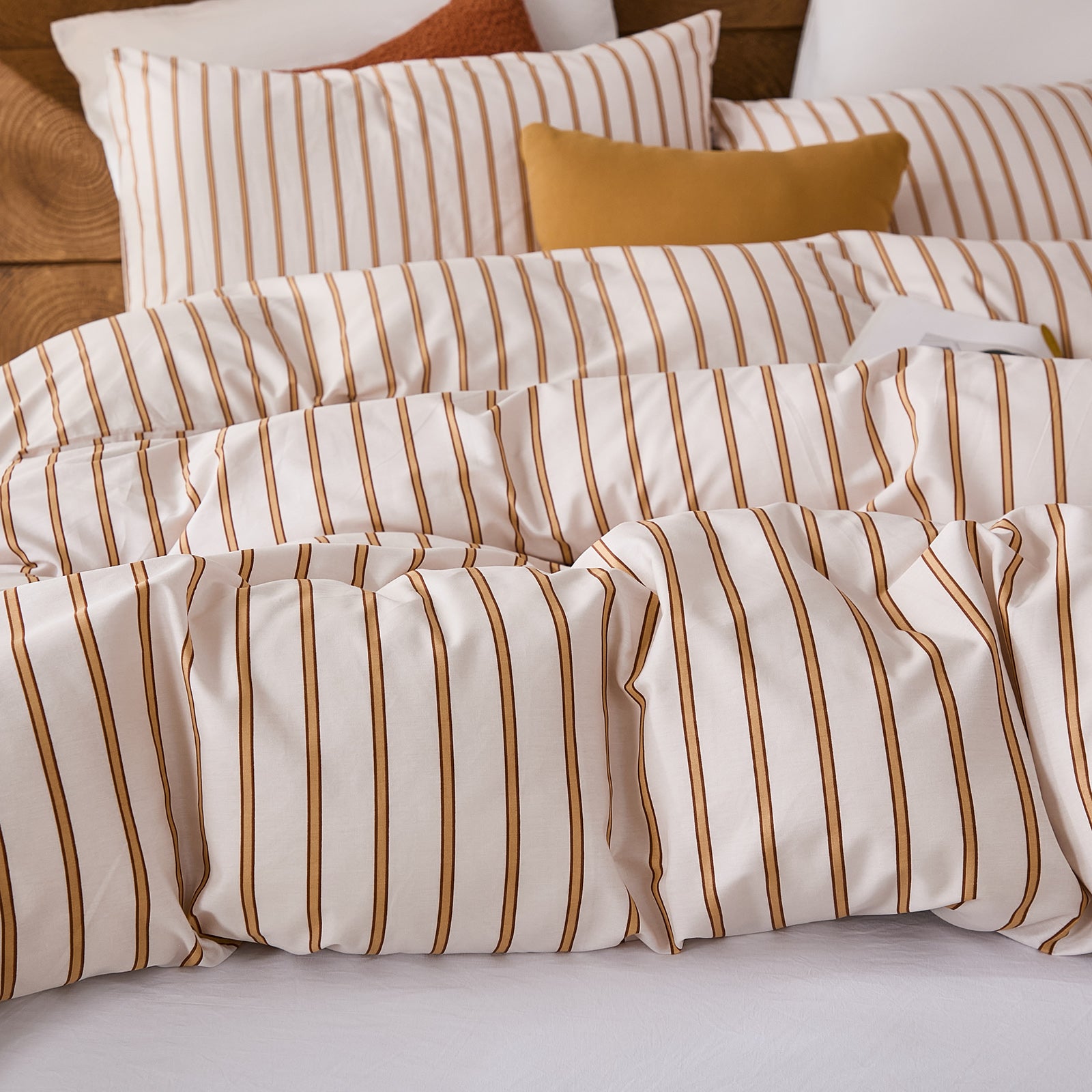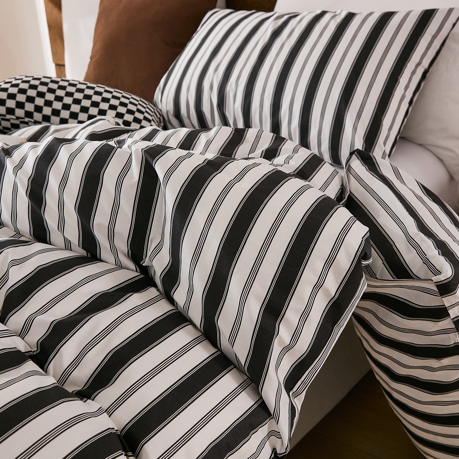 Striped Cotton Duvet Cover Set - Linen Like Reversible Bedding with Zipper and 8 Corner Ties, Soft All Season Cover,