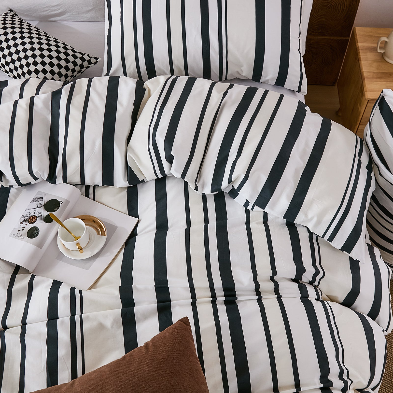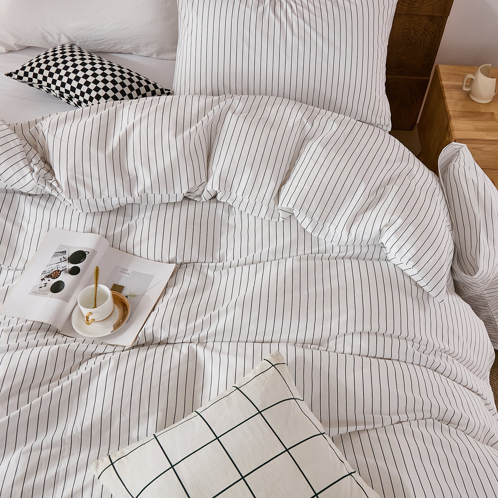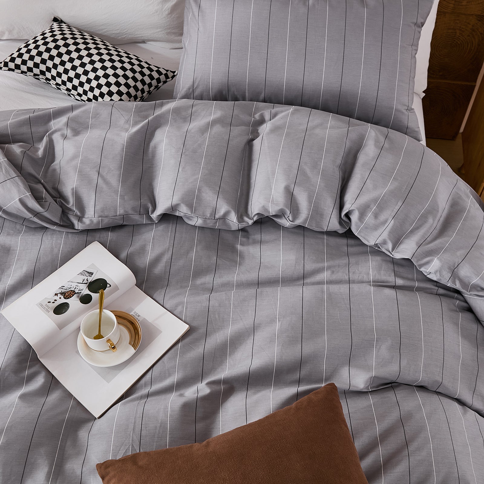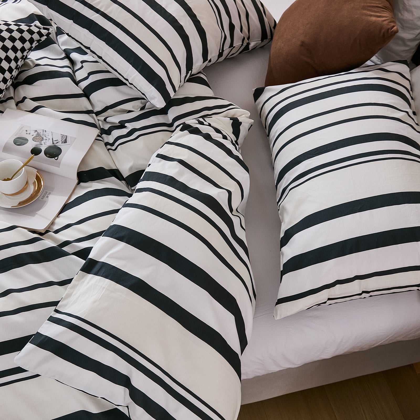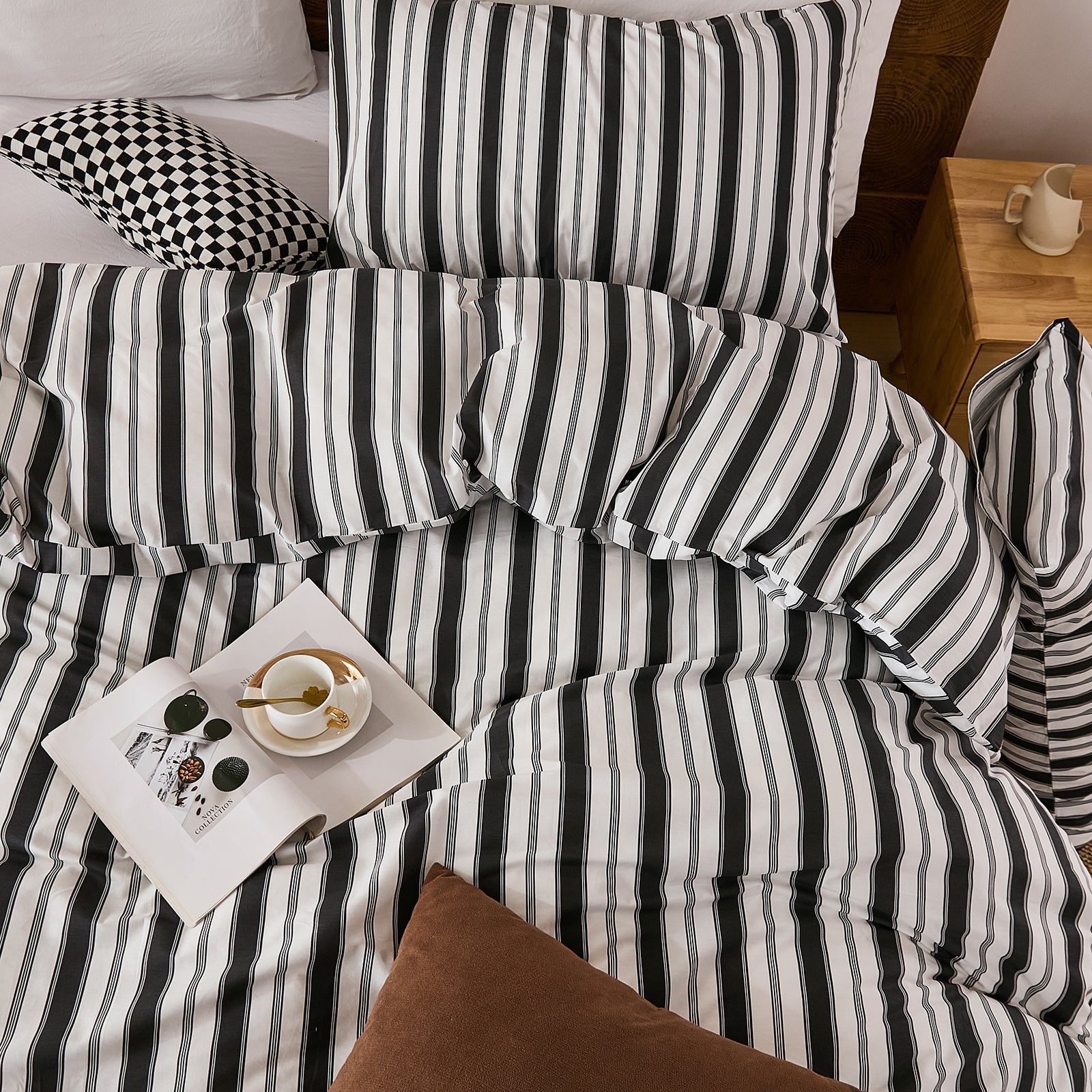 Striped Cotton Duvet Cover Set - Linen Like Reversible Bedding with Zipper and 8 Corner Ties, Soft All Season Cover,