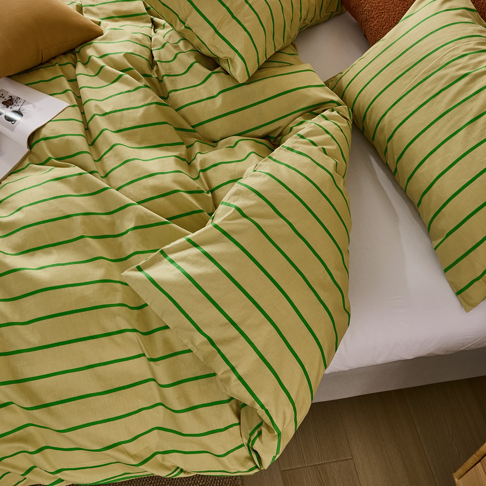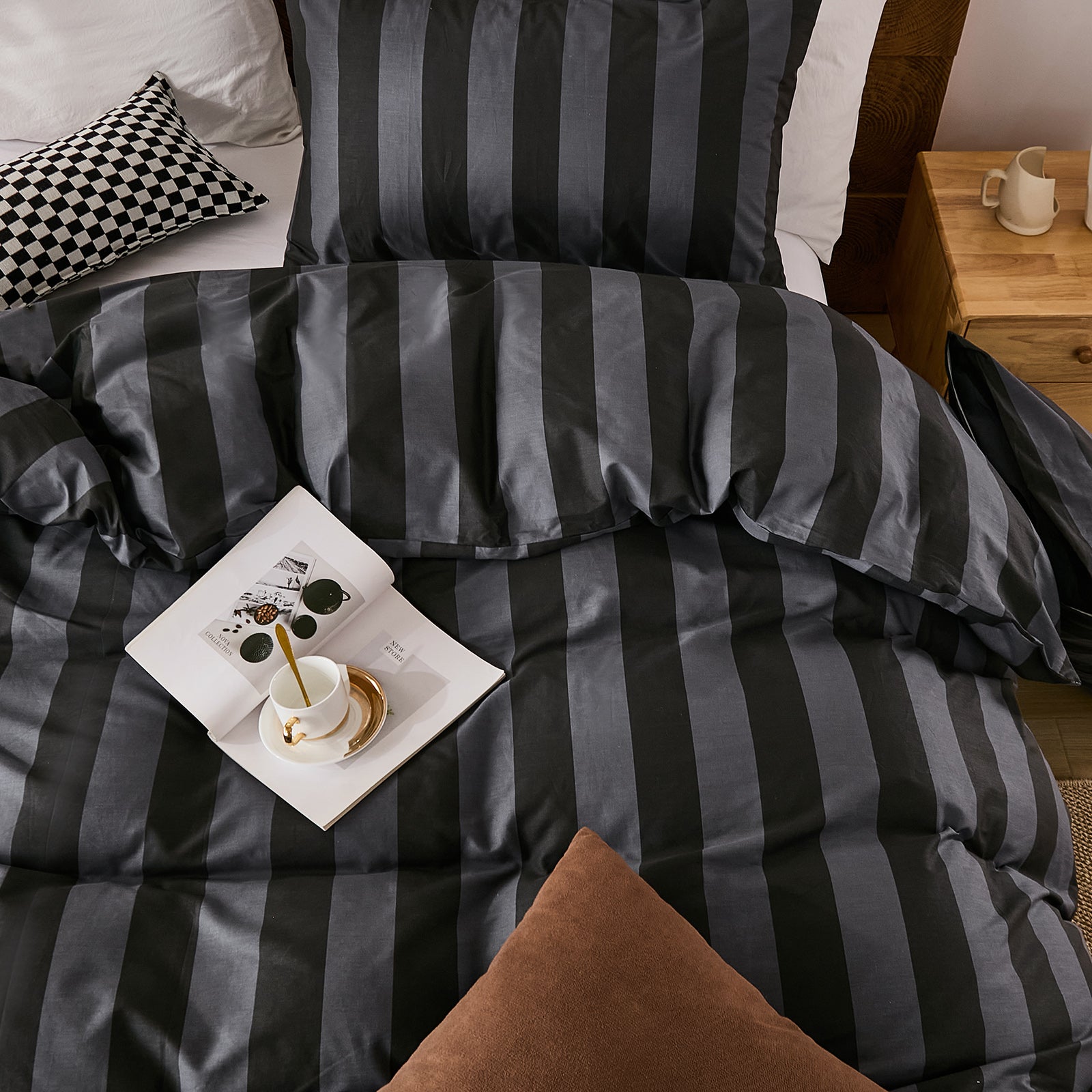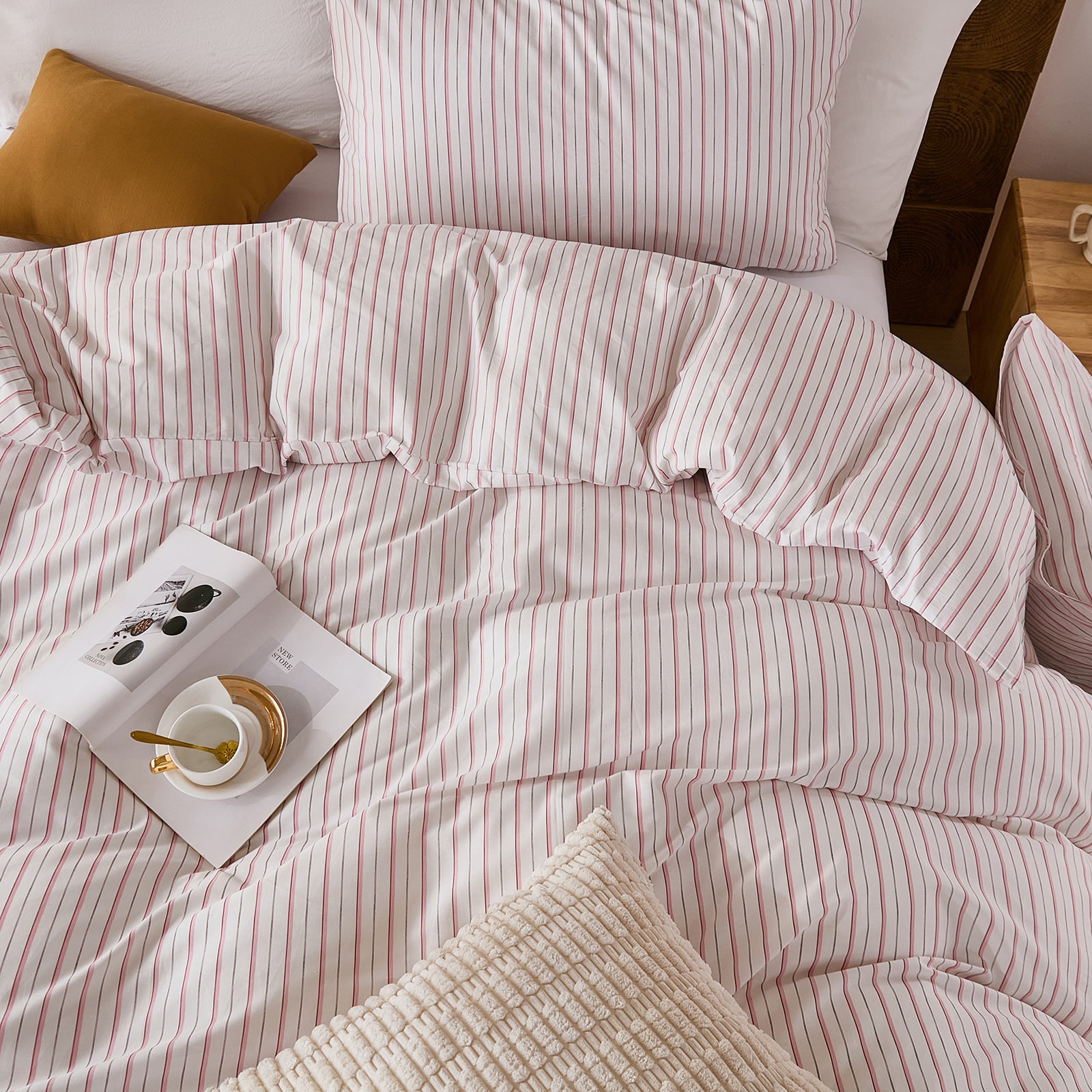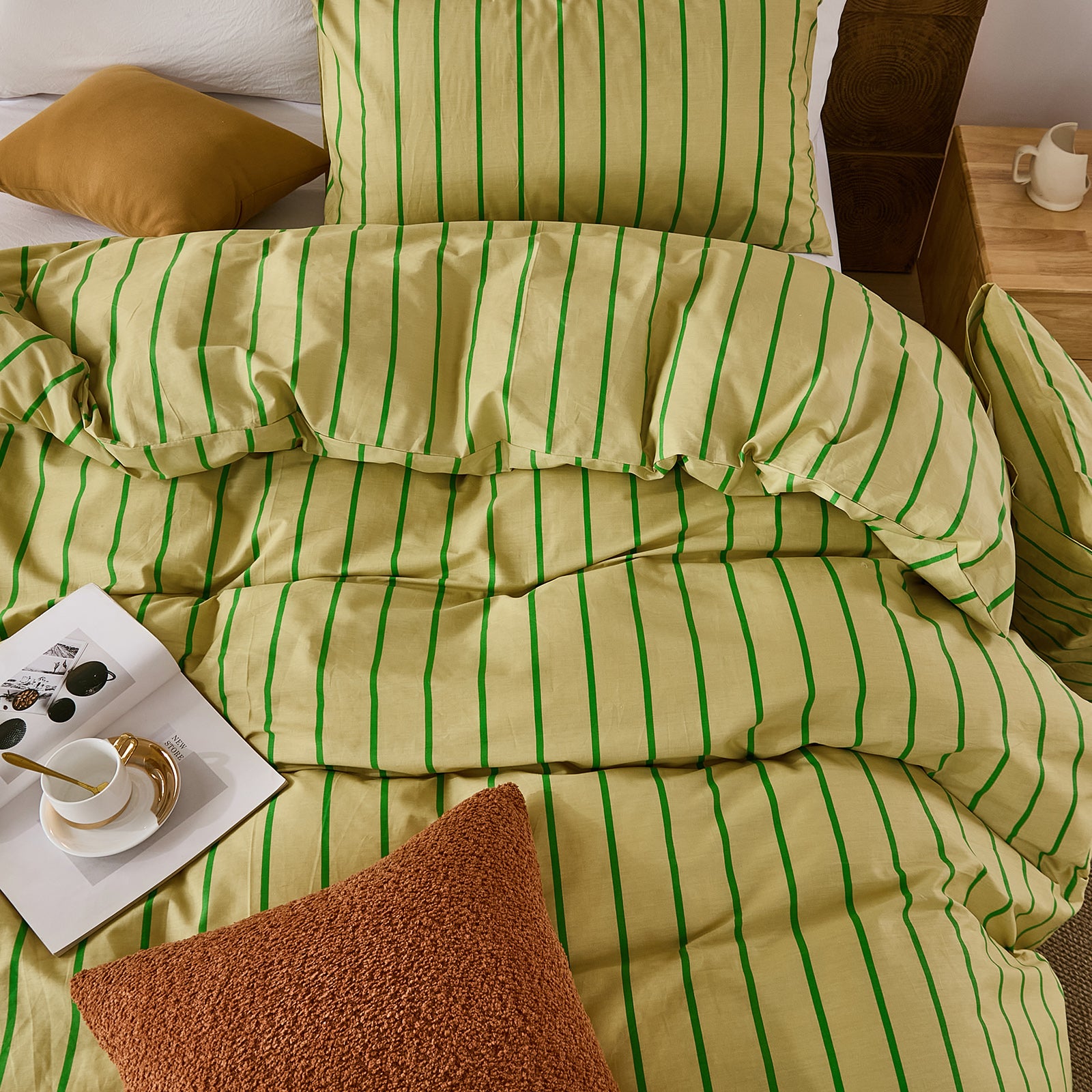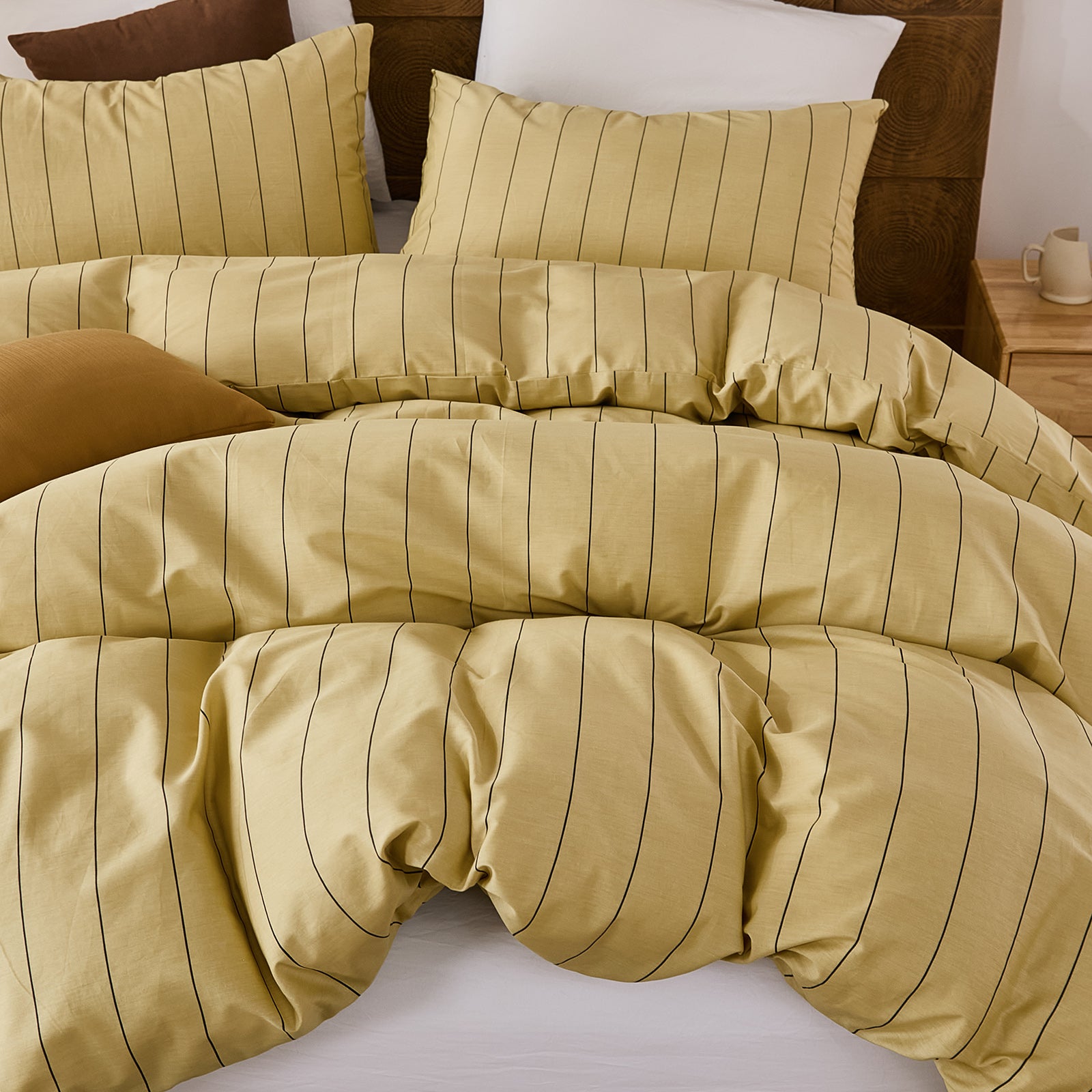 Striped Cotton Duvet Cover Set - Linen Like Reversible Bedding with Zipper and 8 Corner Ties, Soft All Season Cover,
