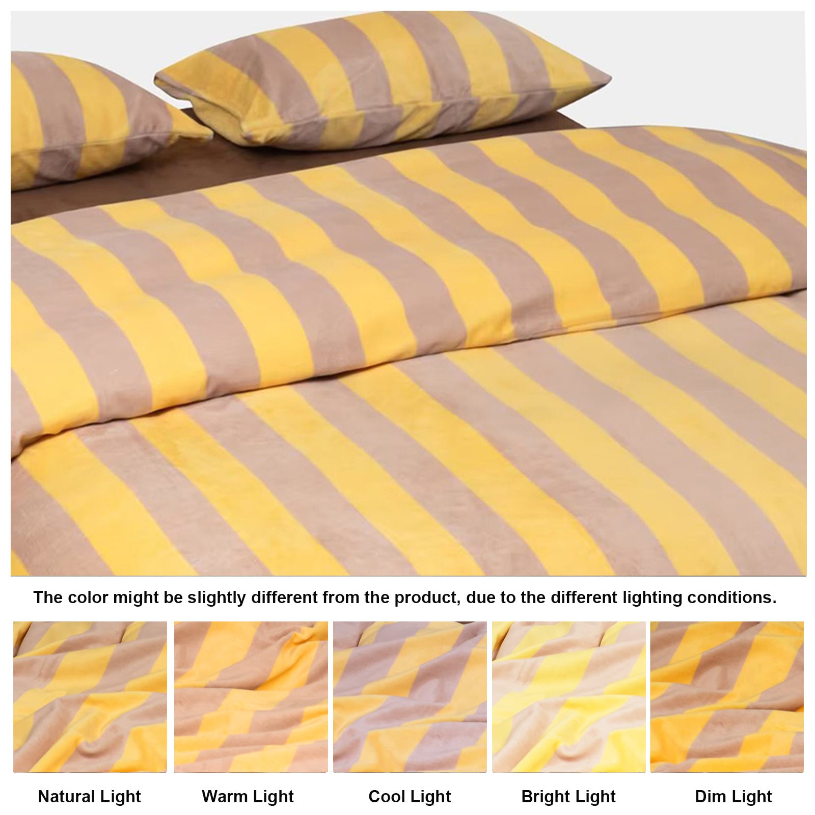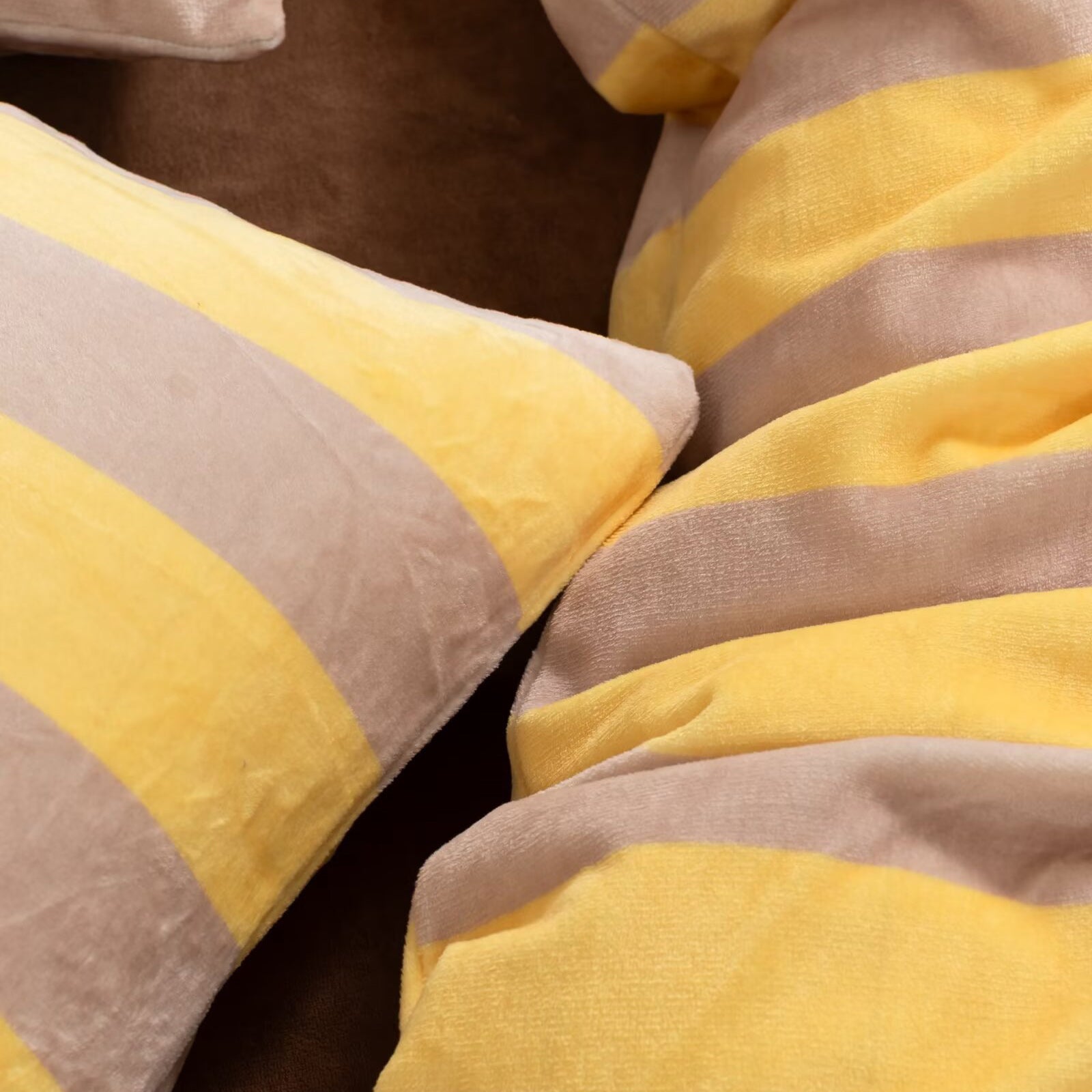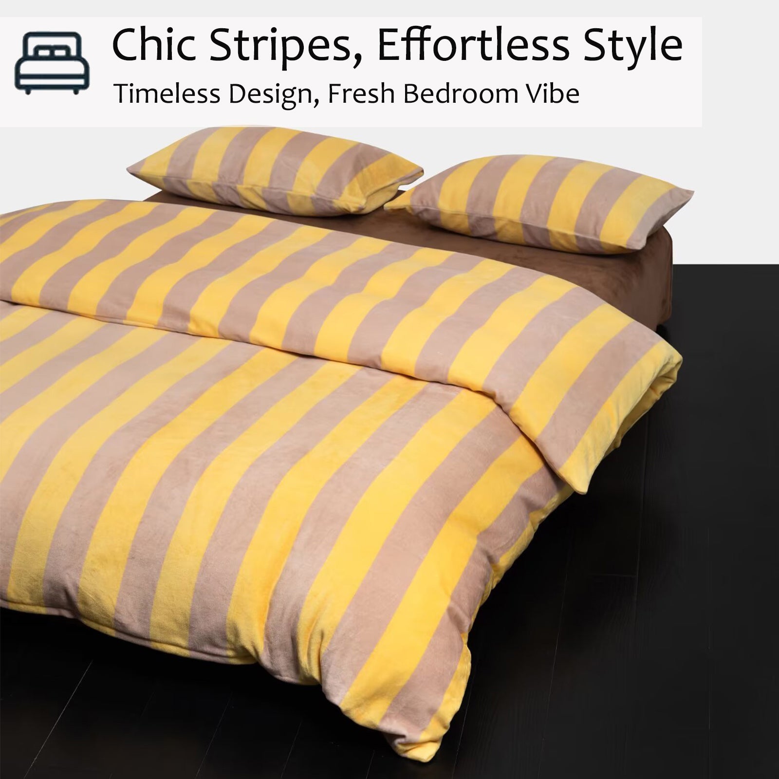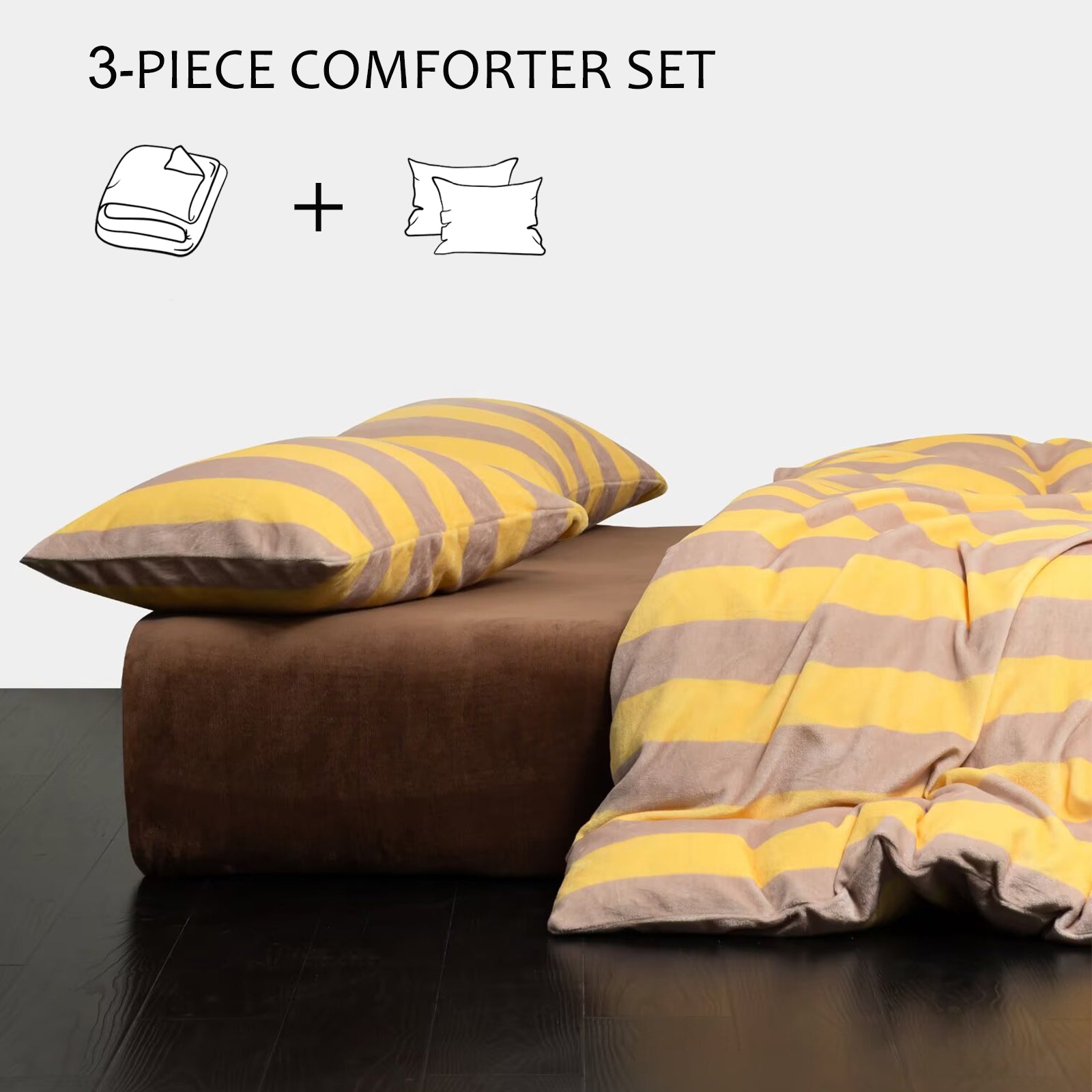 Bring cozy luxury to your bedroom with this Striped Velvet Fleece Comforter Set. Crafted from velvety fleece, the comforter feels ultra soft and smooth with a subtle sheen, adding warmth and elegance without heaviness. The bold wide stripe pattern in soft yellow and taupe creates a modern, calming look that blends easily with minimalist, boho, or farmhouse decor.