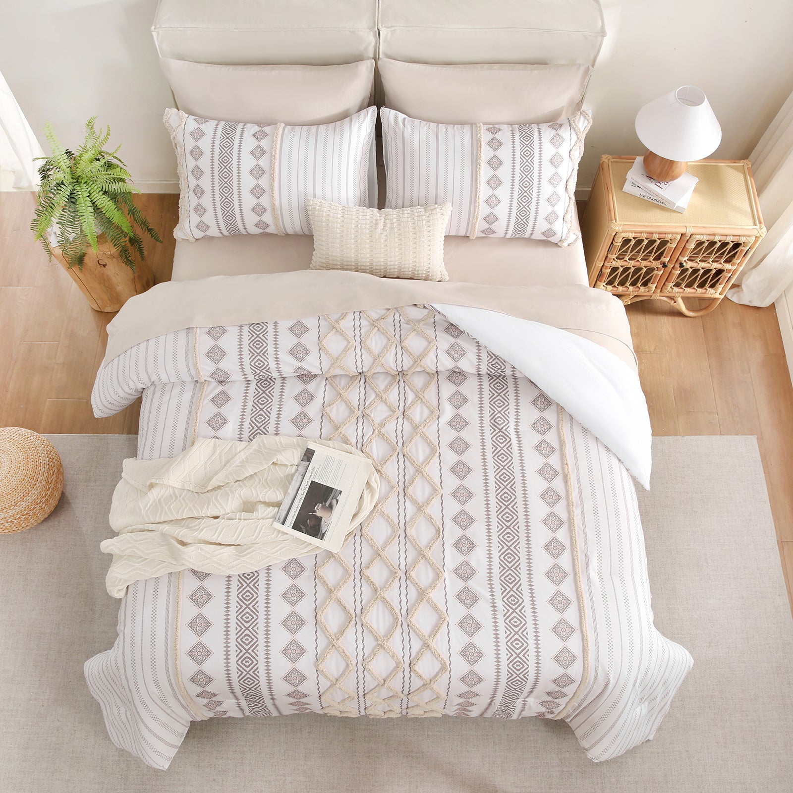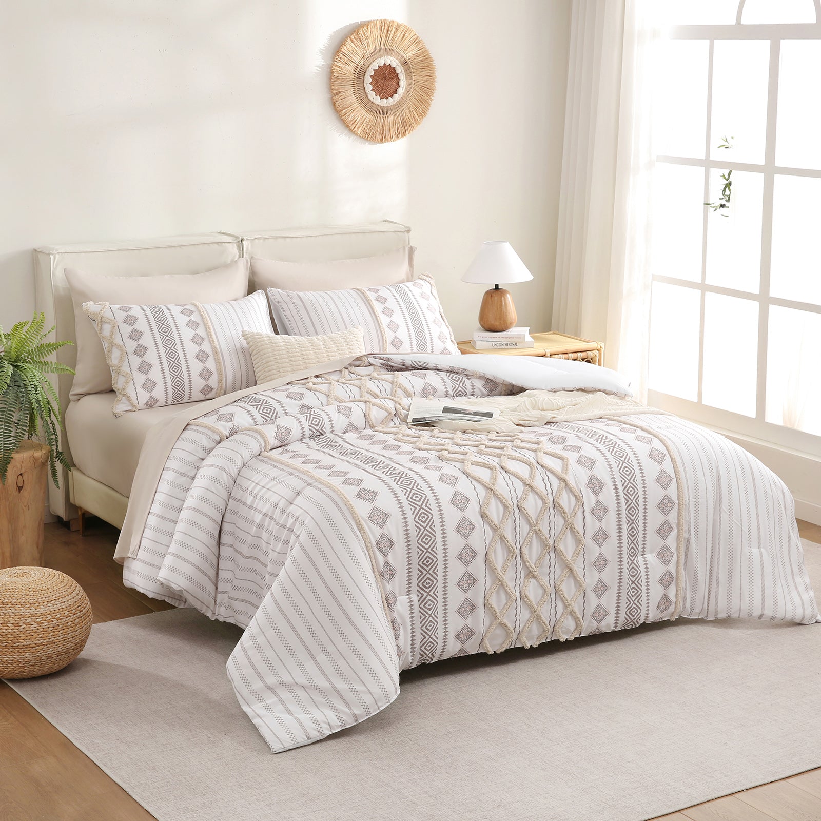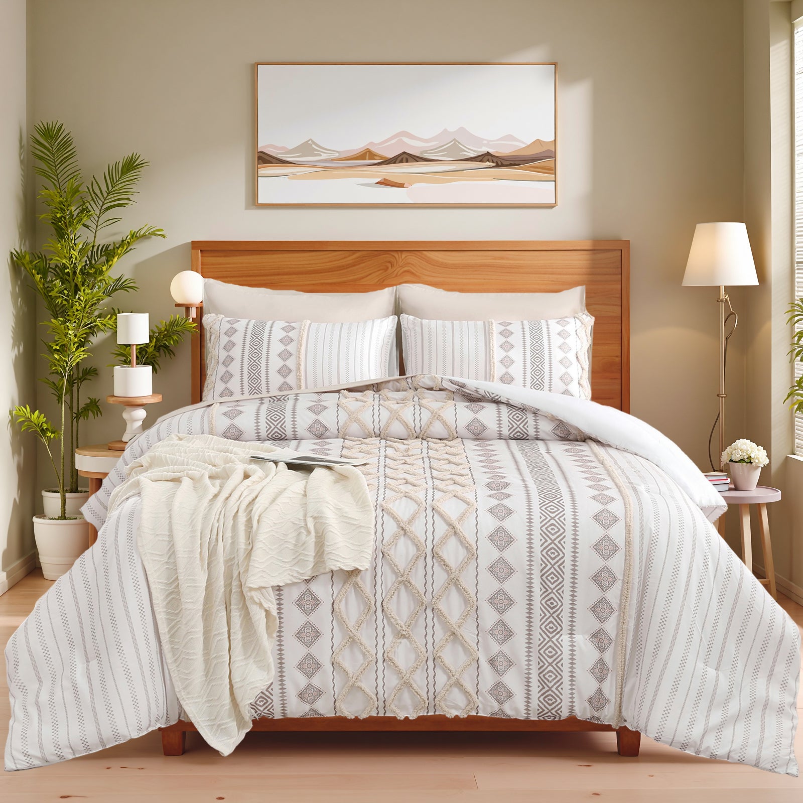 Tufted Boho Comforter Set Bed in a Bag – 7-Piece Aztec Farmhouse Bedding with Sheets & Pillowcases, Soft Microfiber Quilt, Full/Queen/King