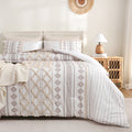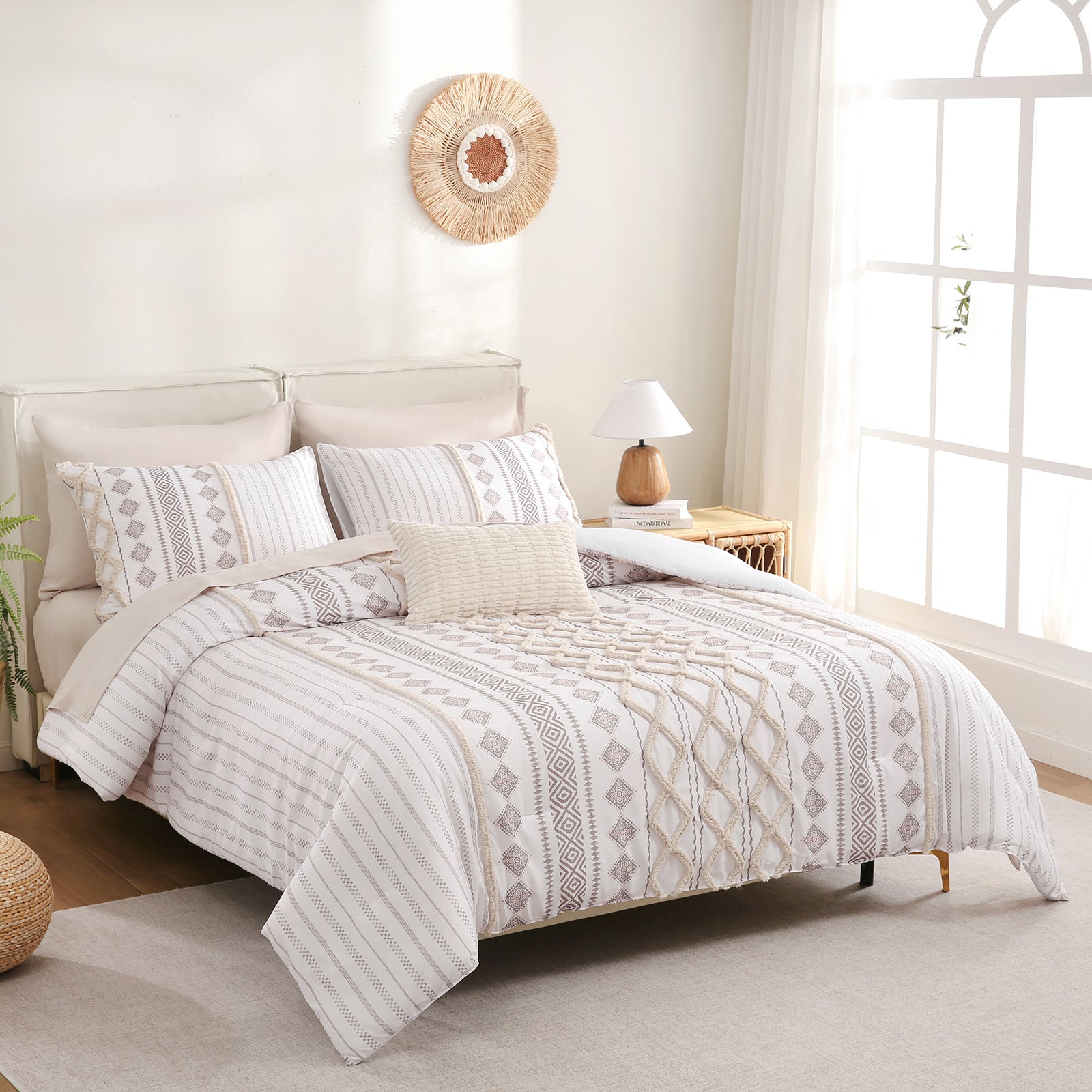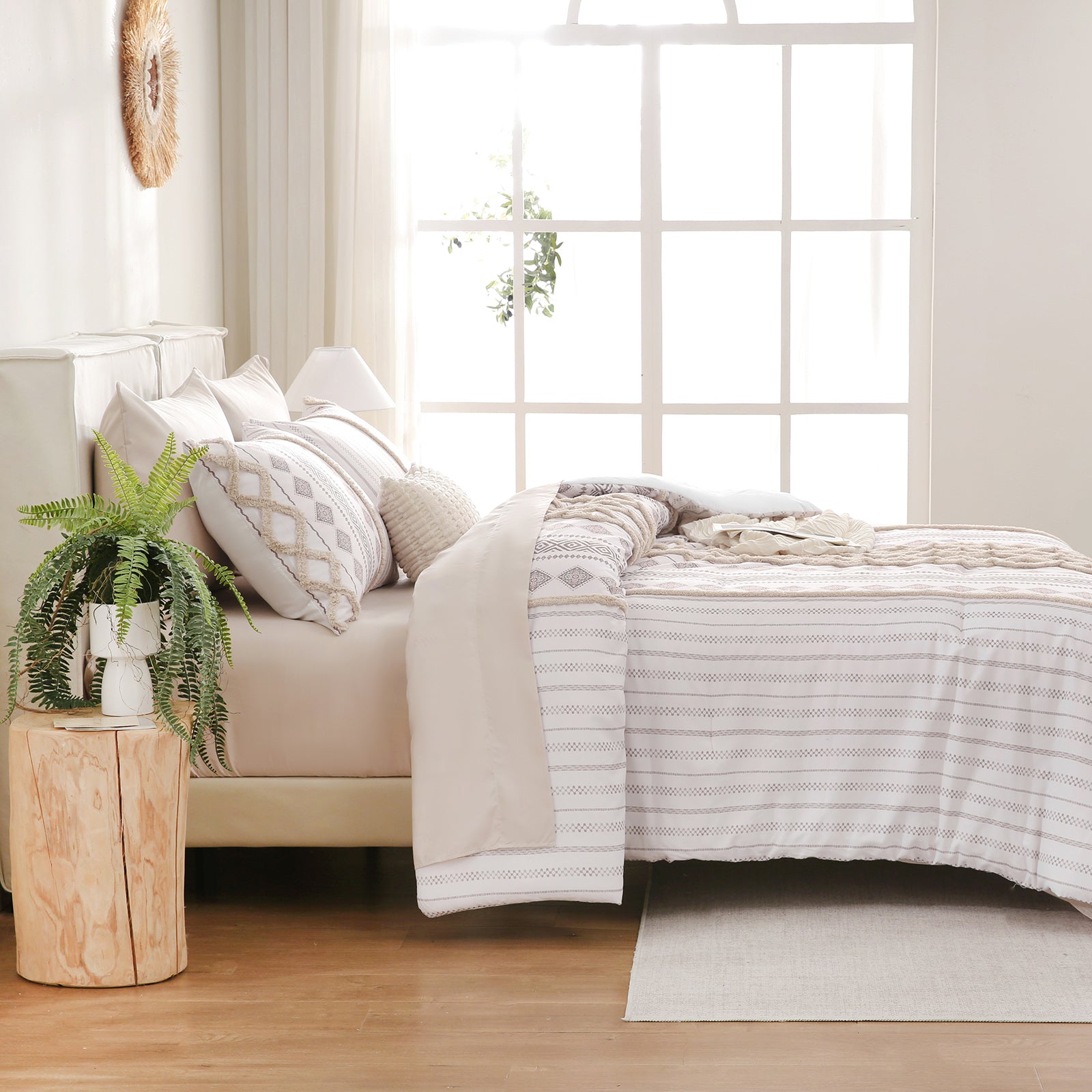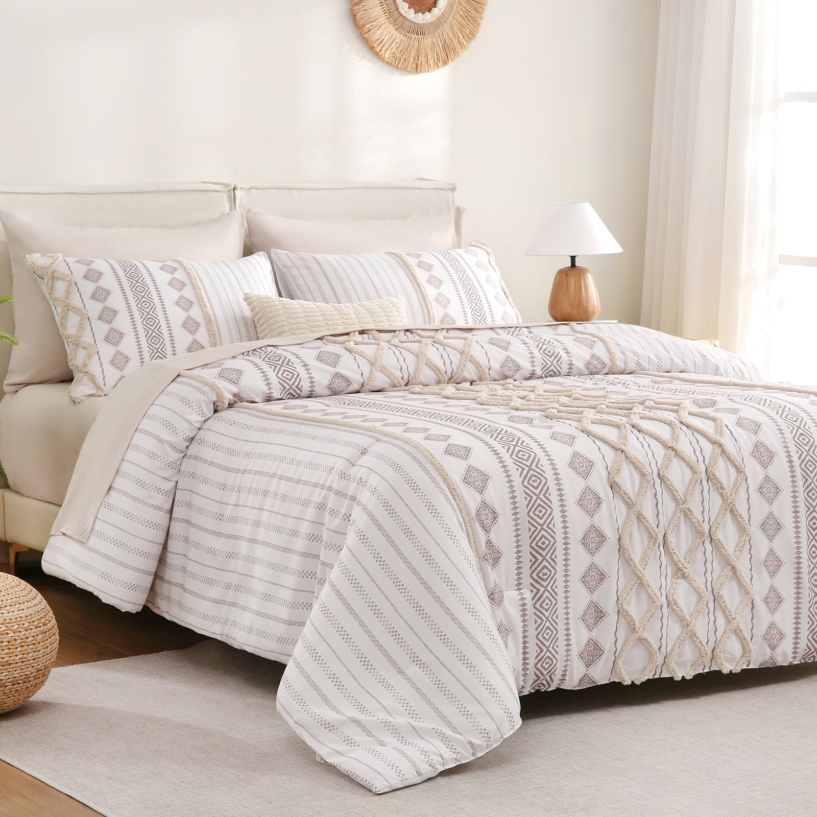 Tufted Boho Comforter Set Bed in a Bag – 7-Piece Aztec Farmhouse Bedding with Sheets & Pillowcases, Soft Microfiber Quilt, Full/Queen/King