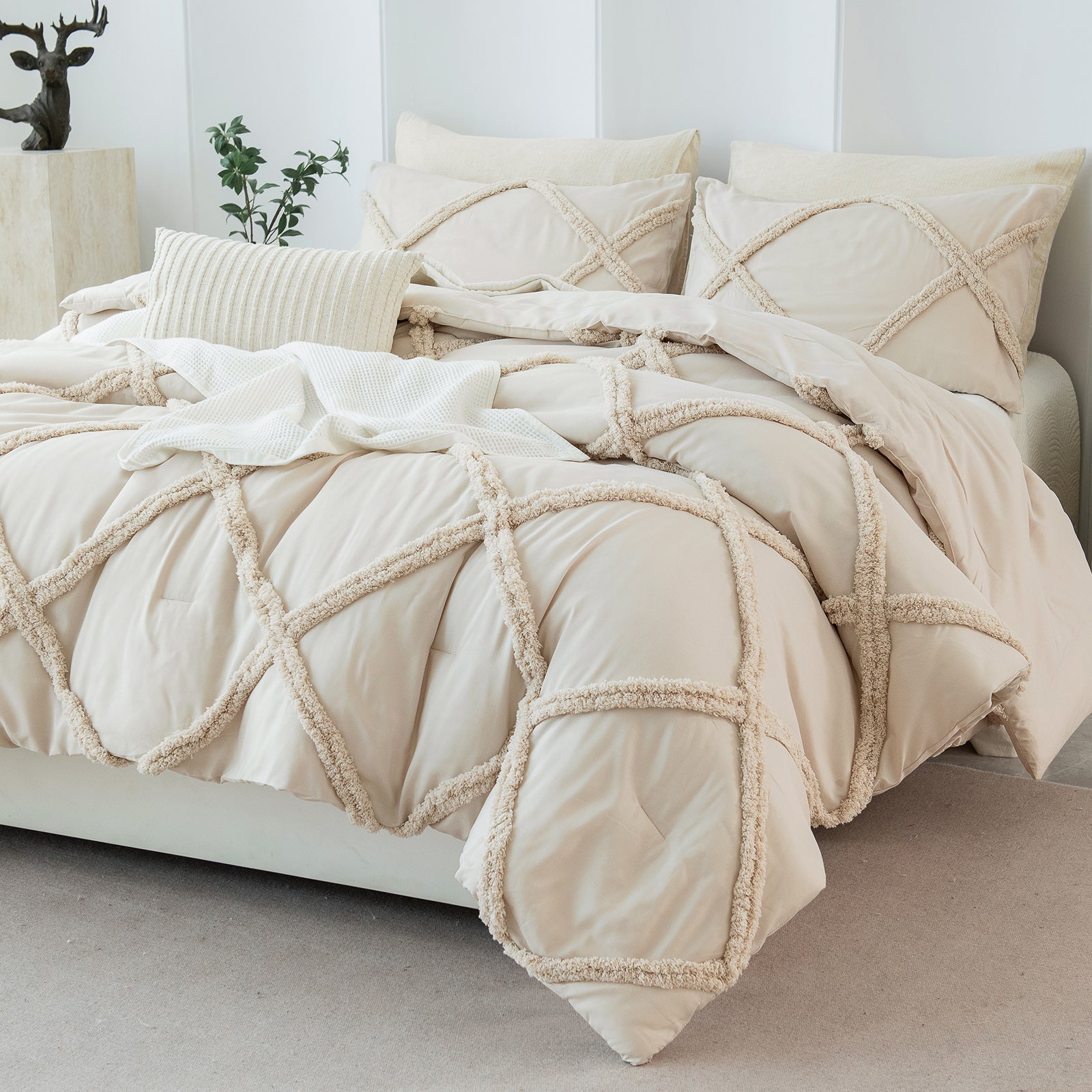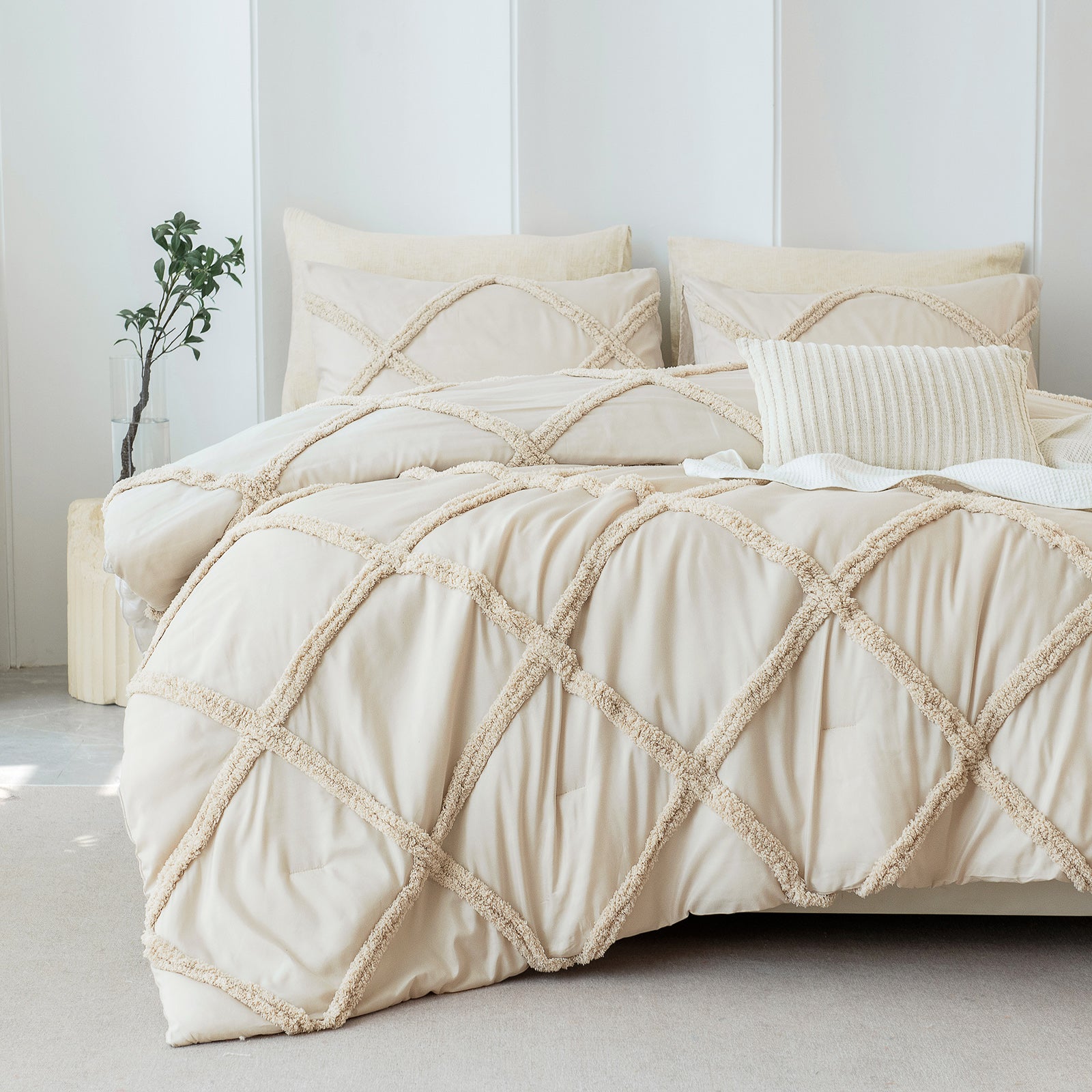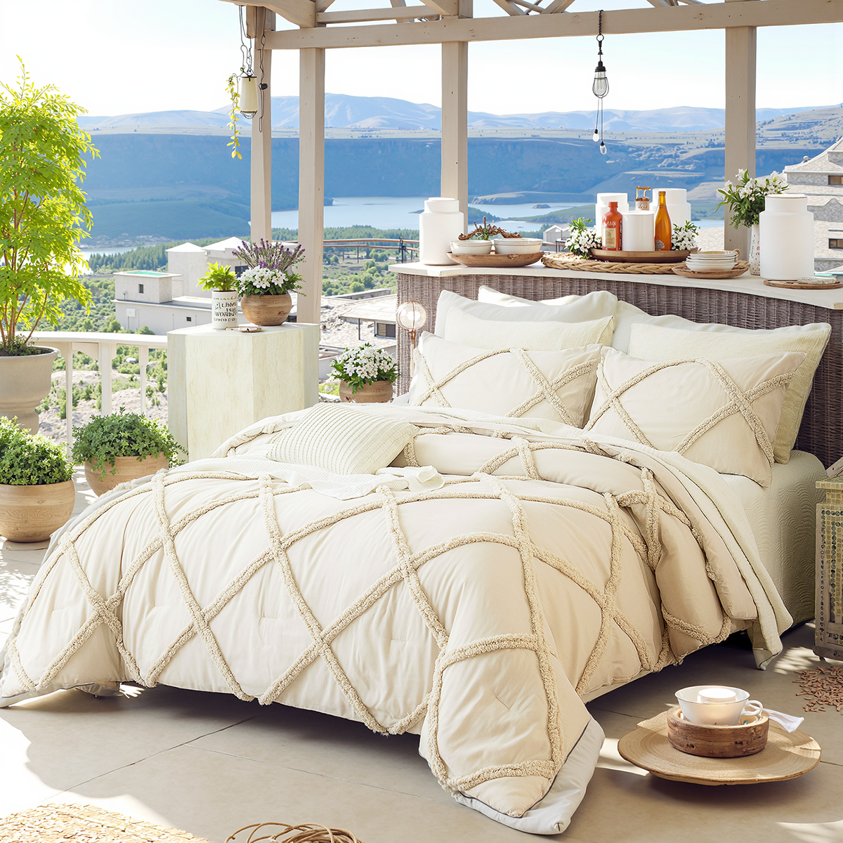 Refresh your bedroom with the Tufted Comforter Set, a perfect blend of farmhouse charm and modern boho elegance. Featuring a neutral tone with geometric tufted embroidery, this bedding set adds texture and sophistication while creating a cozy, welcoming atmosphere.