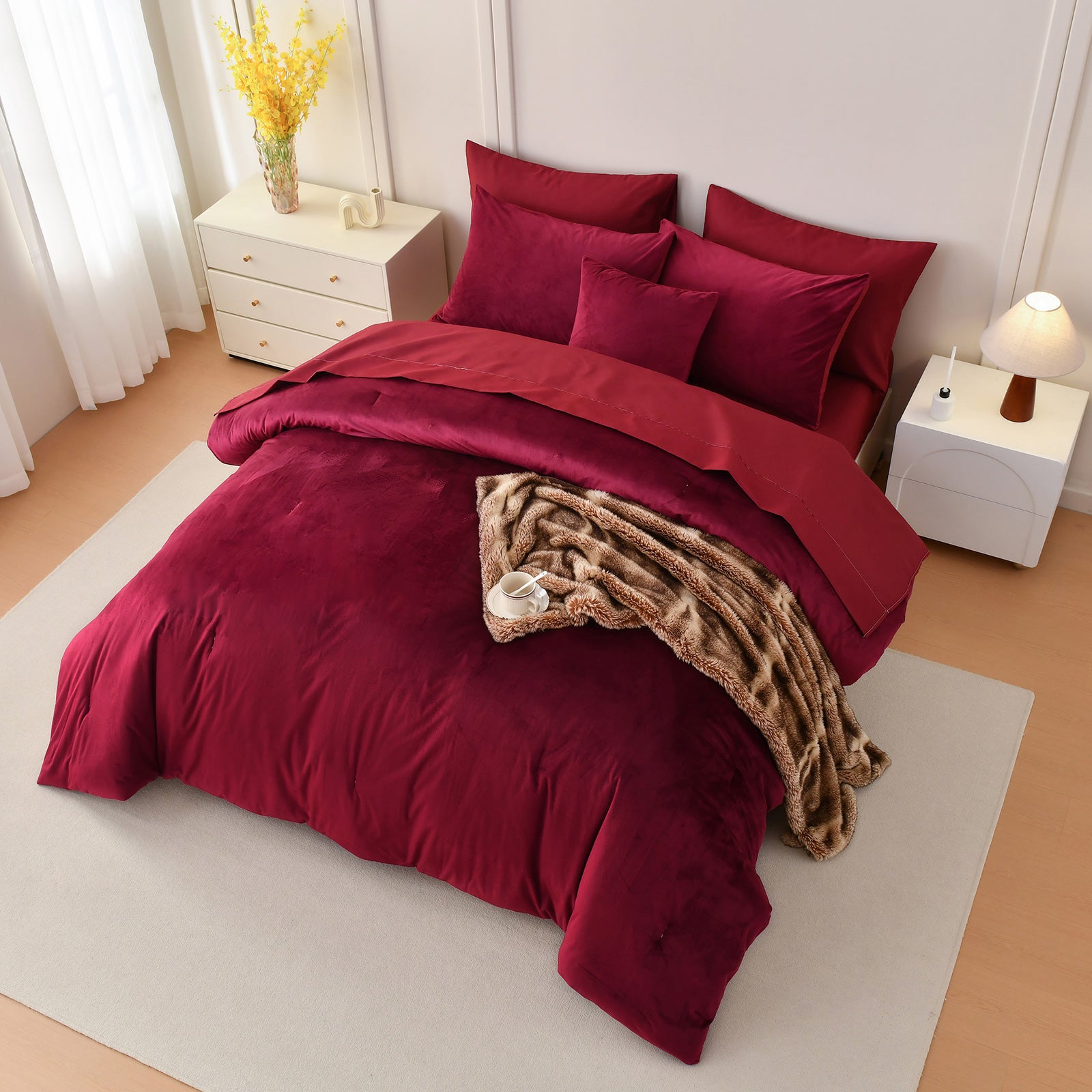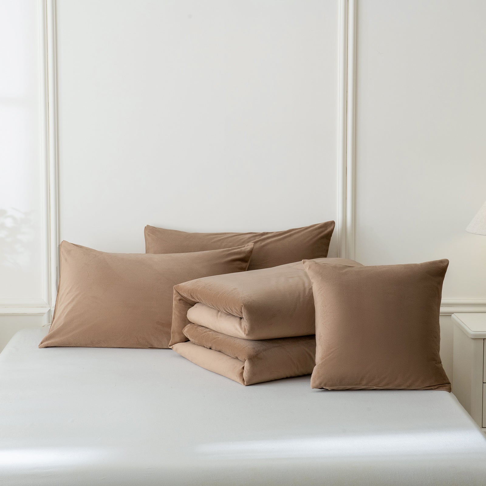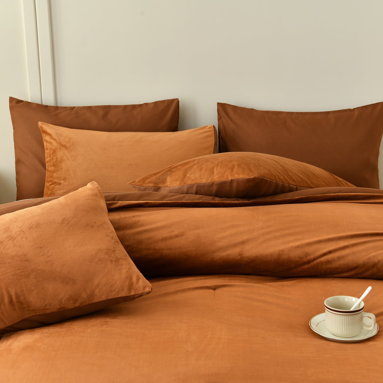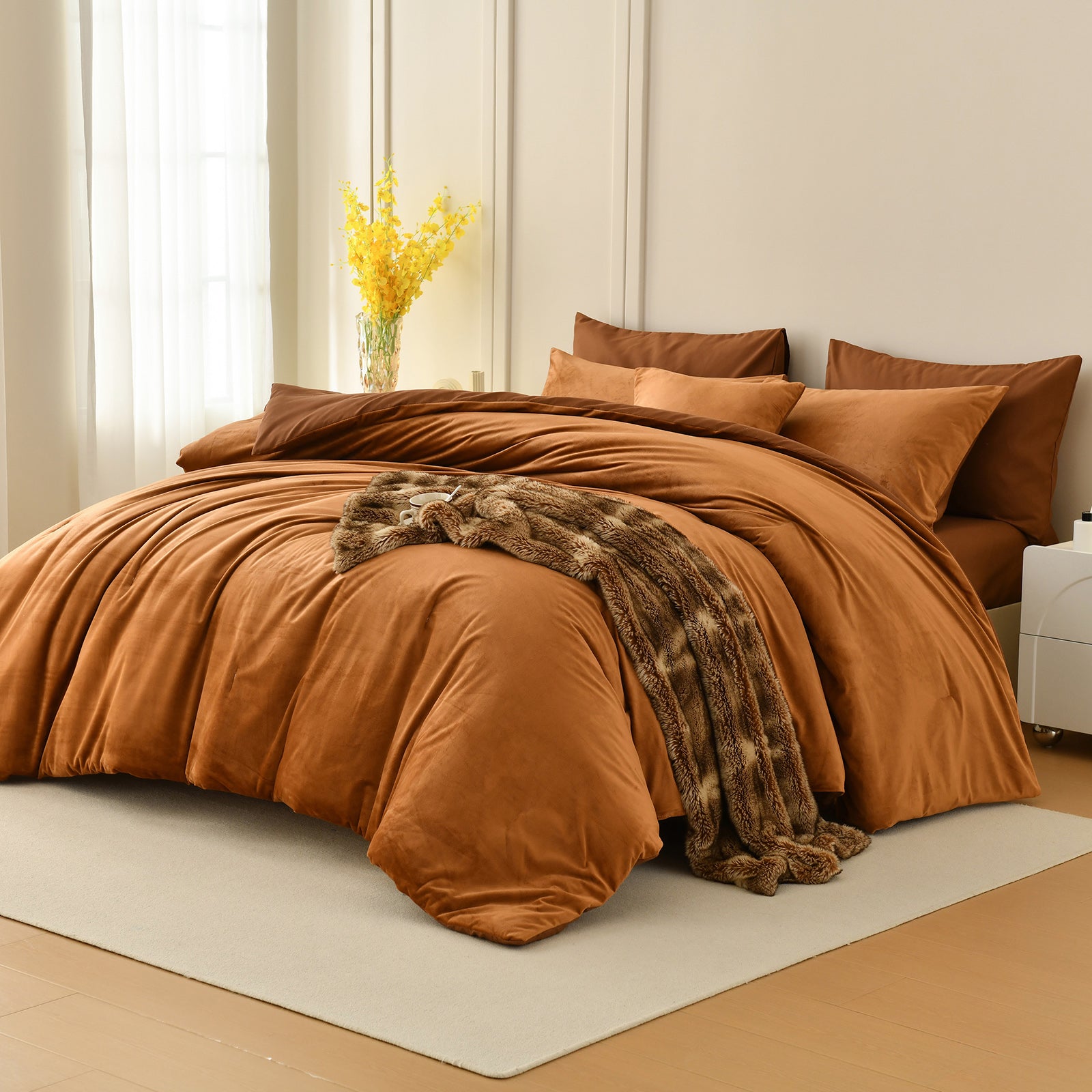 Each set includes a comforter, two matching velvet pillowcases, and a cushion cover for a complete, coordinated bed. Queen and King sizes are available for a perfect fit. The comforter feels fluffy and snug during colder seasons, while staying breathable enough for everyday use.