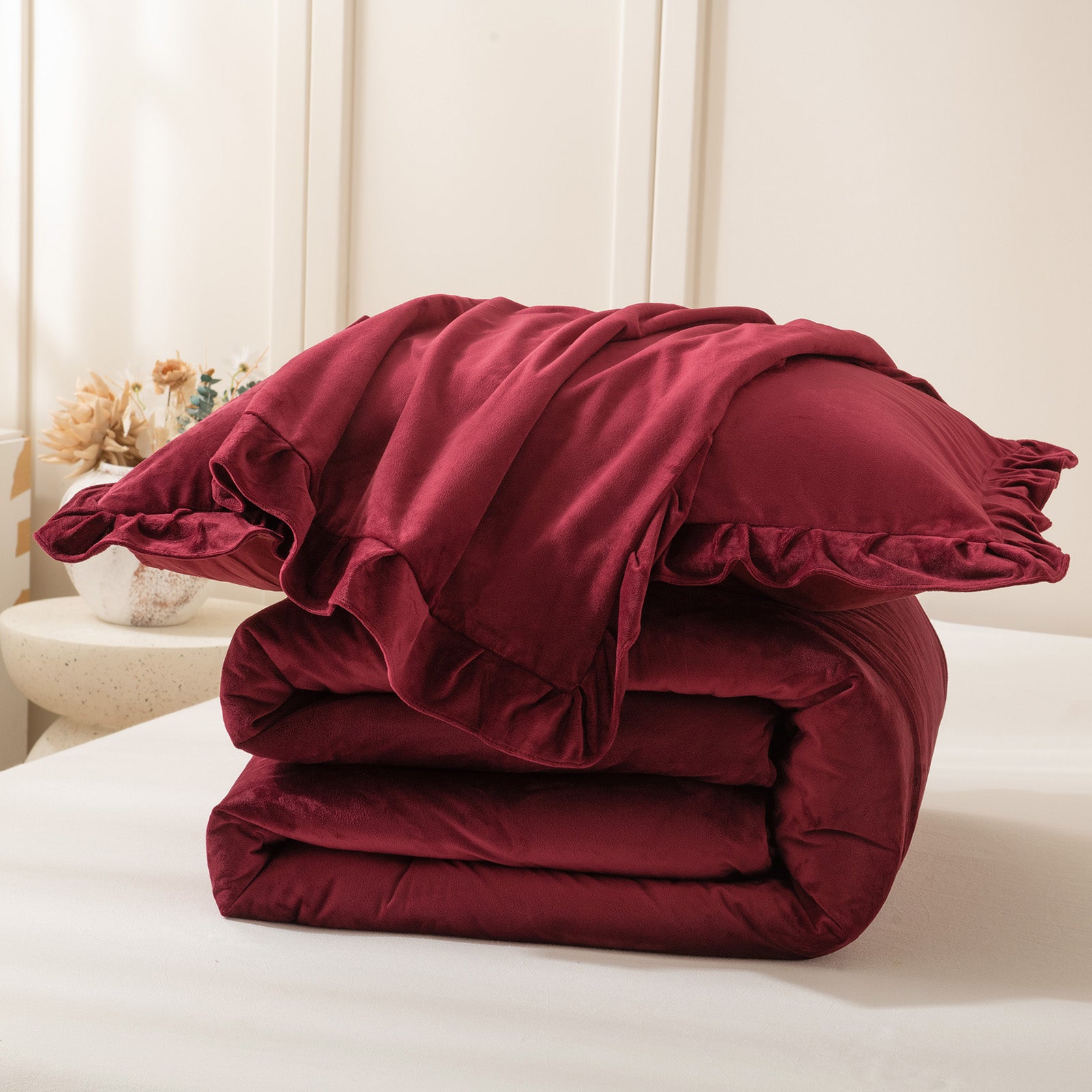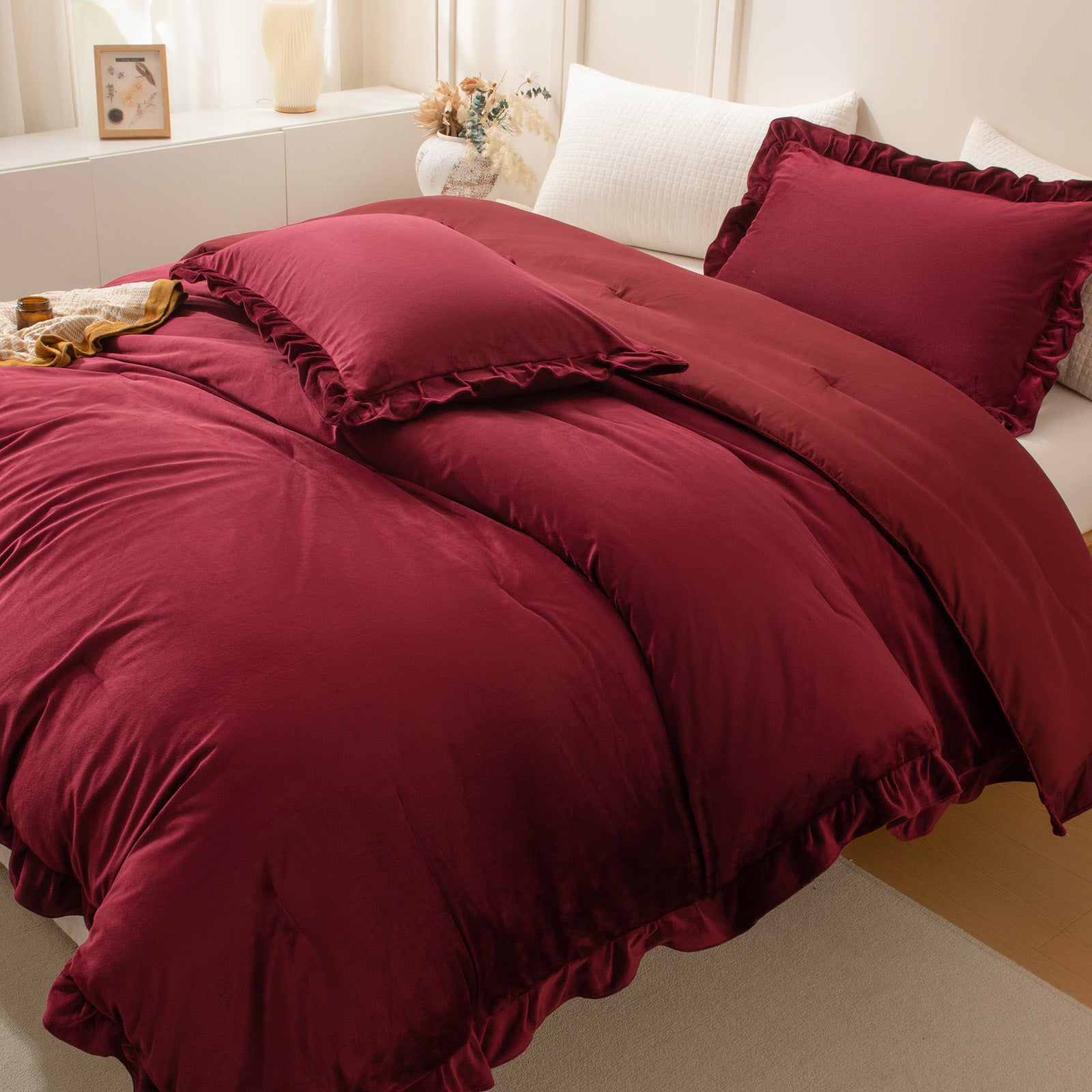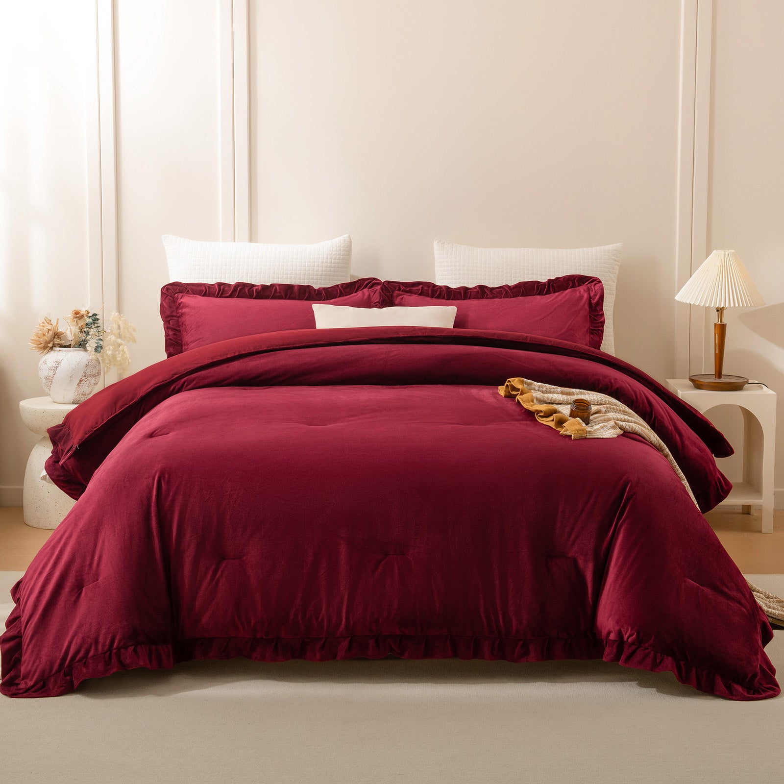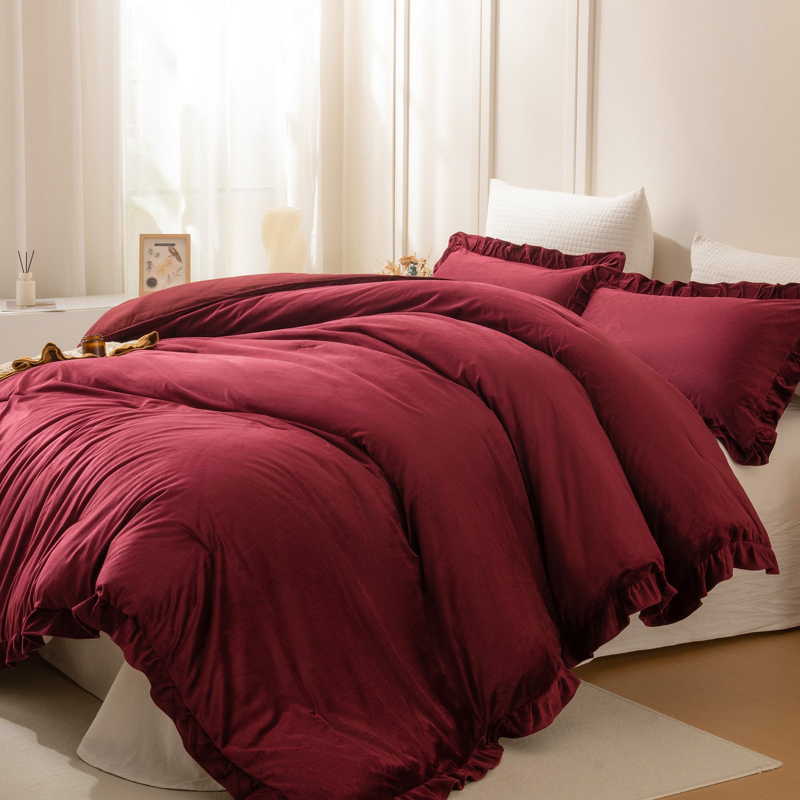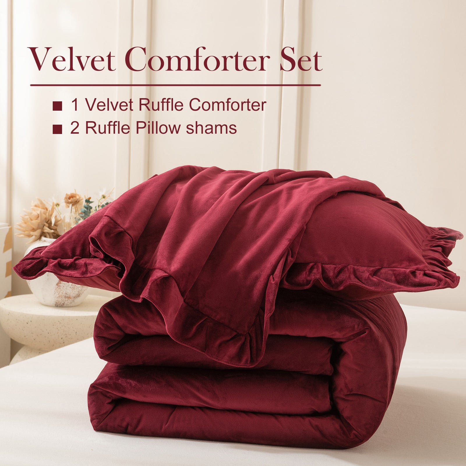 Velvet Ruffle Comforter Set – Soft Plush Bedding with Matching Pillowcases, Romantic Shabby Chic Style, Queen/King 3-Piece