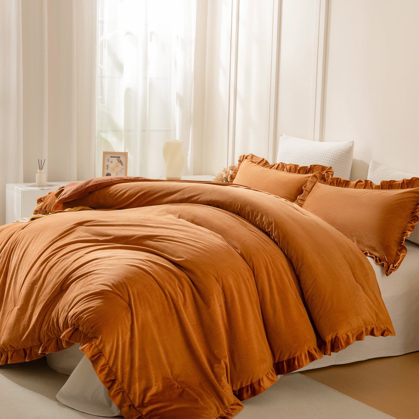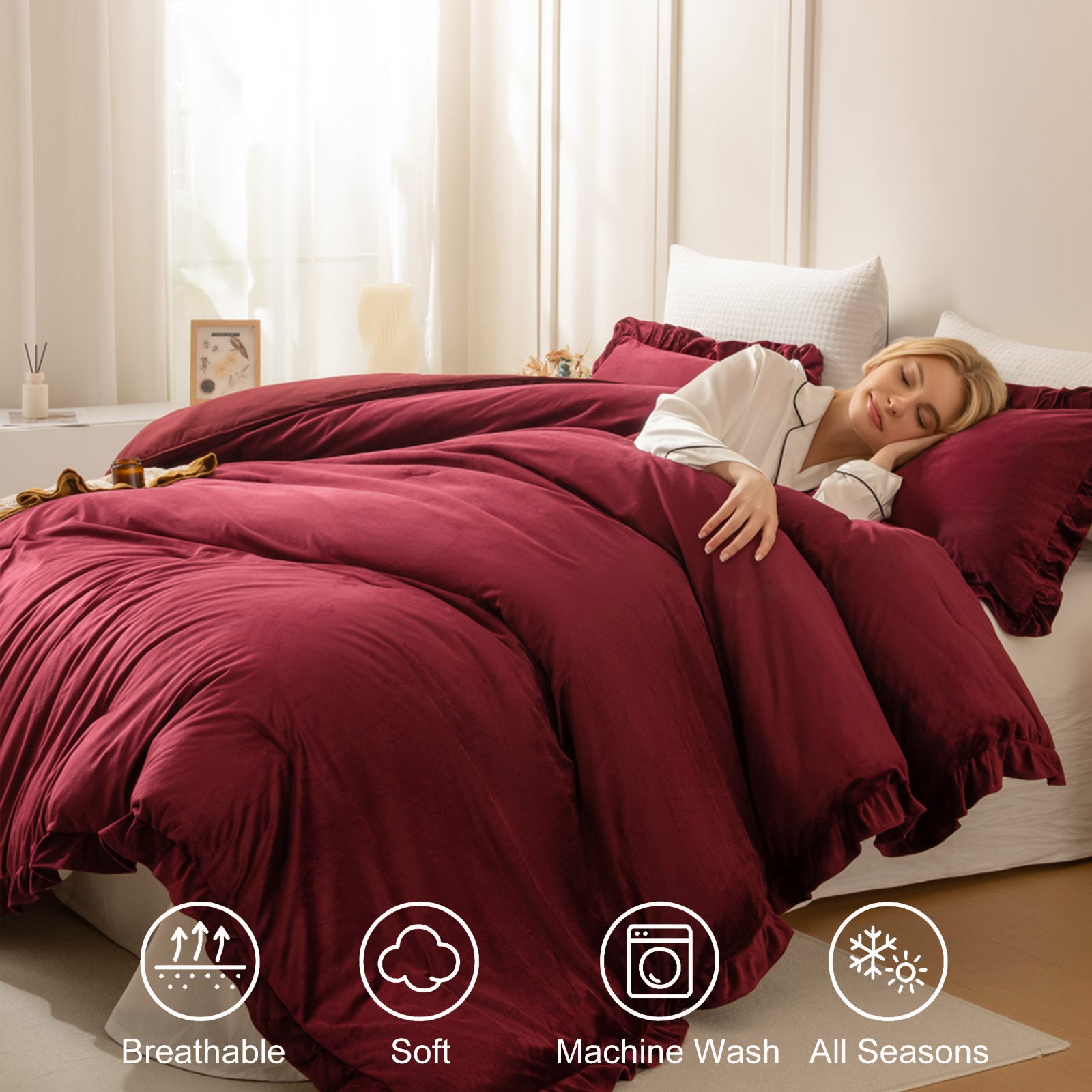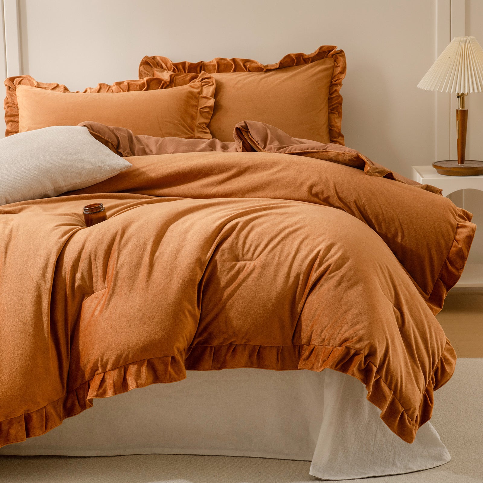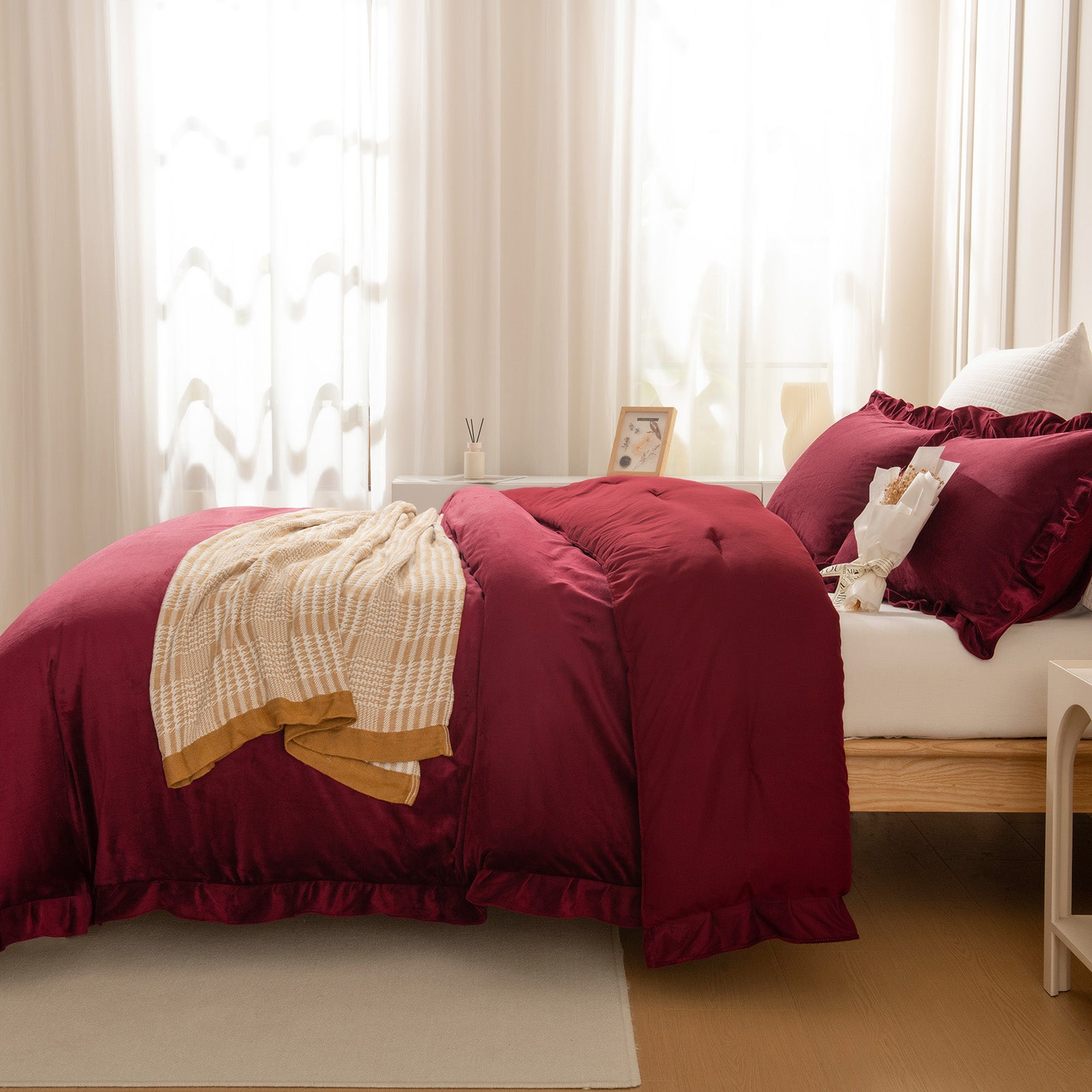 Velvet Ruffle Comforter Set – Soft Plush Bedding with Matching Pillowcases, Romantic Shabby Chic Style, Queen/King 3-Piece