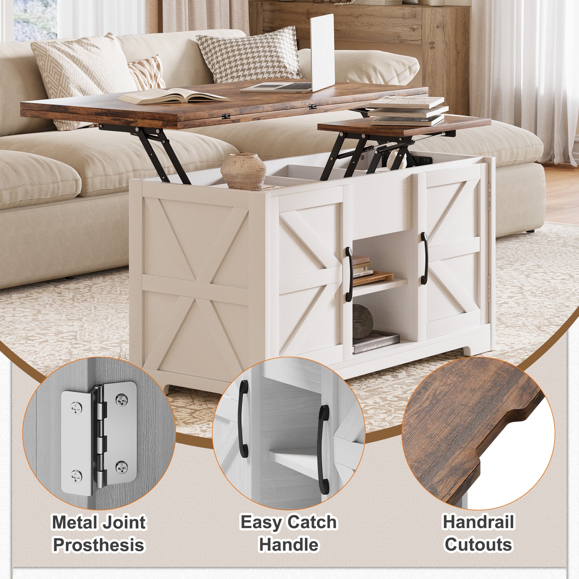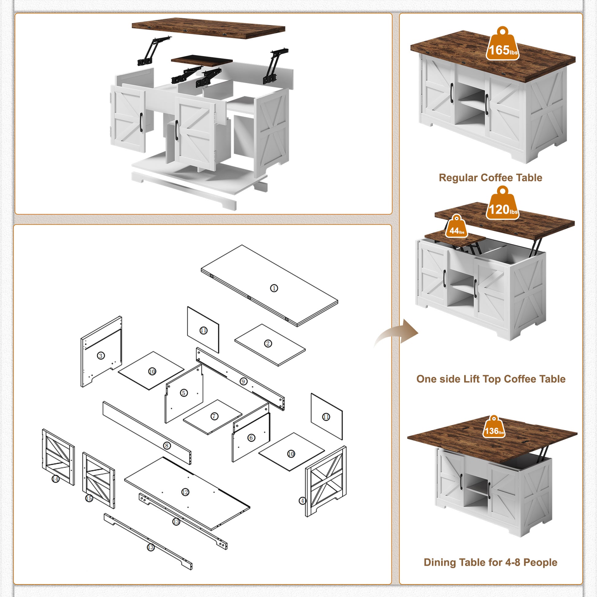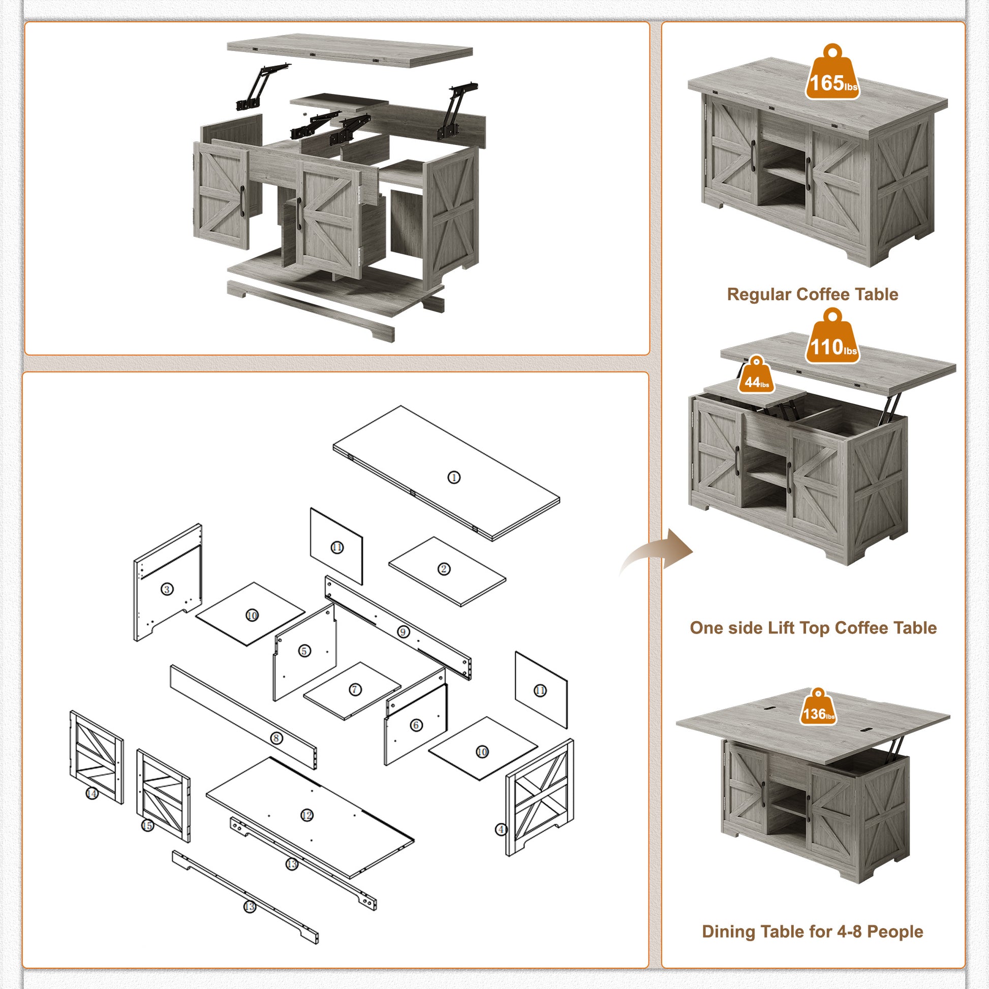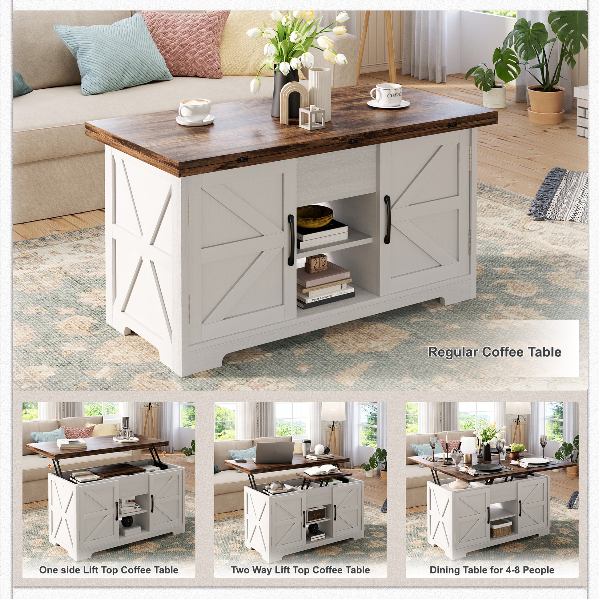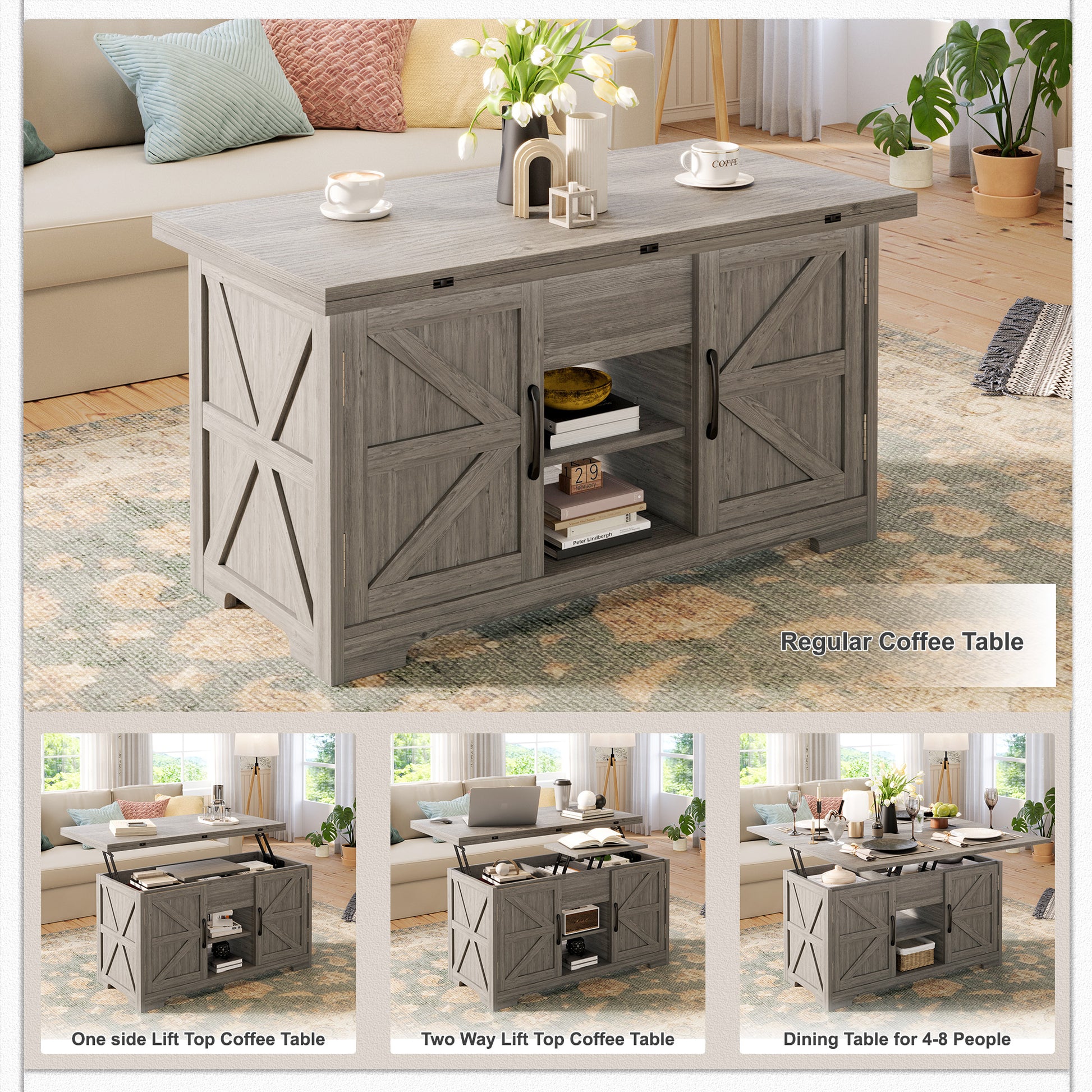 4-in-1 Lift-Top Coffee Table - Adjustable Height Table for Dining & Working Meet your new favorite piece of furniture: the versatile 4-in-1 lift-top coffee table. It seamlessly transitions from a classic coffee table to a spacious dining or gaming table for up to 8 people, or a dual work desk. A high-performance gas lift mechanism ensures a smooth, quiet transition. The generous top hides a spacious hidden compartment for blankets and games, while side cabinets offer extra storage. Its farmhouse style, complete with barn doors and a weathered finish, adds rustic charm and function to your living room.