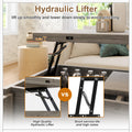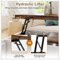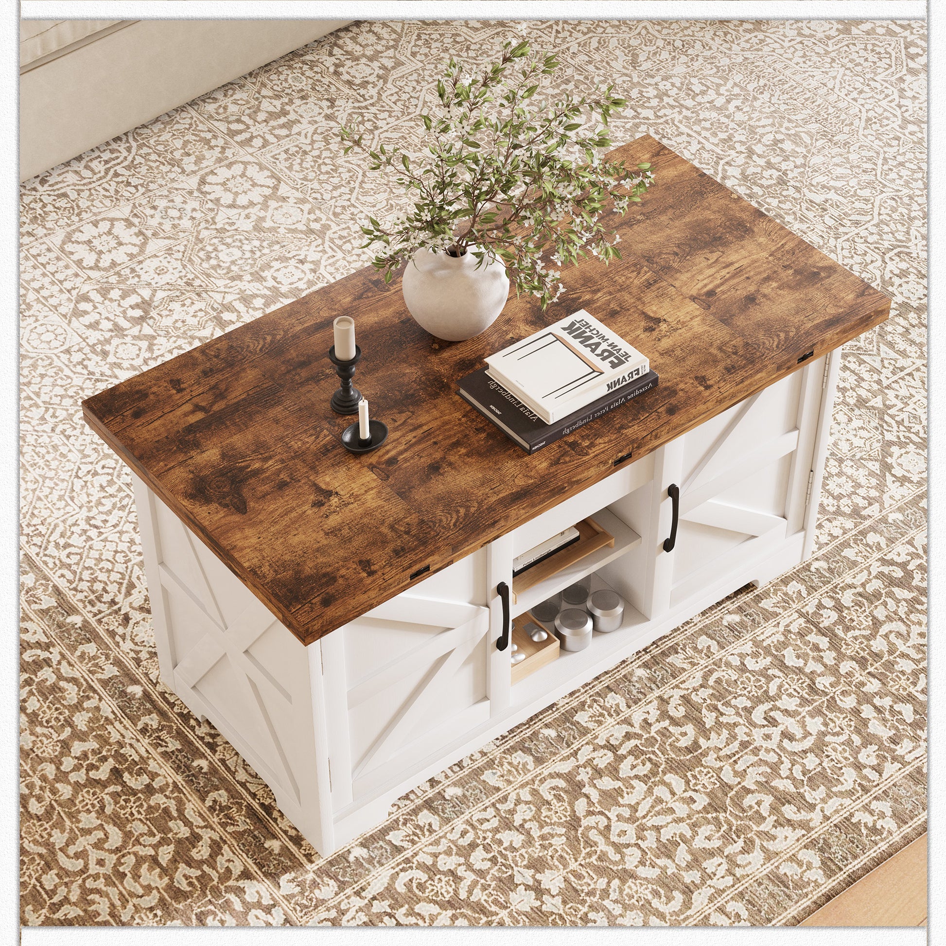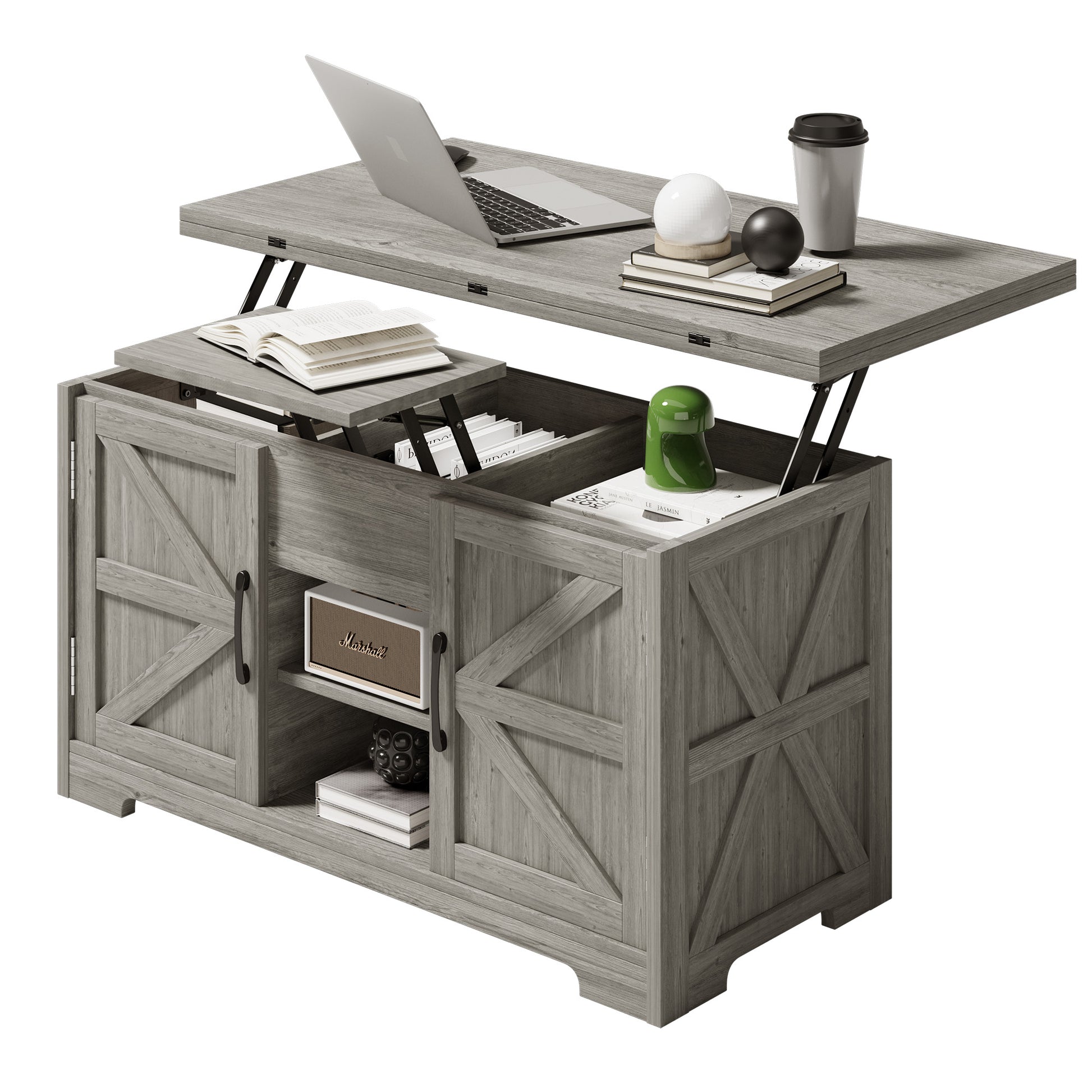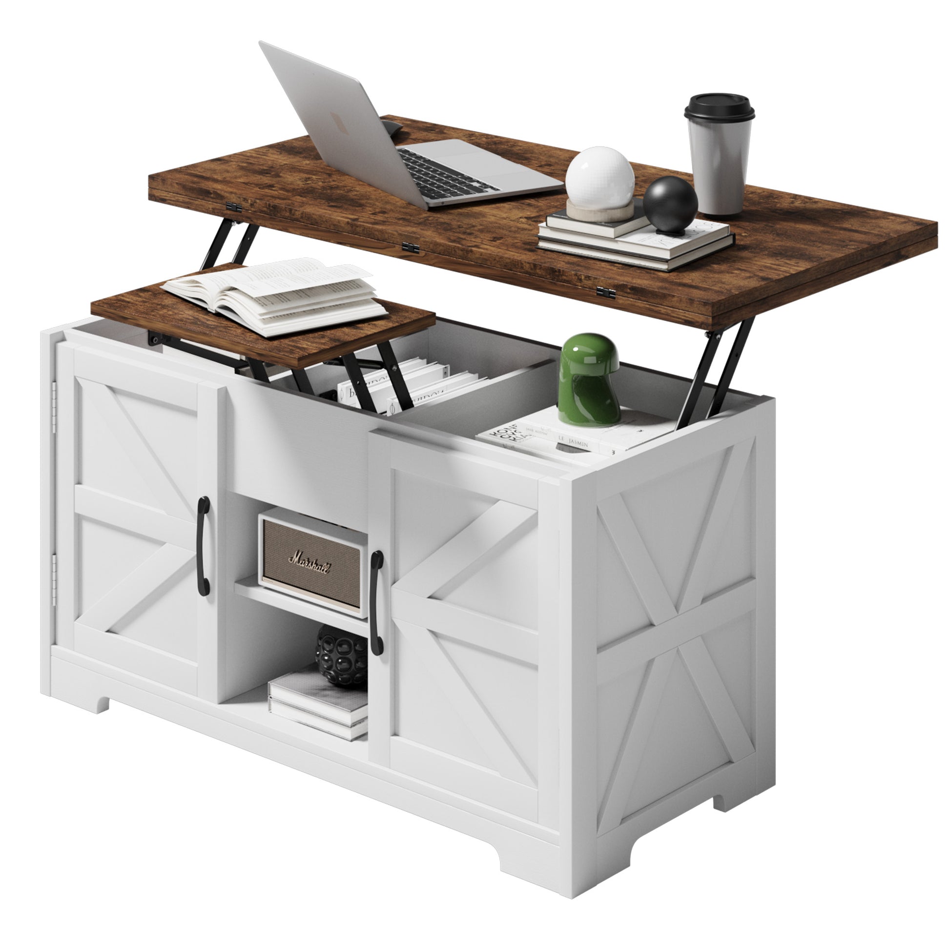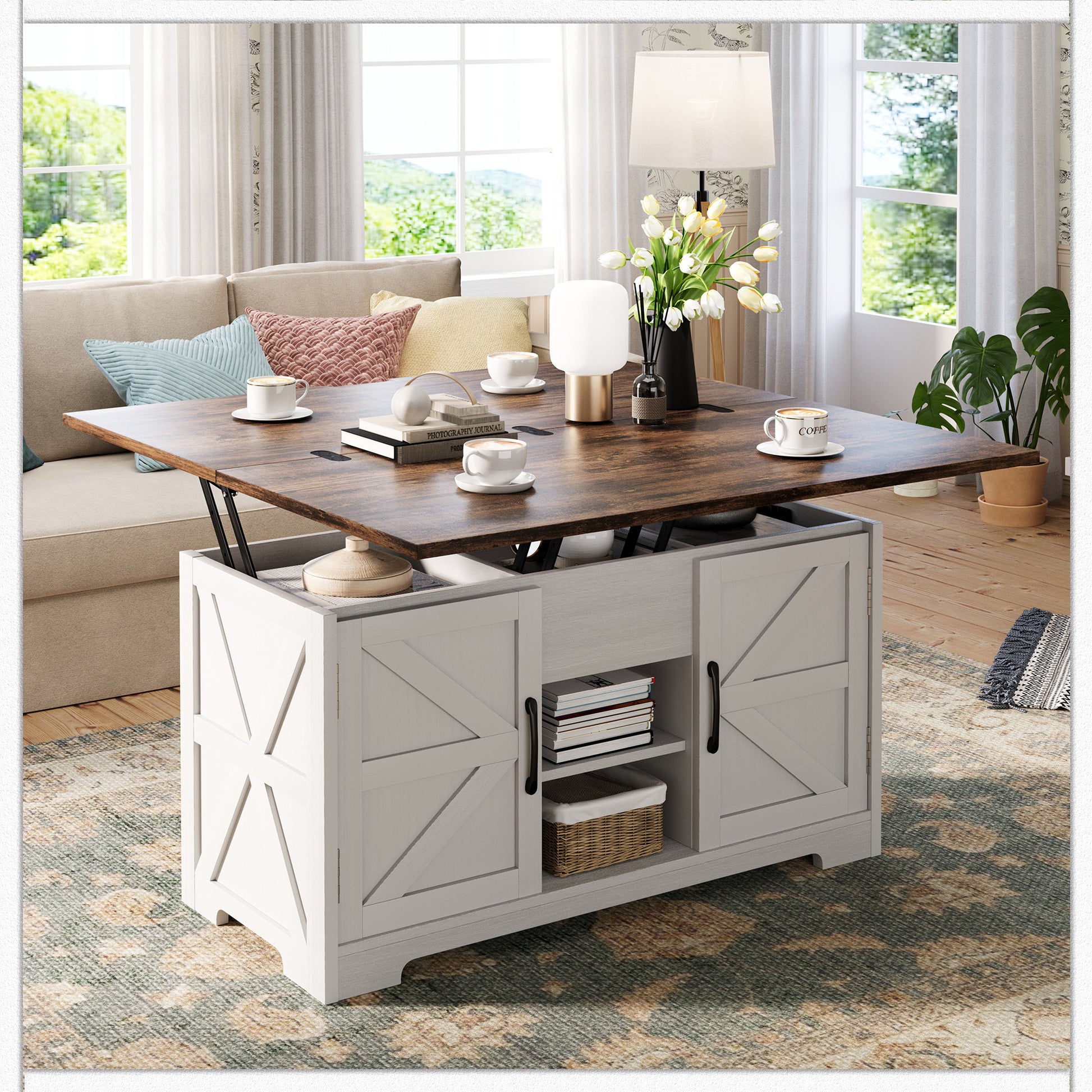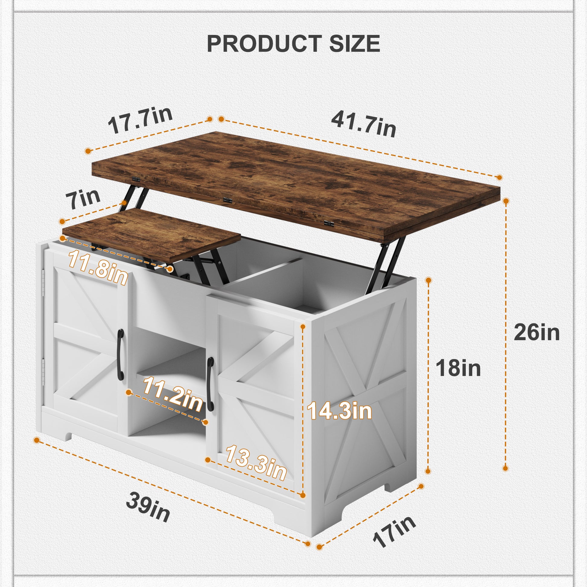 4-in-1 Lift-Top Coffee Table - Adjustable Height Table for Dining & Working Meet your new favorite piece of furniture: the versatile 4-in-1 lift-top coffee table. It seamlessly transitions from a classic coffee table to a spacious dining or gaming table for up to 8 people, or a dual work desk. A high-performance gas lift mechanism ensures a smooth, quiet transition. The generous top hides a spacious hidden compartment for blankets and games, while side cabinets offer extra storage. Its farmhouse style, complete with barn doors and a weathered finish, adds rustic charm and function to your living room.