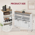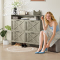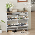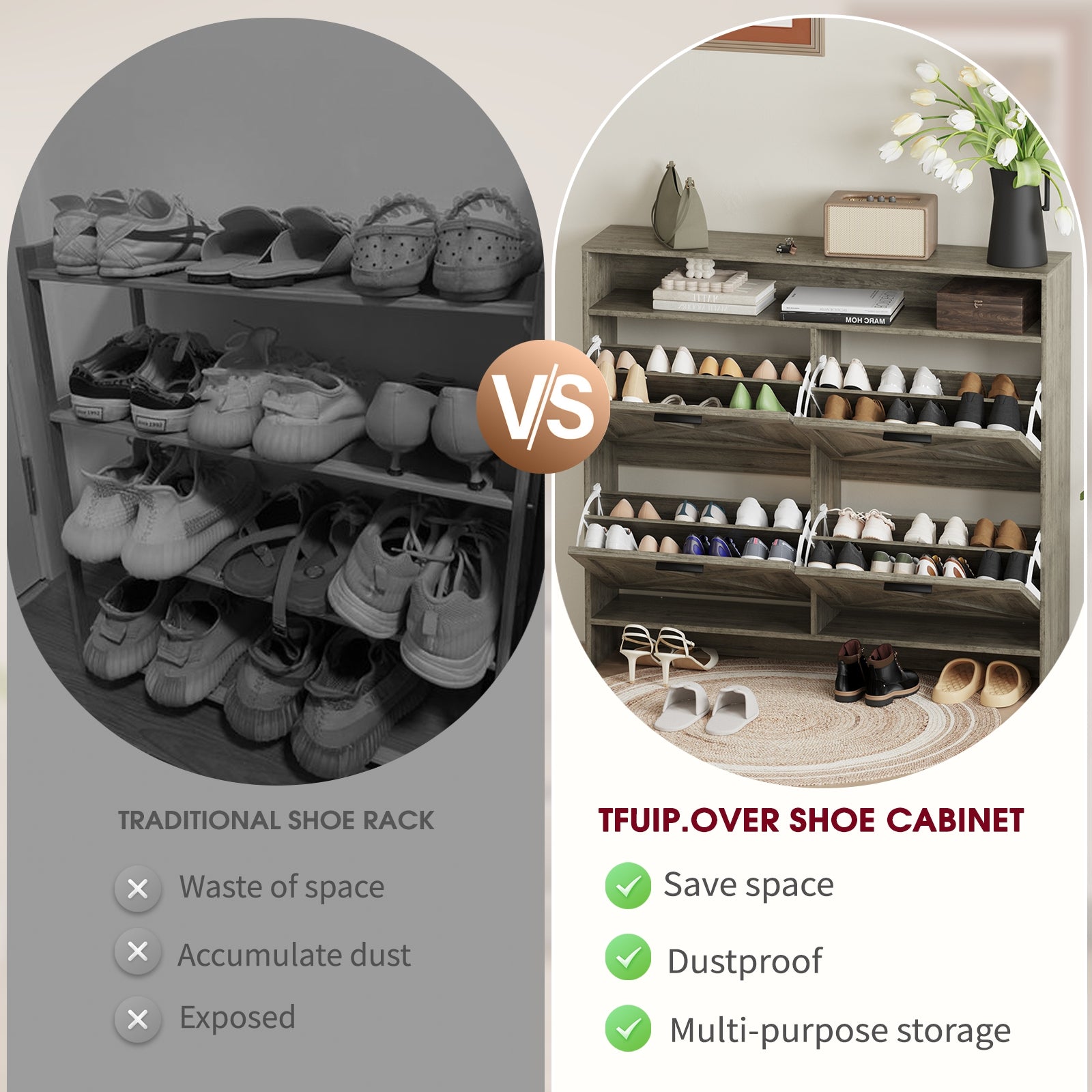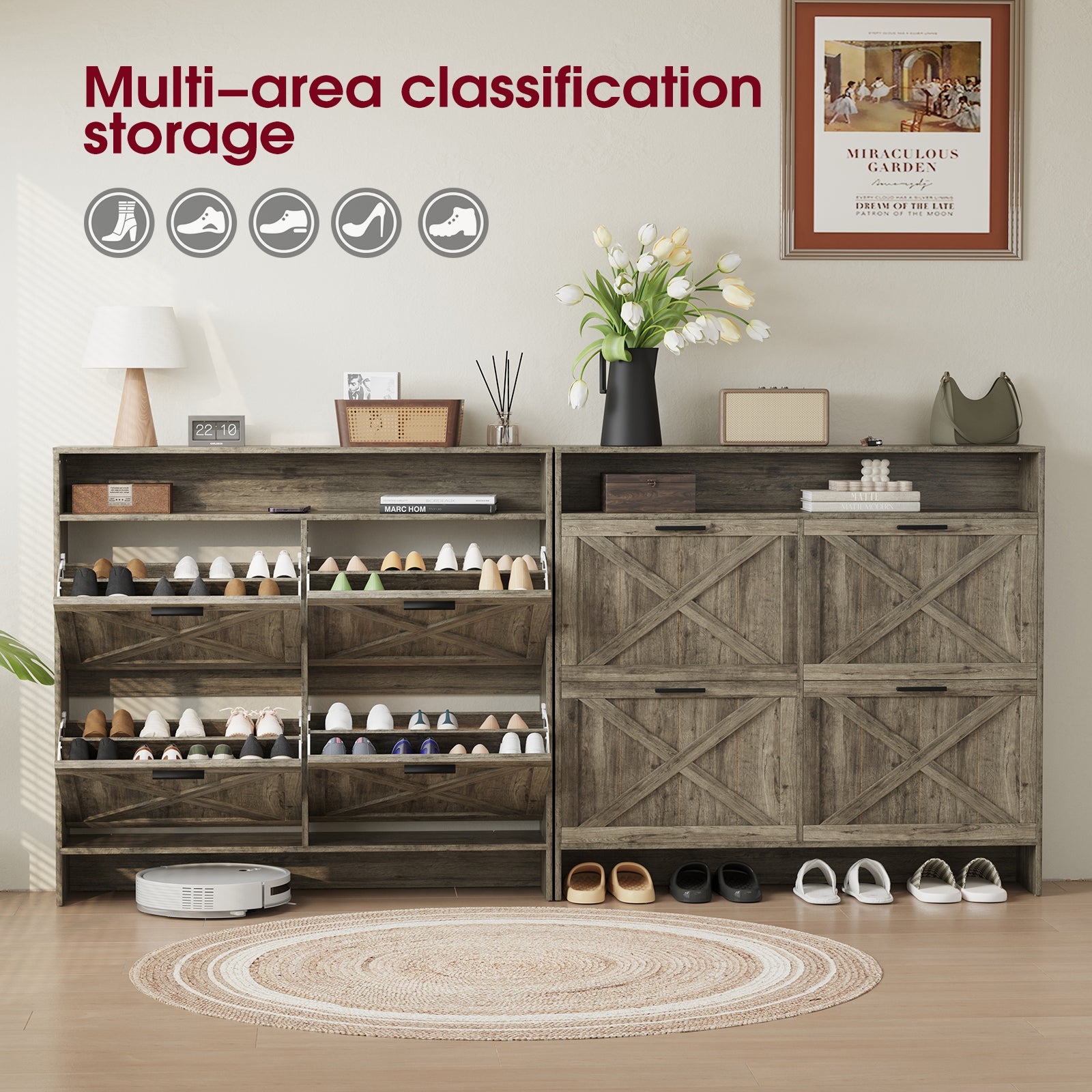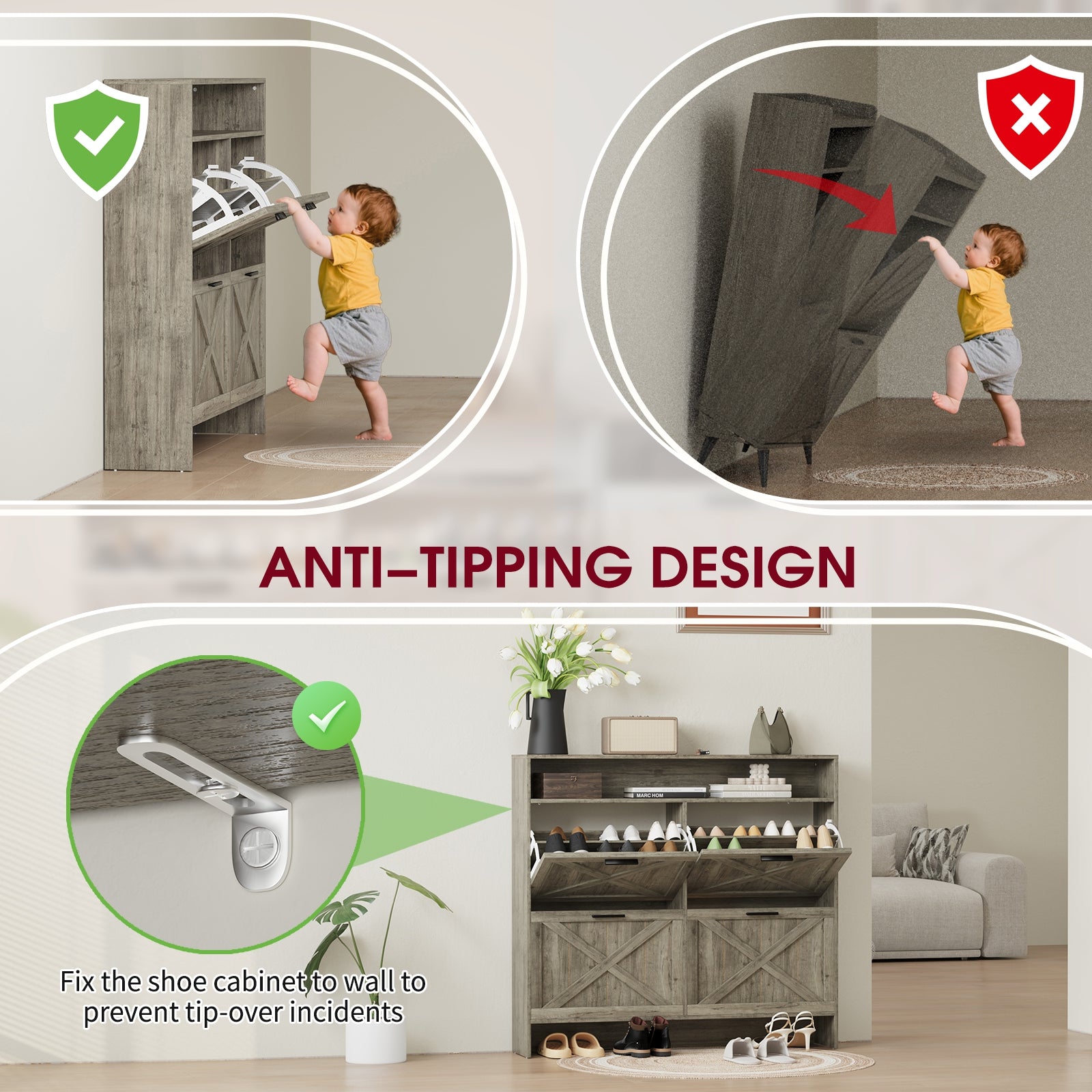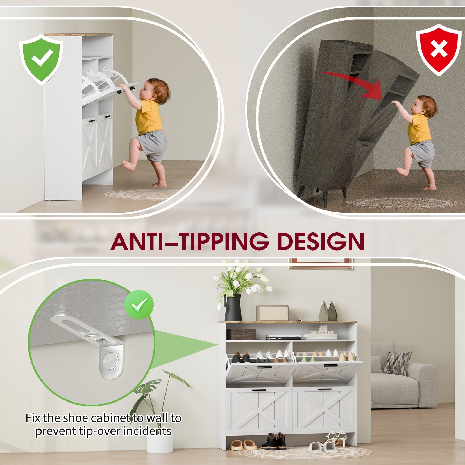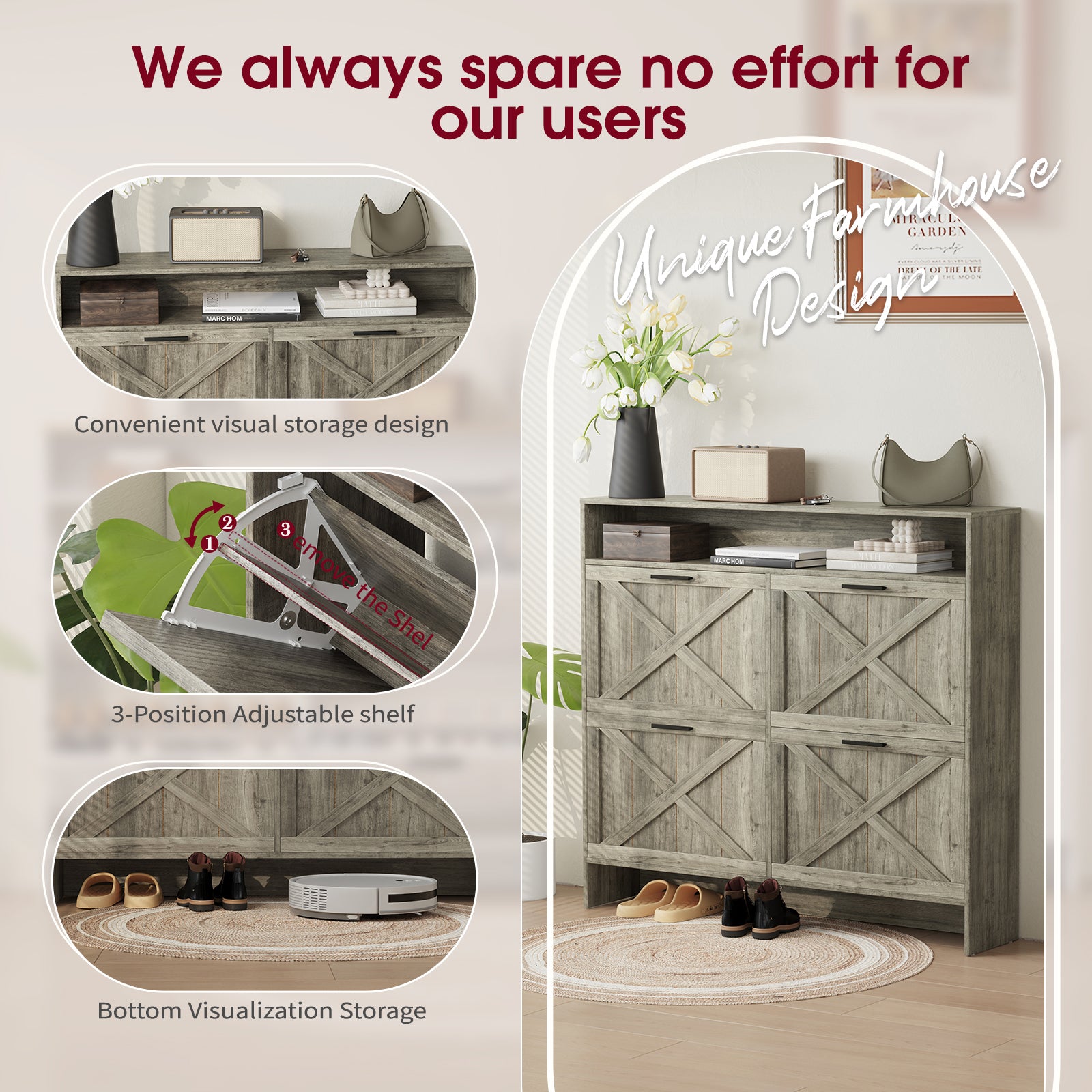 Farmhouse Flip-Out Shoe Cabinet with Adjustable Shelves - Space-Saving Shoe Organizer This charming farmhouse flip-out shoe cabinet is the perfect blend of style and smart storage. The distinctive cross-brace design adds rustic appeal while hiding up to 16 pairs of shoes behind four dedicated compartments. The adjustable shelves can be moved or removed to fit everything from tall boots to flats. Crafted with a secure anti-tip design and sturdy legs, it’s a safe and reliable piece for any entryway. The convenient top surface is perfect for keys and everyday essentials, ensuring you start and end your day organized.