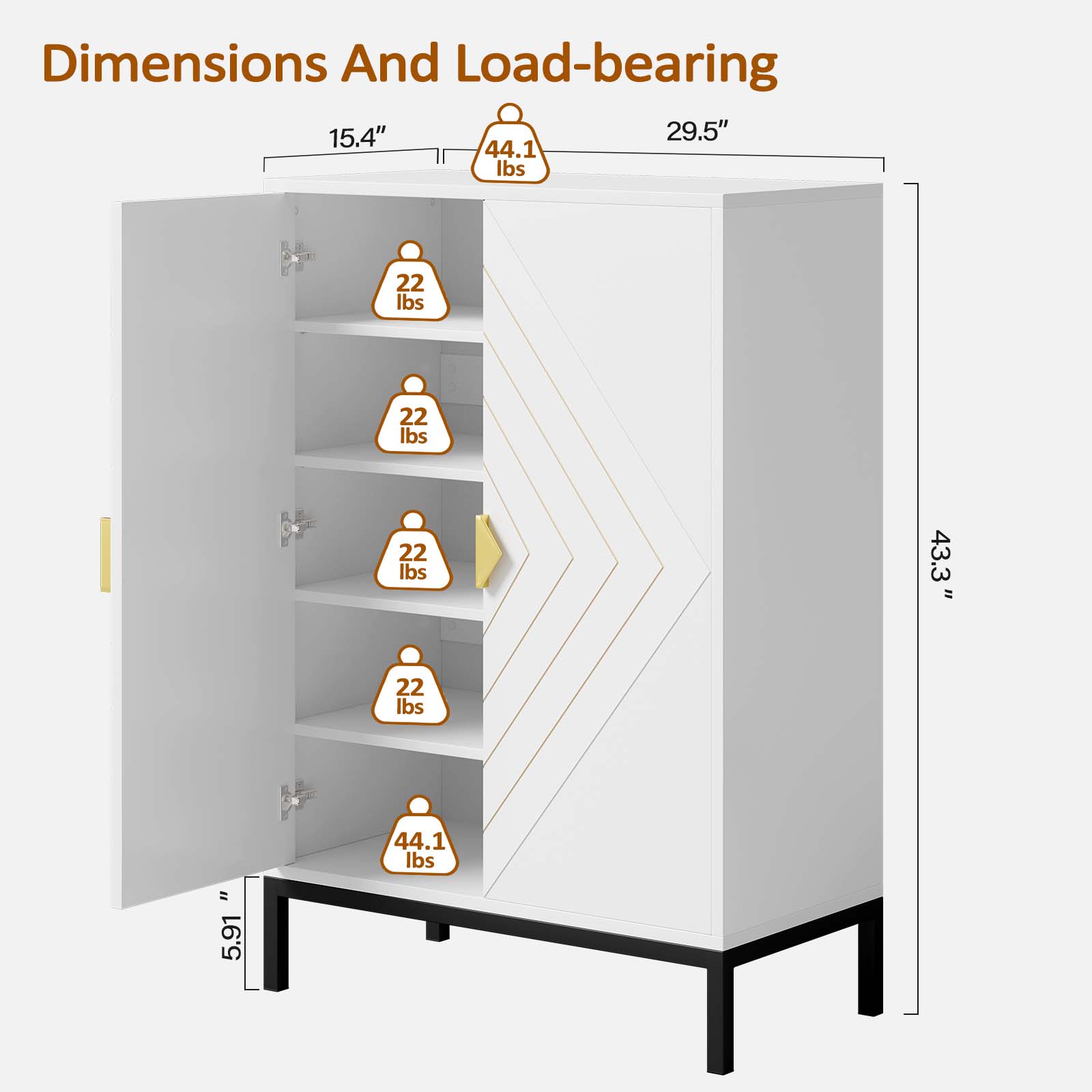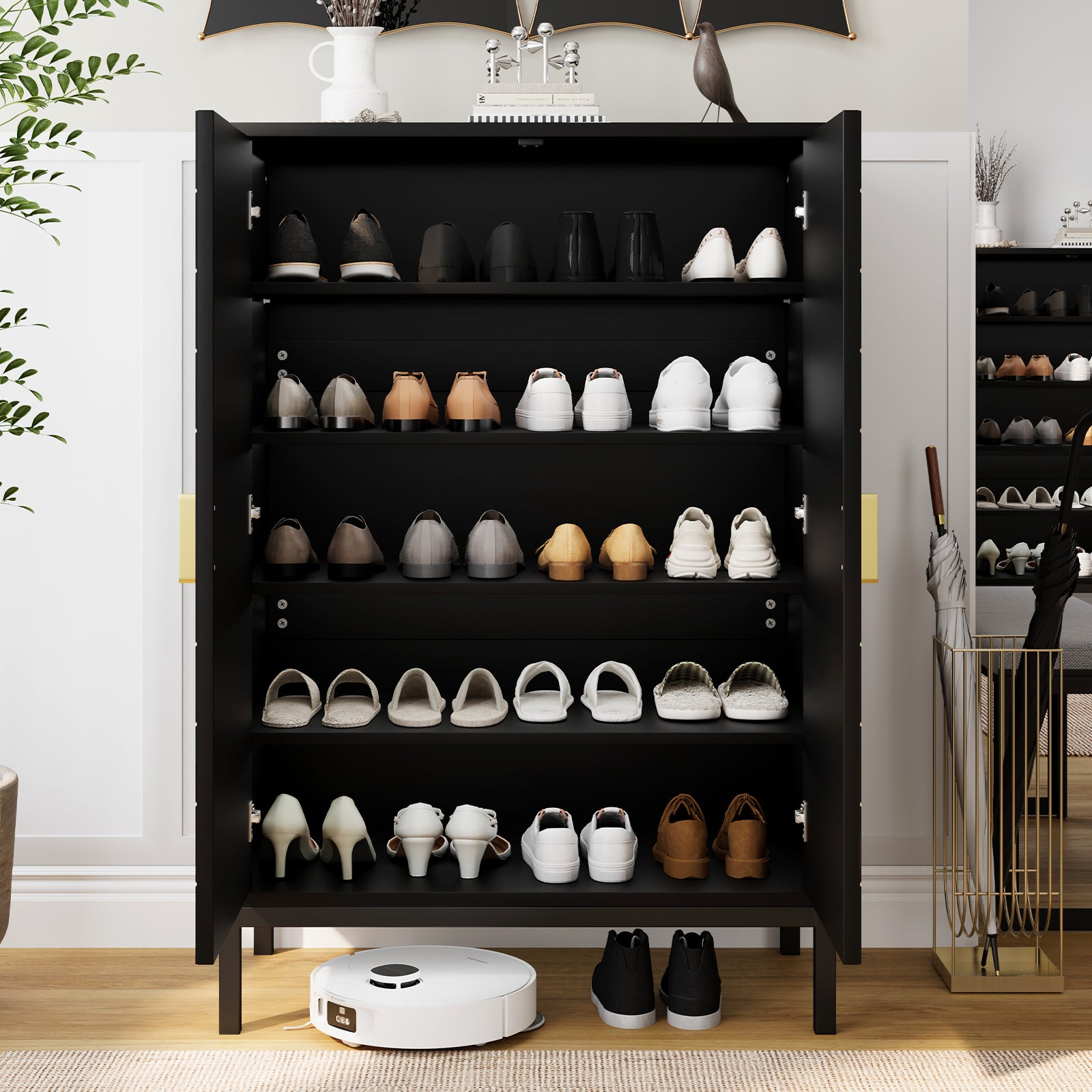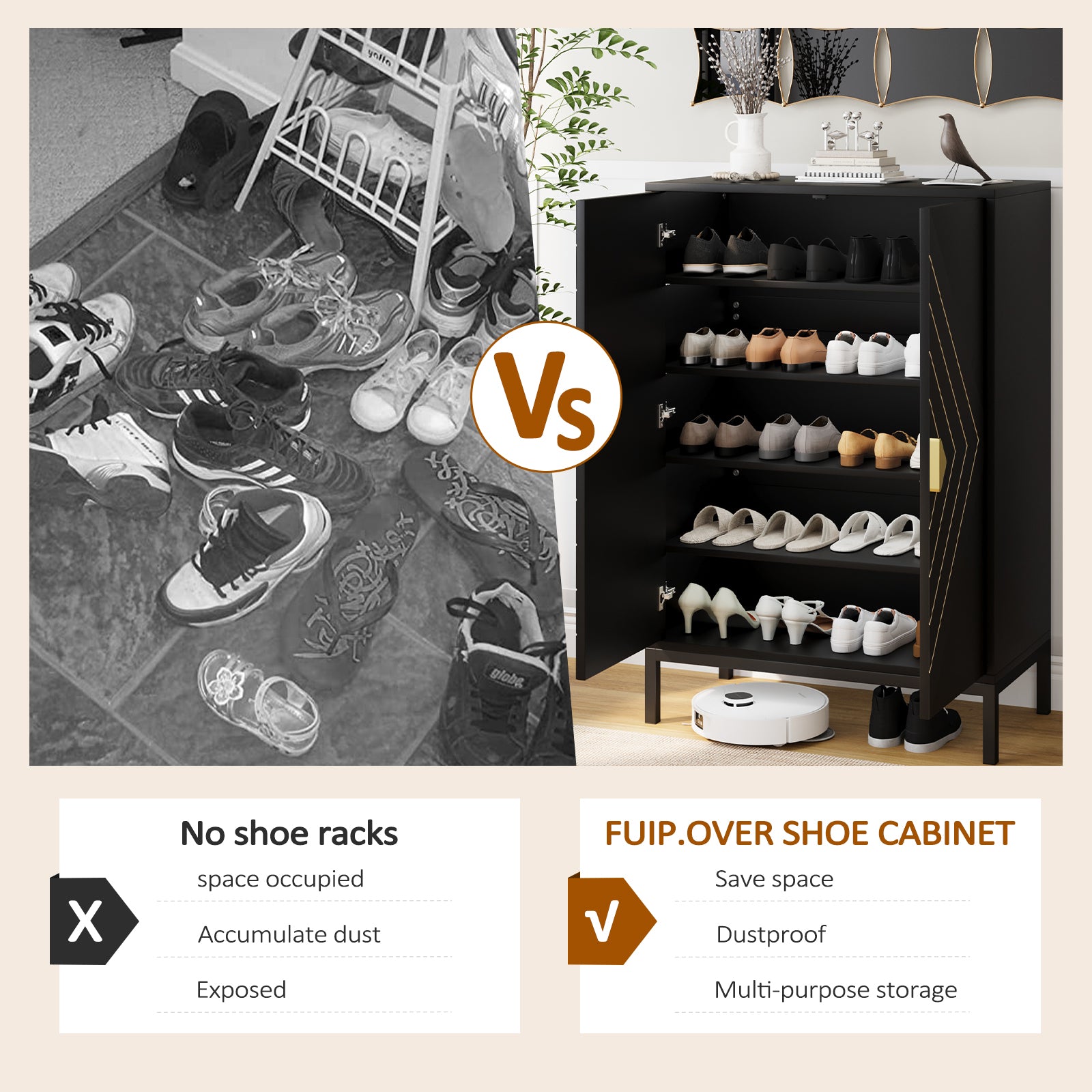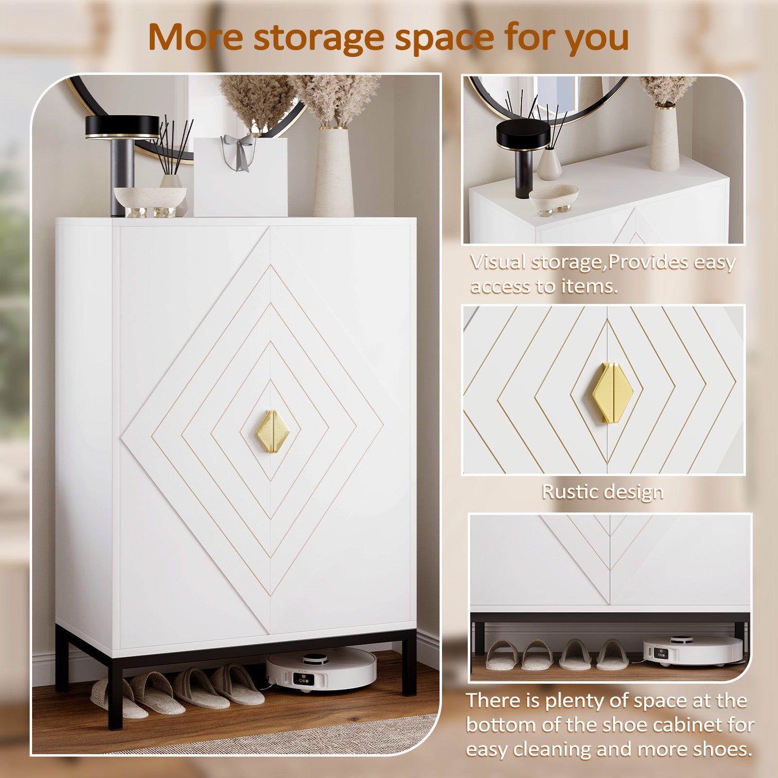 Modern Shoe Cabinet with Diamond Doors & Gold Pulls - Hidden Shoe Storage for Entryway Elevate your entryway with this chic and functional modern shoe cabinet. Its unique diamond-patterned doors and luxe gold pulls instantly add style while keeping shoe clutter out of sight. With 4 adjustable shelves, this high-capacity cabinet fits 20+ pairs of shoes, accommodating everything from sneakers to boots. Made from heavy-duty MDF with sturdy metal legs, it’s built to last and provides space for a robot vacuum to clean underneath. It’s a stylish and space-saving solution for any modern home.