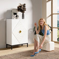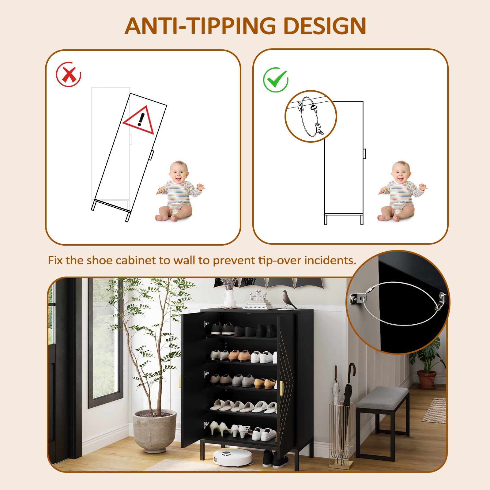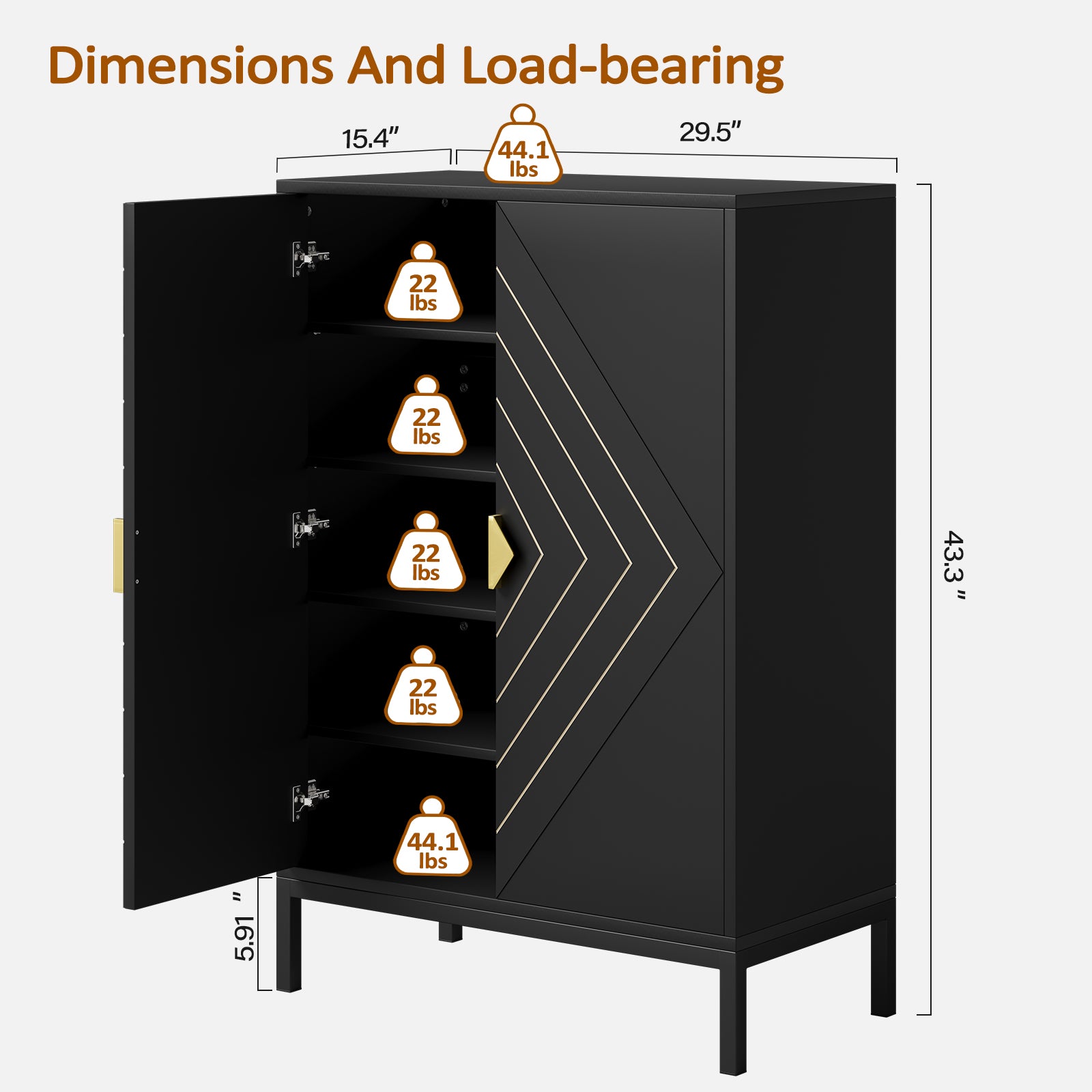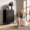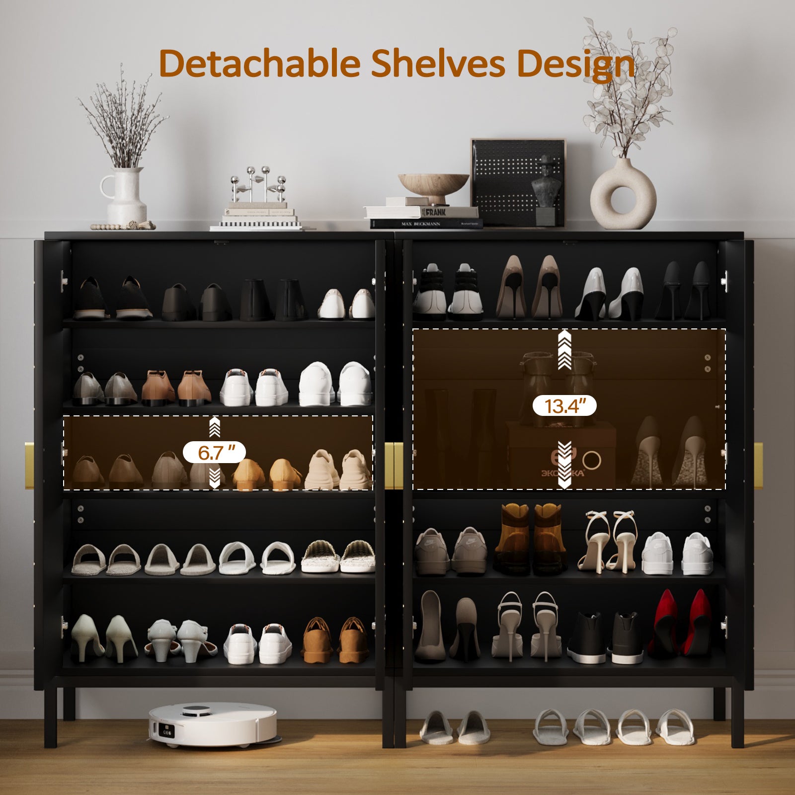 Modern Shoe Cabinet with Diamond Doors & Gold Pulls - Hidden Shoe Storage for Entryway Elevate your entryway with this chic and functional modern shoe cabinet. Its unique diamond-patterned doors and luxe gold pulls instantly add style while keeping shoe clutter out of sight. With 4 adjustable shelves, this high-capacity cabinet fits 20+ pairs of shoes, accommodating everything from sneakers to boots. Made from heavy-duty MDF with sturdy metal legs, it’s built to last and provides space for a robot vacuum to clean underneath. It’s a stylish and space-saving solution for any modern home.