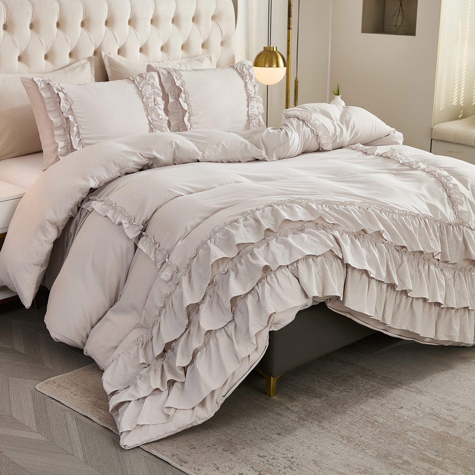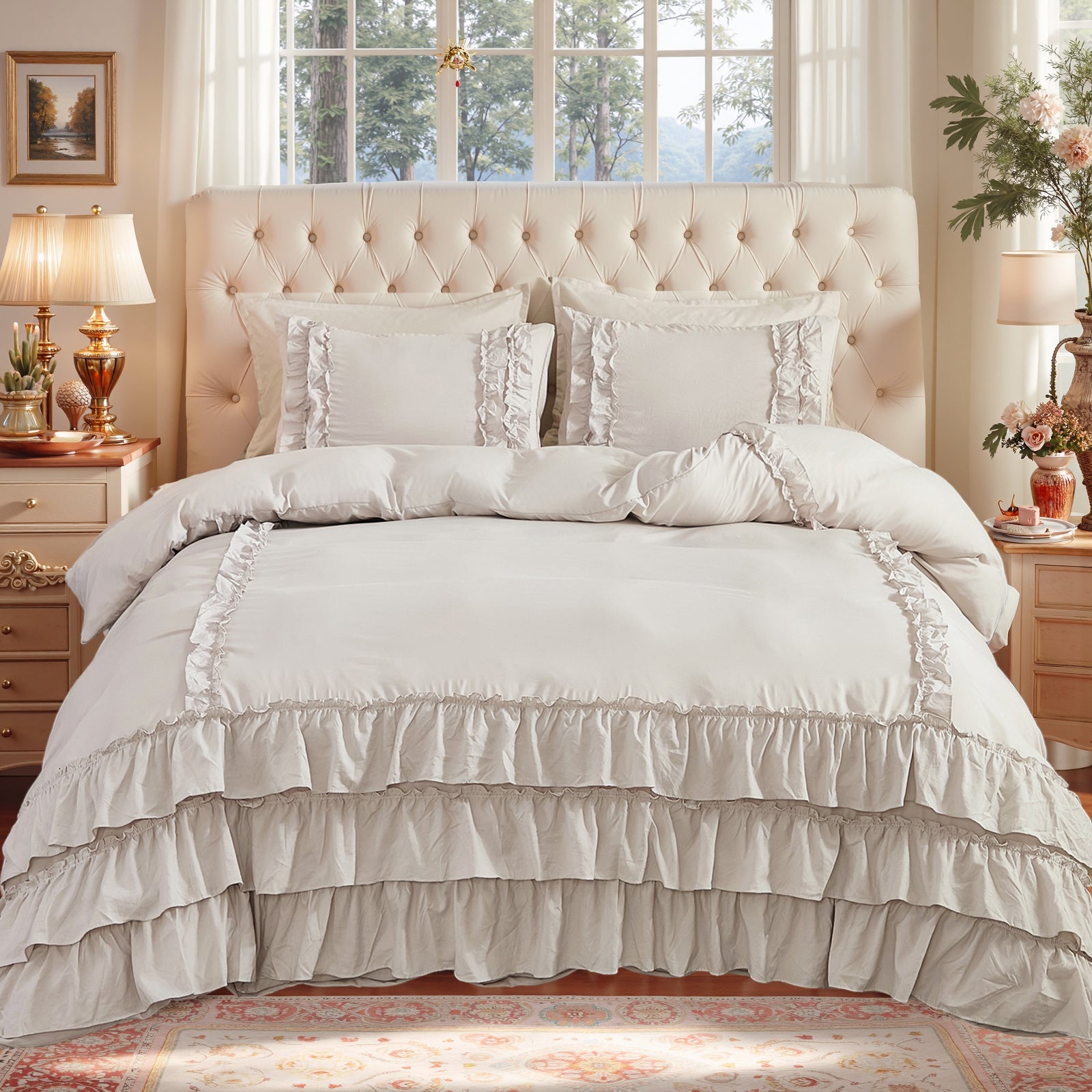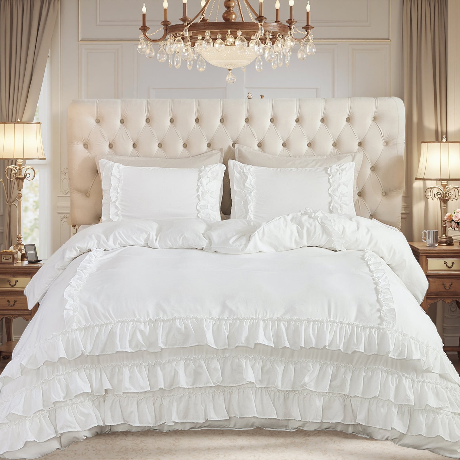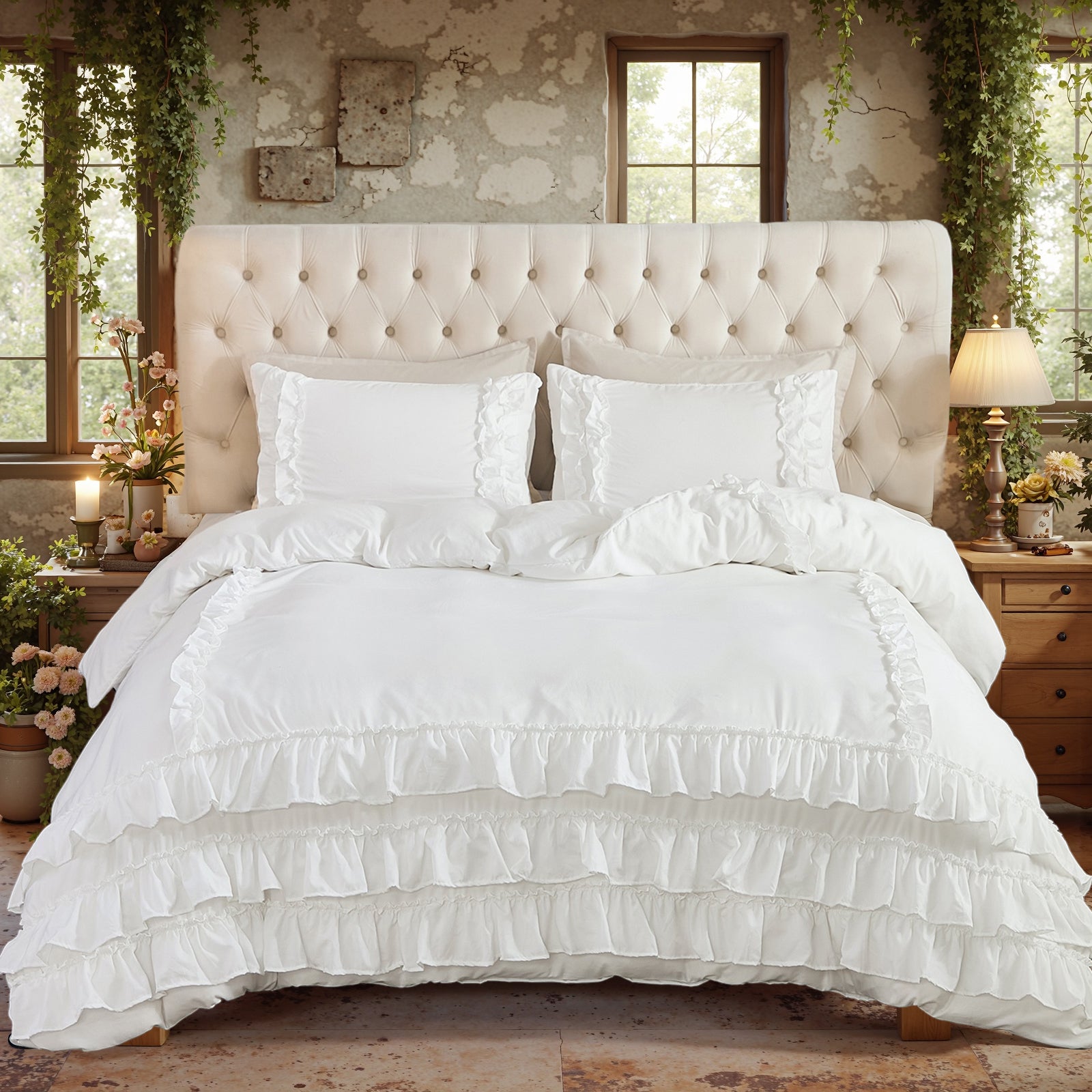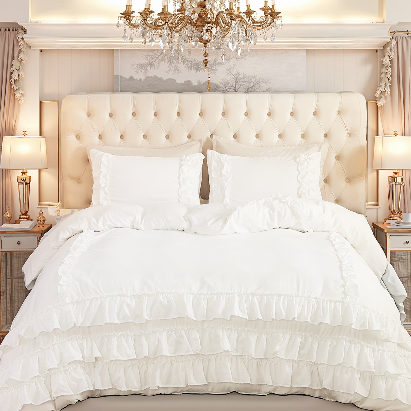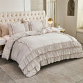 Bring timeless elegance to your bedroom with the Waterfall Ruffle Comforter Set, featuring a romantic multi-layer ruffle design. Perfect for shabby chic, farmhouse, or French country décor, this set adds softness and sophistication to any space.