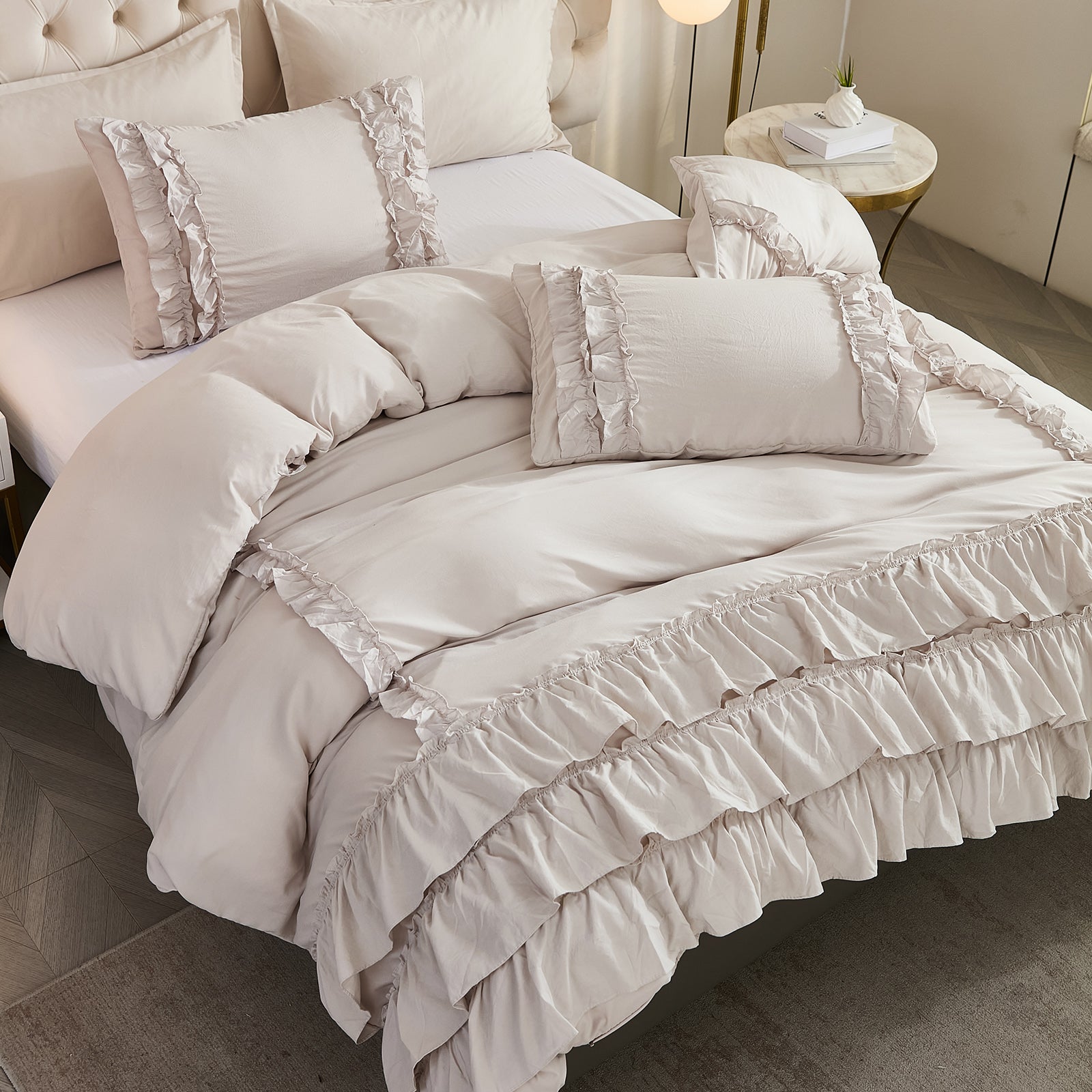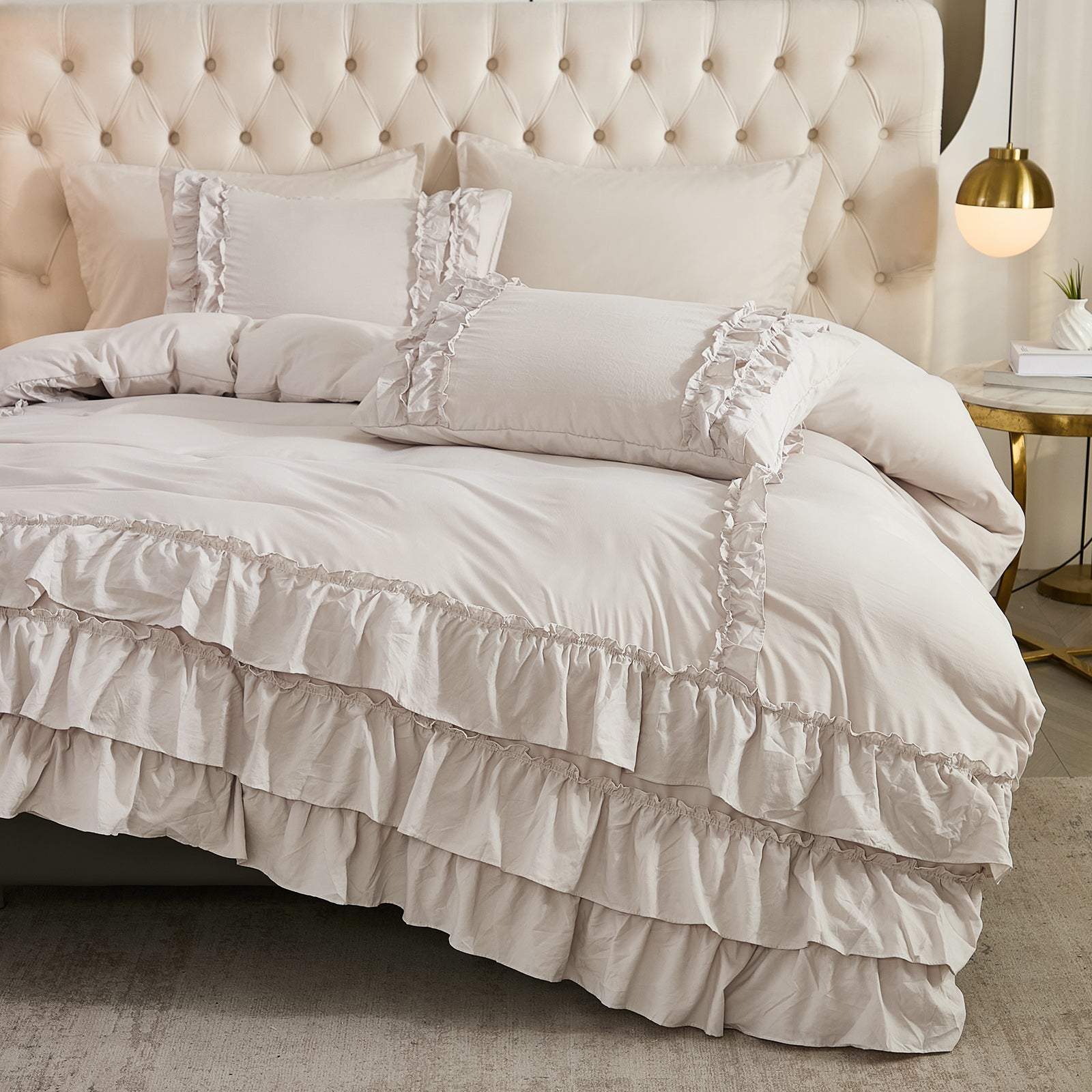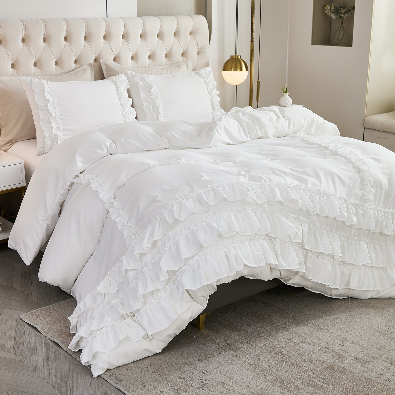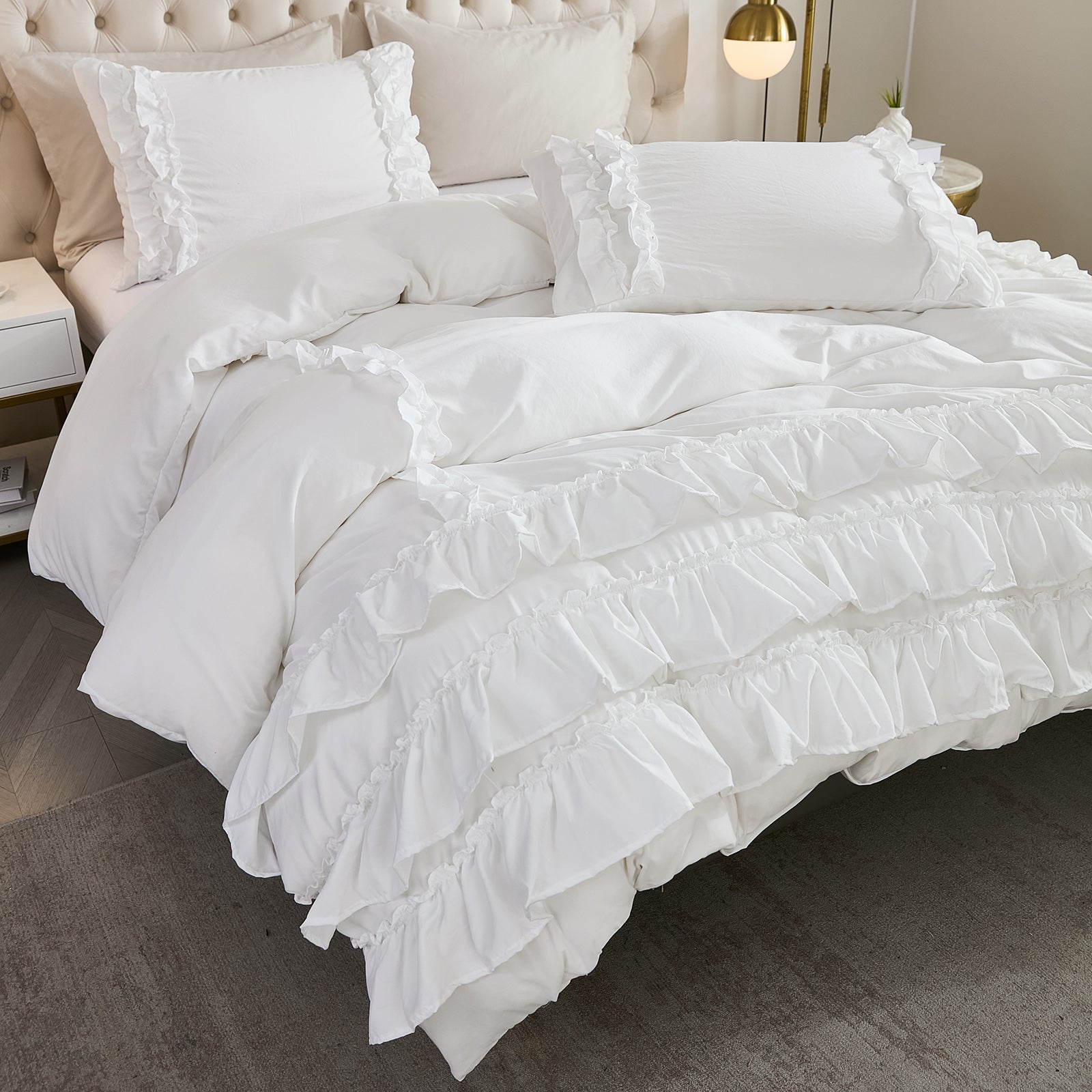 Bring timeless elegance to your bedroom with the Waterfall Ruffle Comforter Set, featuring a romantic multi-layer ruffle design. Perfect for shabby chic, farmhouse, or French country décor, this set adds softness and sophistication to any space.