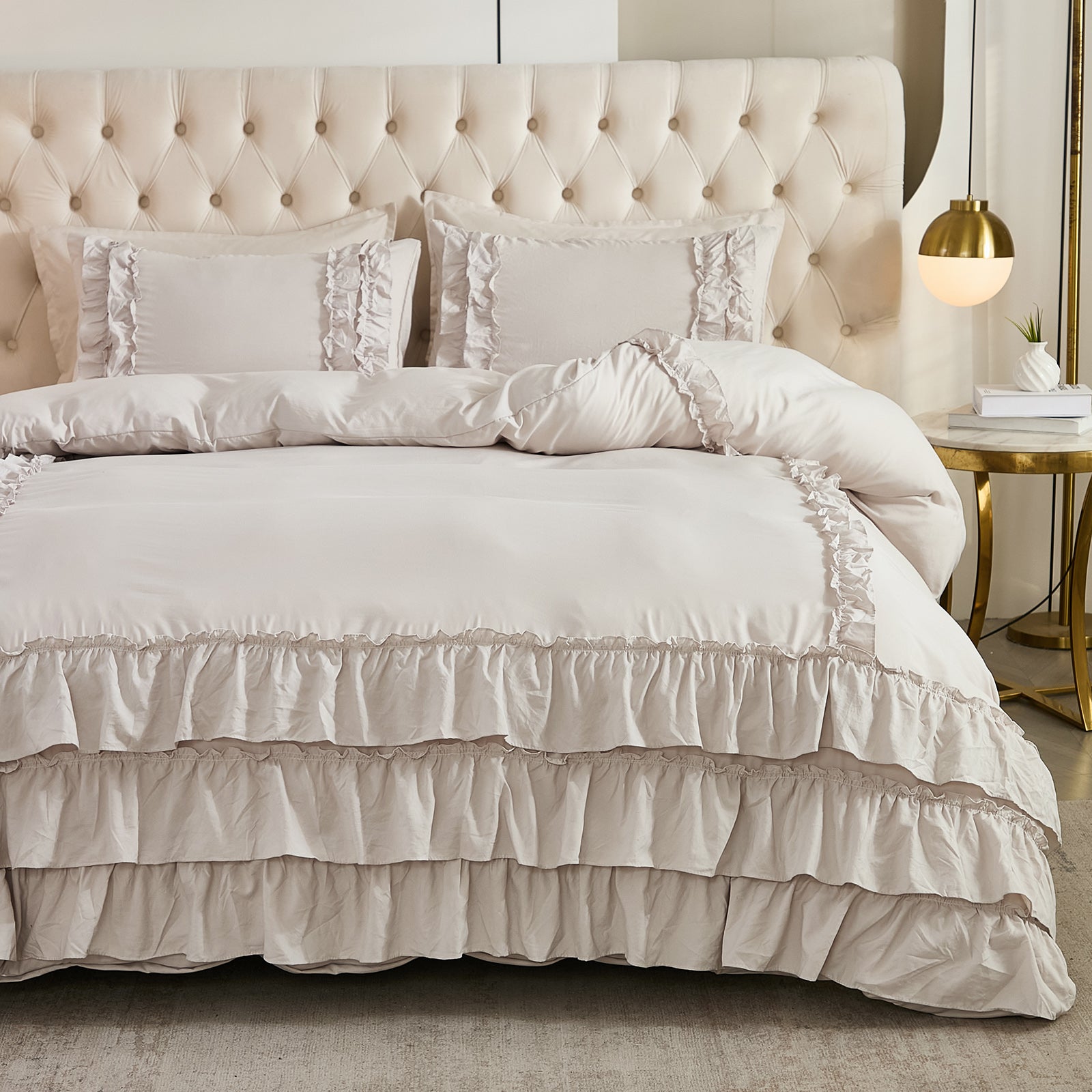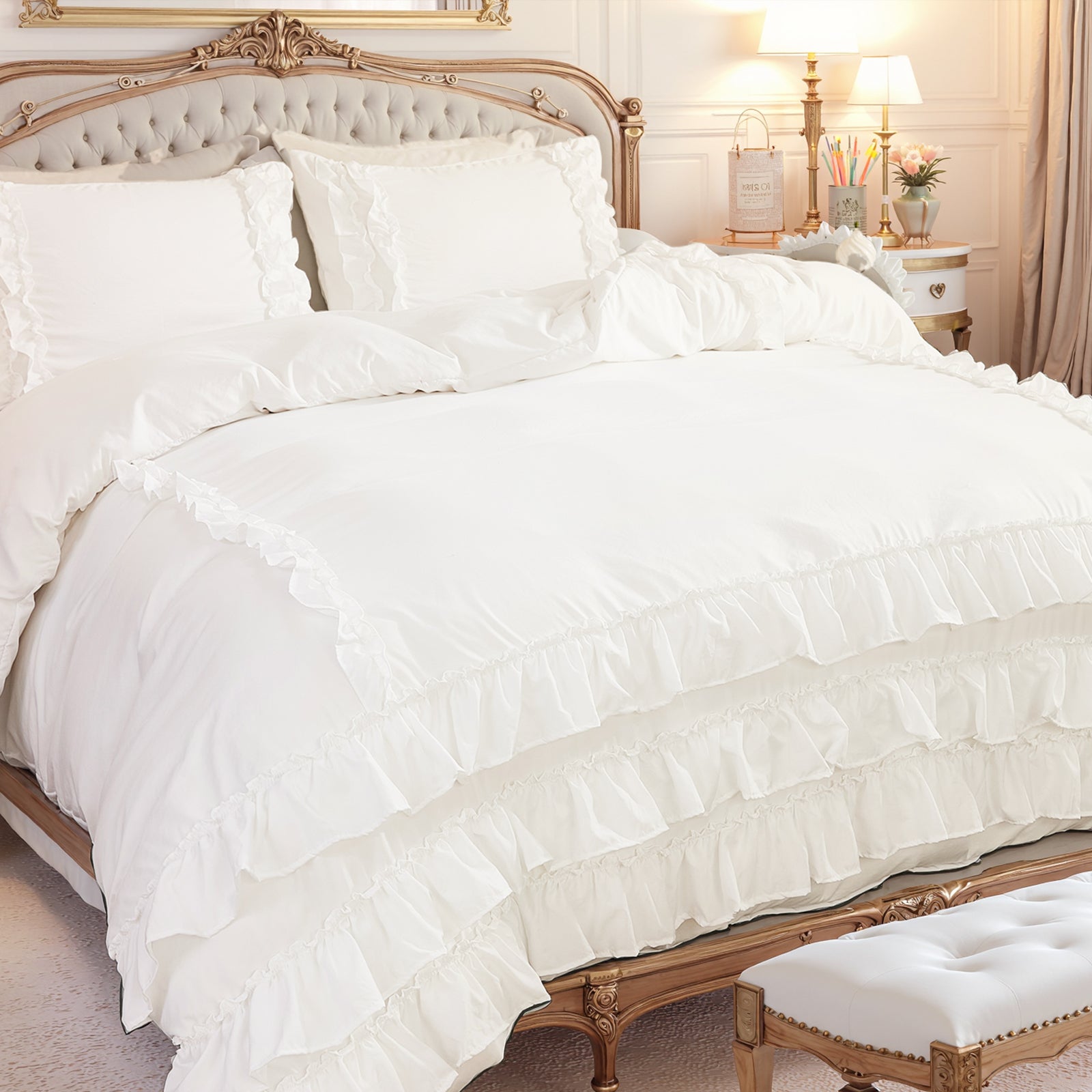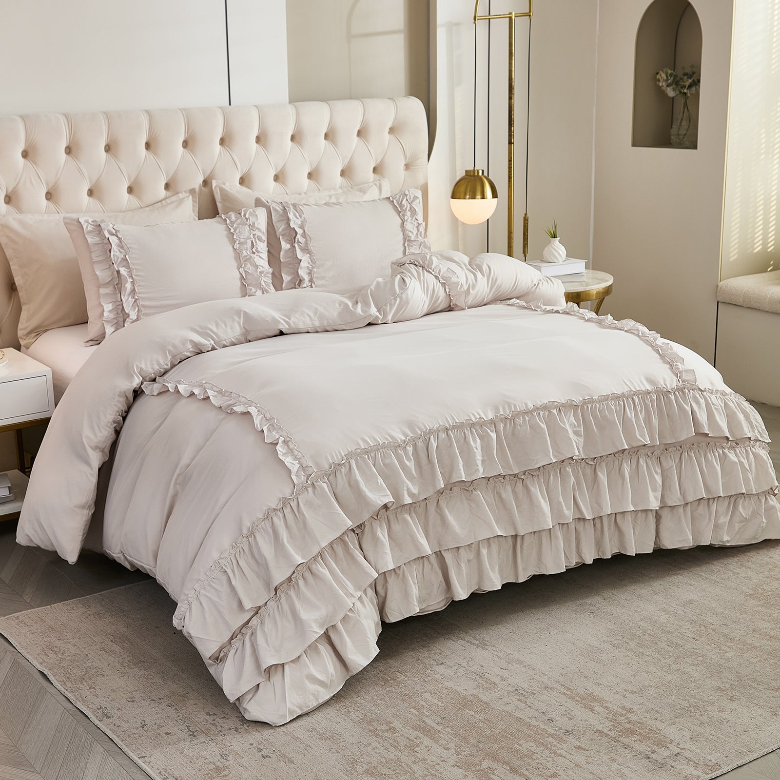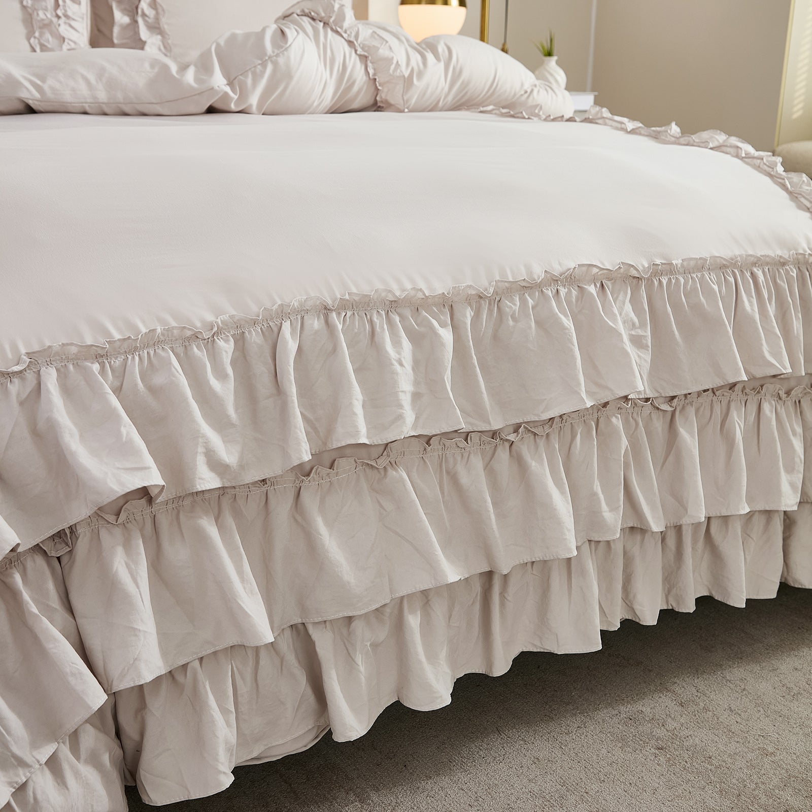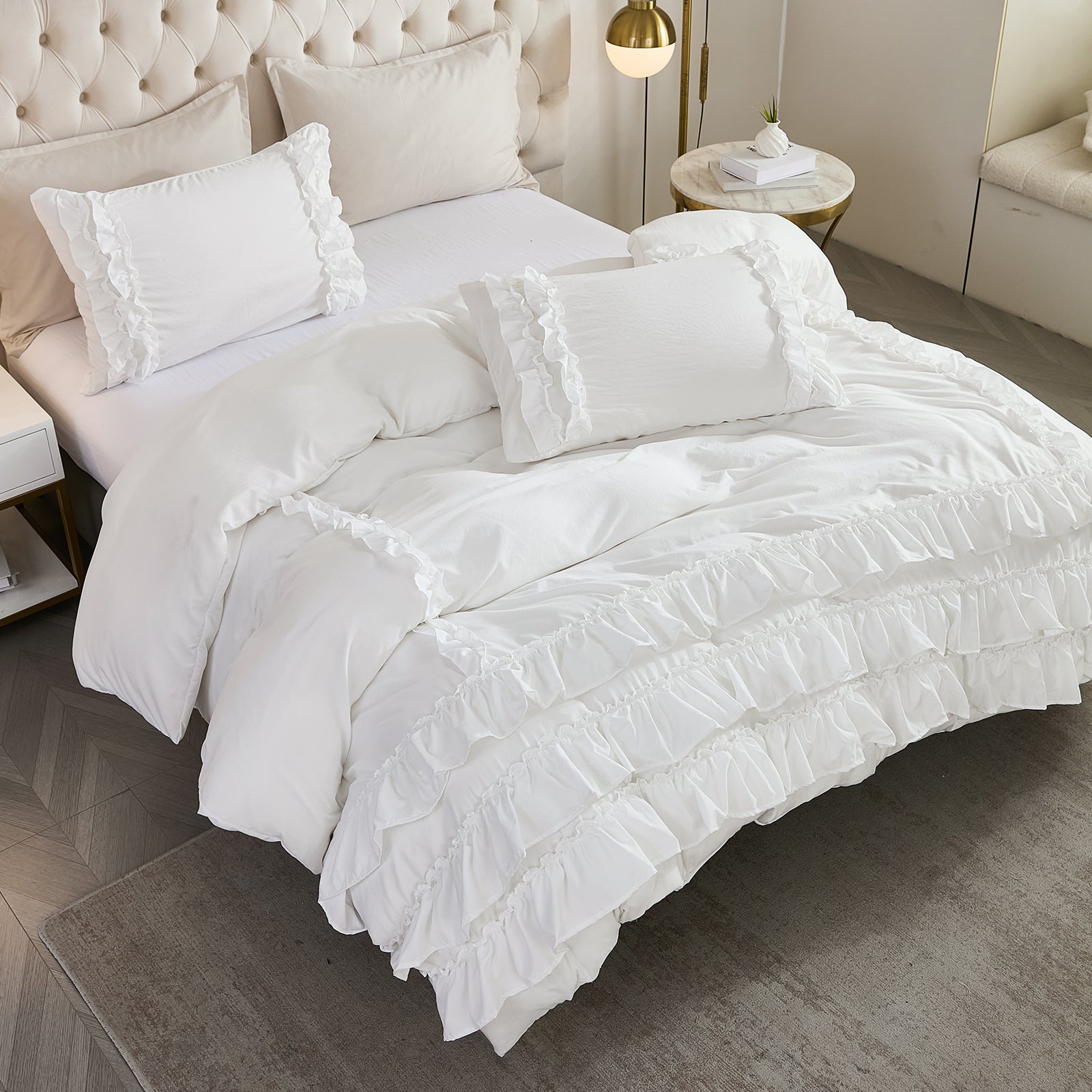 Bring timeless elegance to your bedroom with the Waterfall Ruffle Comforter Set, featuring a romantic multi-layer ruffle design. Perfect for shabby chic, farmhouse, or French country décor, this set adds softness and sophistication to any space.